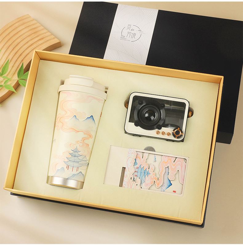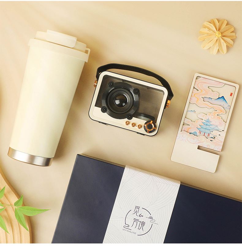 1.觅芳境--双饮咖啡杯 容量:500ml 内胆:316 外壳:304 杯盖:食品级PP 吸管:食品级硅胶 吸嘴:食品级PP 密封圈:食品级硅胶 2.琉璃蓝牙音响 蓝牙5.2方案,5W功率,续航6小时; 自由选择蓝牙 / TWS对联 / 插卡 / 等播放模式 3.手机支架 140*70*6MM 礼盒尺寸:34*25.5*10cm 手提袋尺寸:35*26.5*11cm