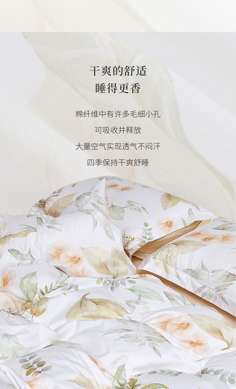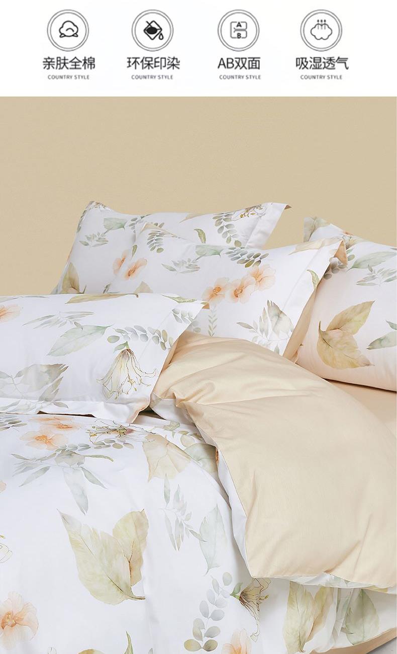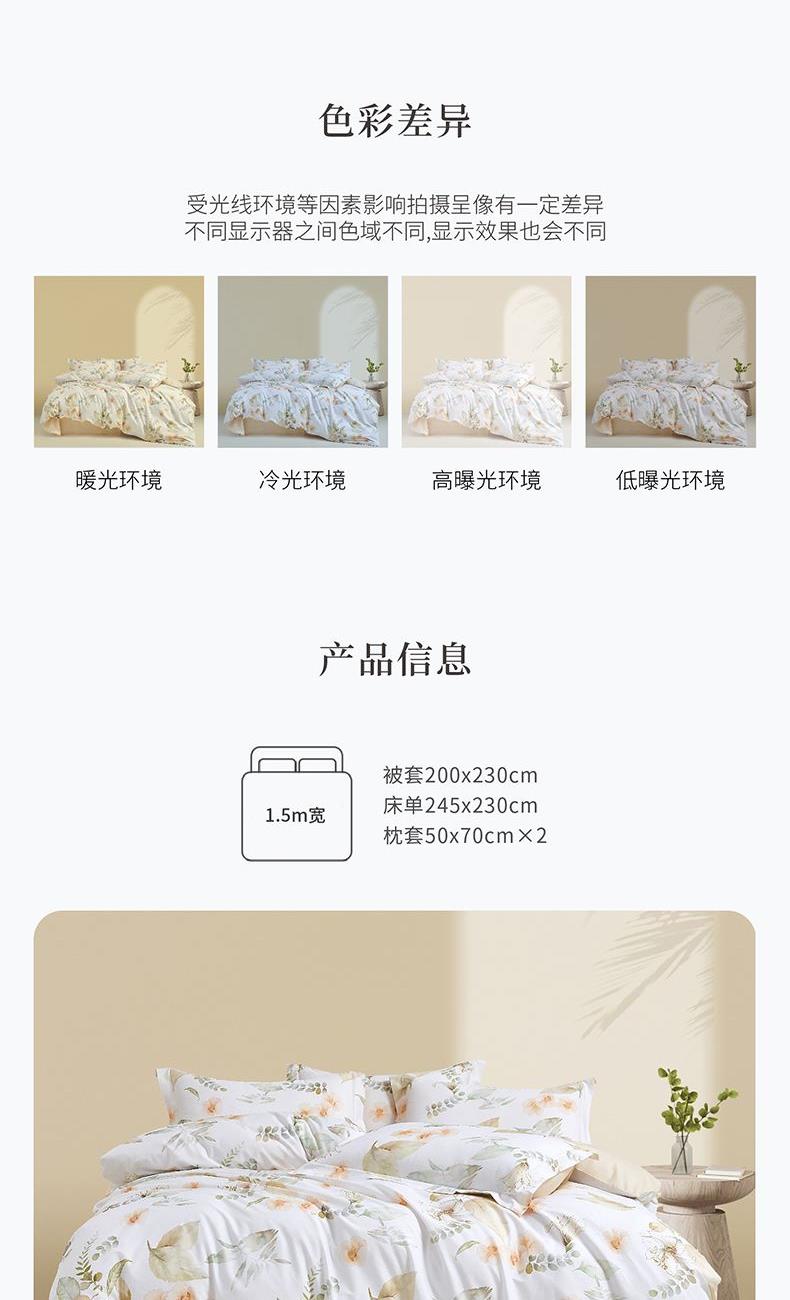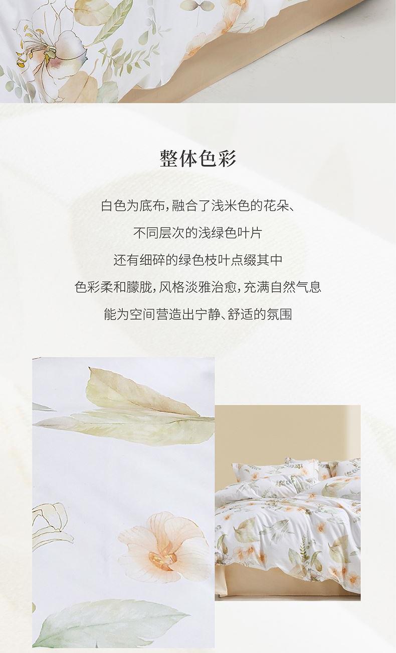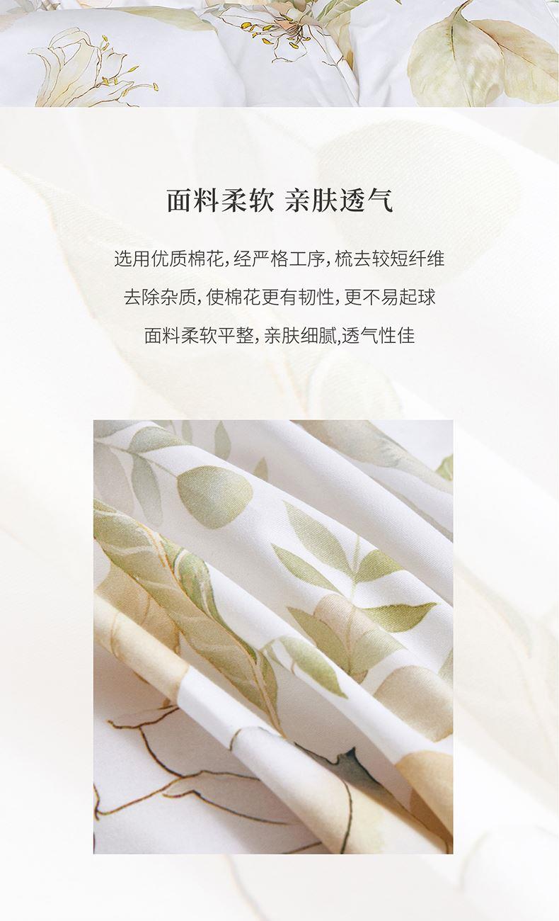 面 料:棉 尺 寸:被套:200×230cm 床单:245×230cm 短枕:50×70cm×2 整体色彩:白色为底布,融合了浅米色的花朵、不同层次的浅绿色叶片(,还有细碎的绿色枝叶点缀其中。色彩柔和朦胧,风格淡雅,充满自然气息,能为空间营造出宁静、舒适的氛围。 面料:选用优质棉花,经严格工序,梳去较短纤维,去除杂质,使棉花更有韧性,更不易起球。面料柔软平整,亲肤细腻,透气性佳。 工艺:精简的四件套组合,短枕大气。