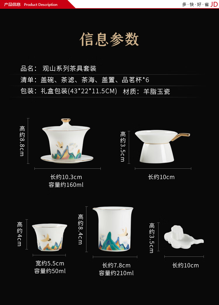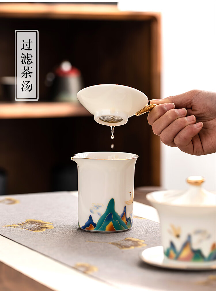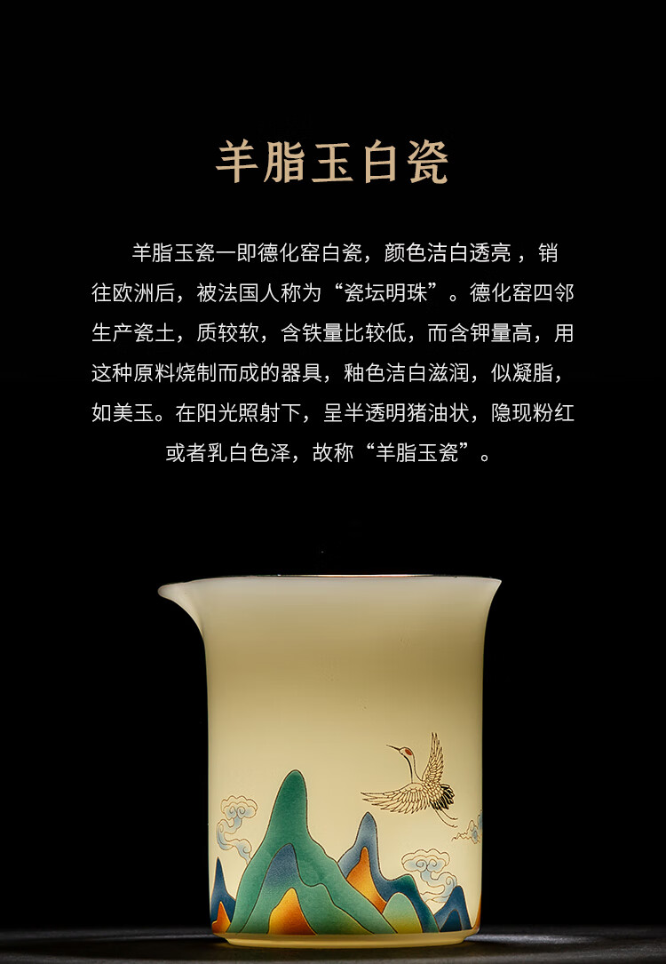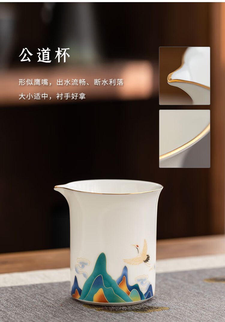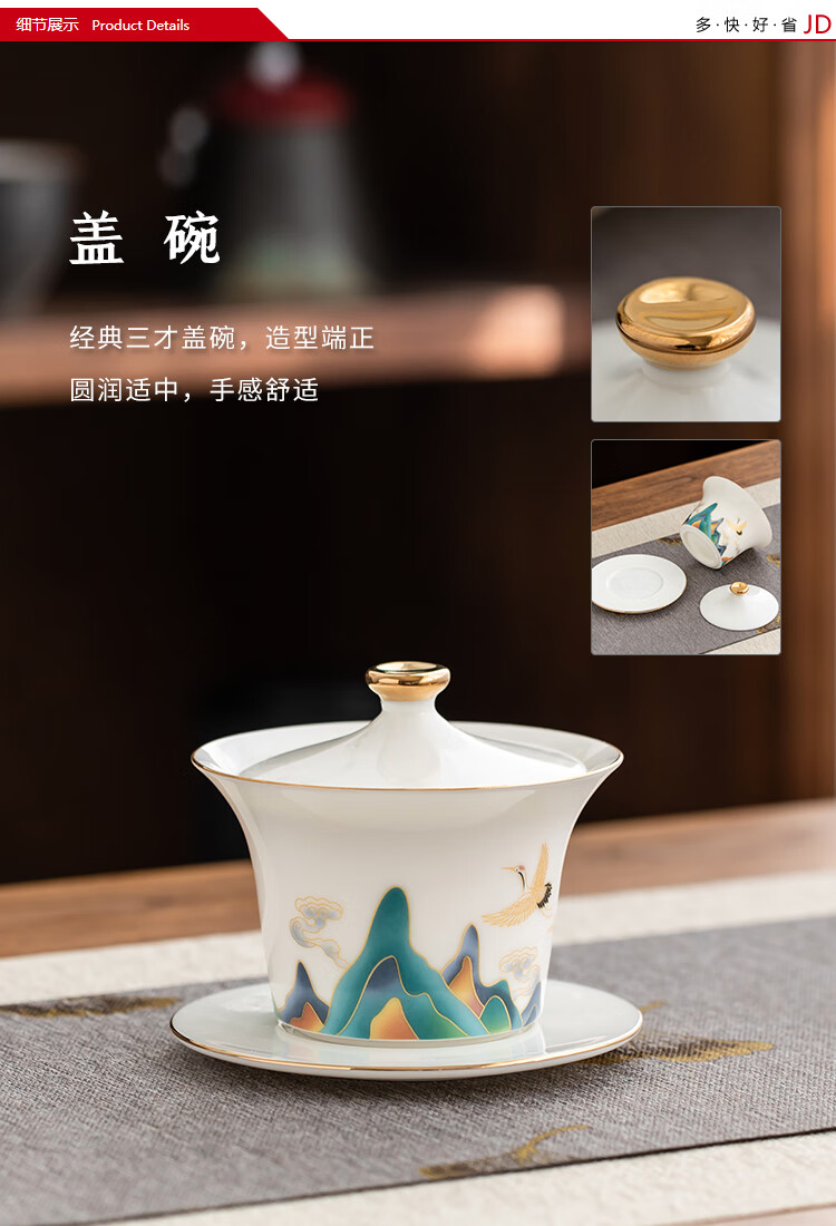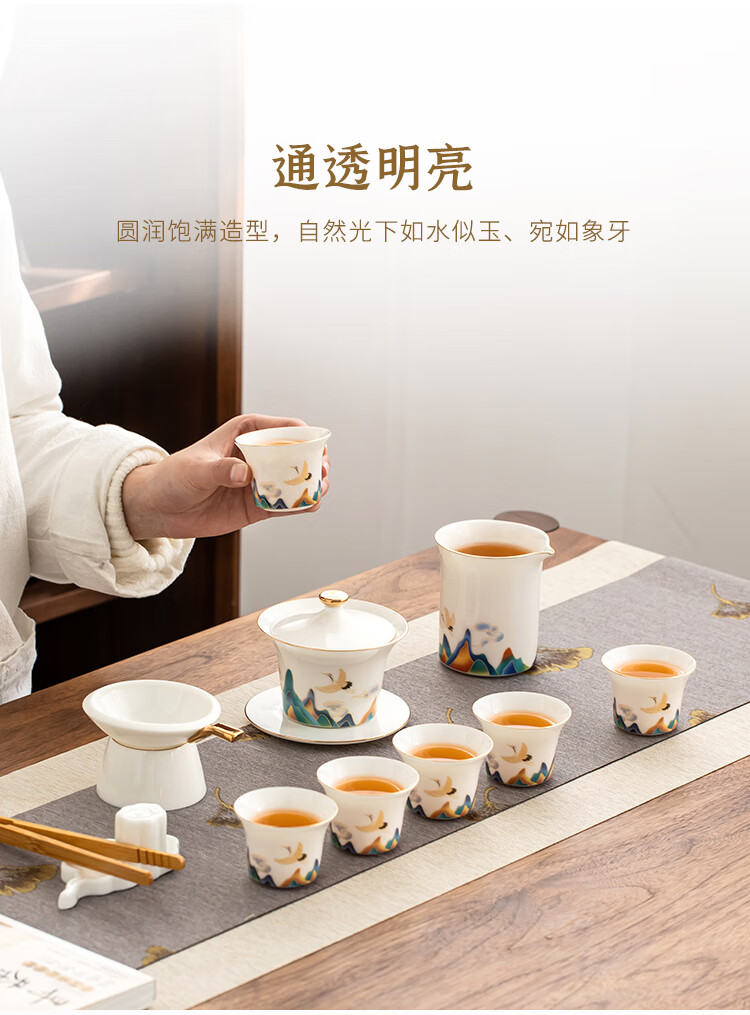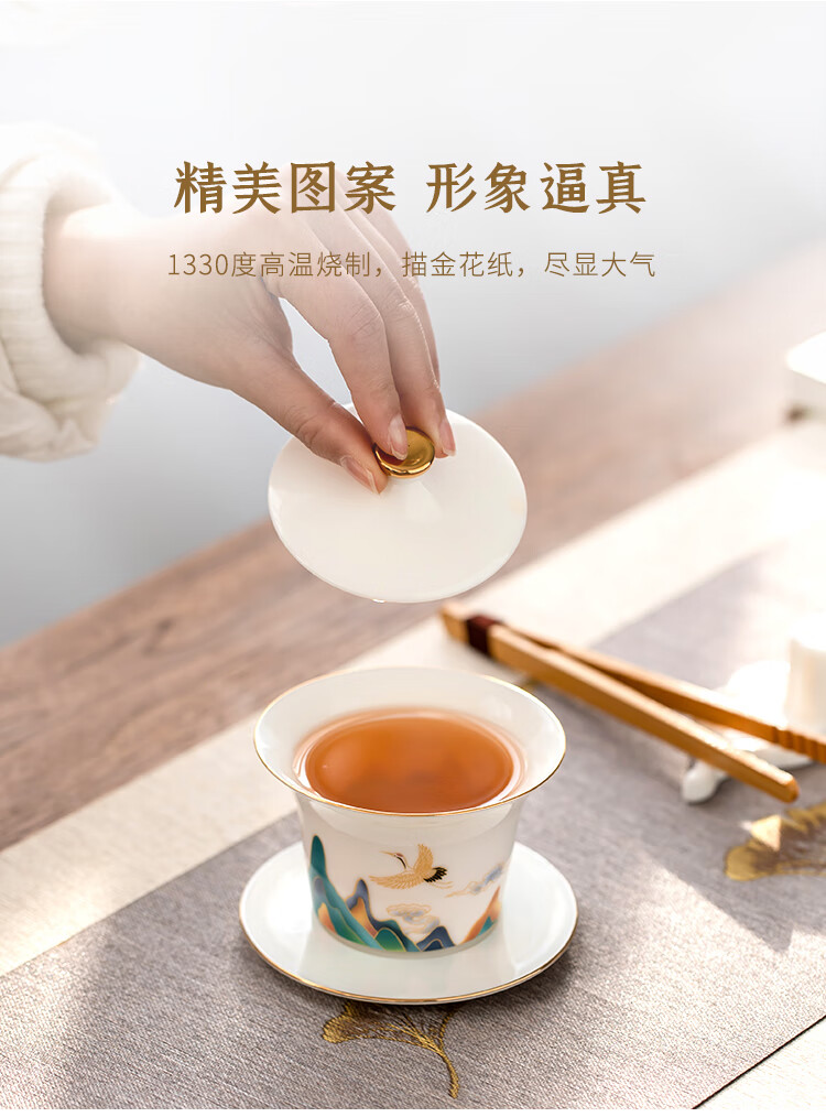 羊脂玉白瓷 全手工描金工艺 国潮新国风 尽显东方气韵 传统工艺 高温窑烧 器型别致 甄选好礼 材质 羊脂玉瓷 工艺 高温窑烧 烤花 风格 中式国风 配置清单 盖碗*1 茶漏*1 公道杯*1 茶夹*1 盖置*1 茶杯*6