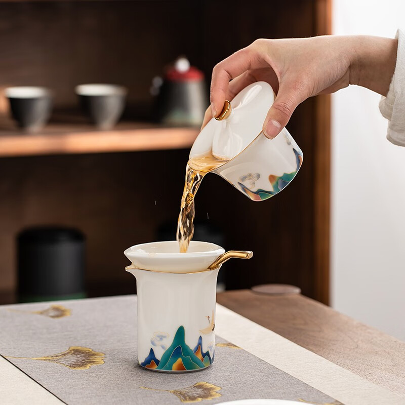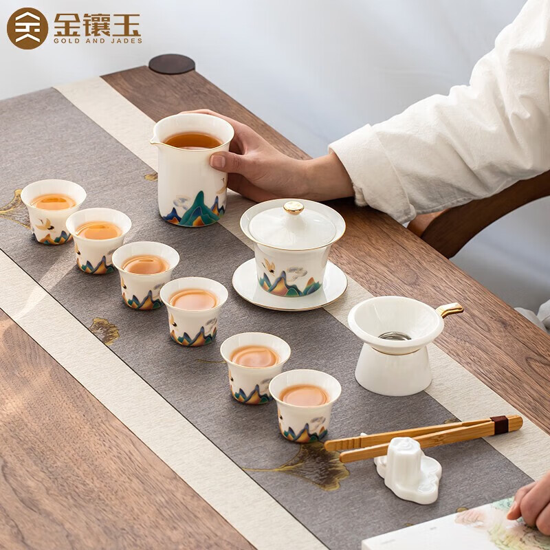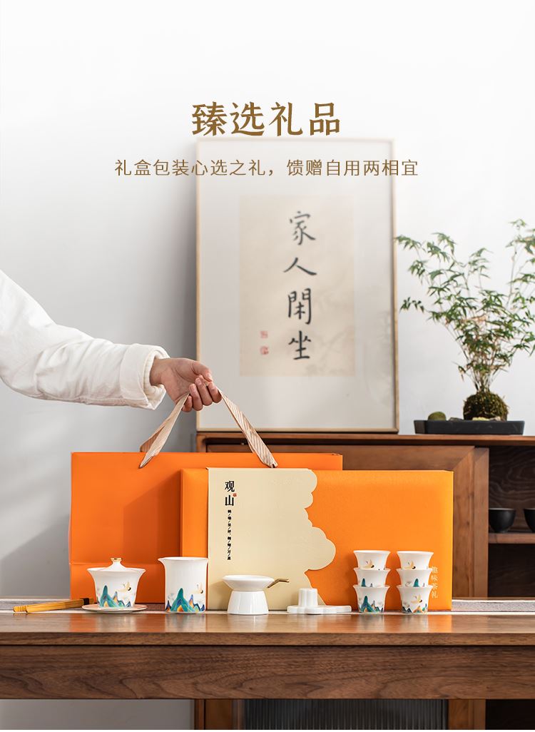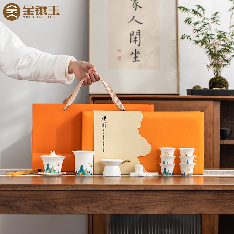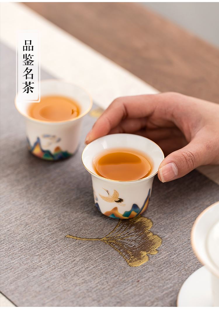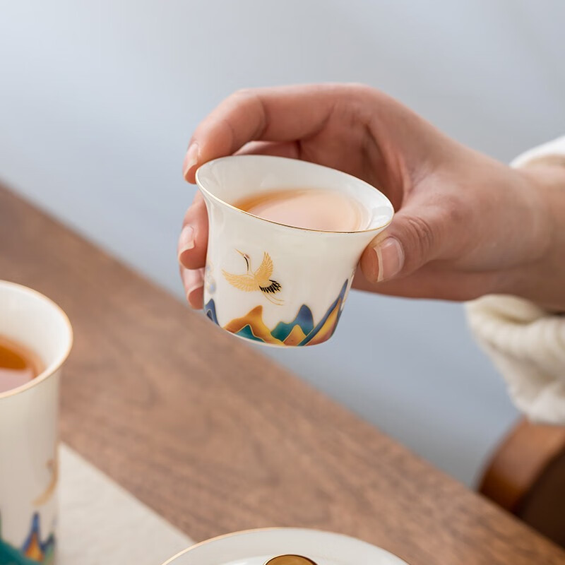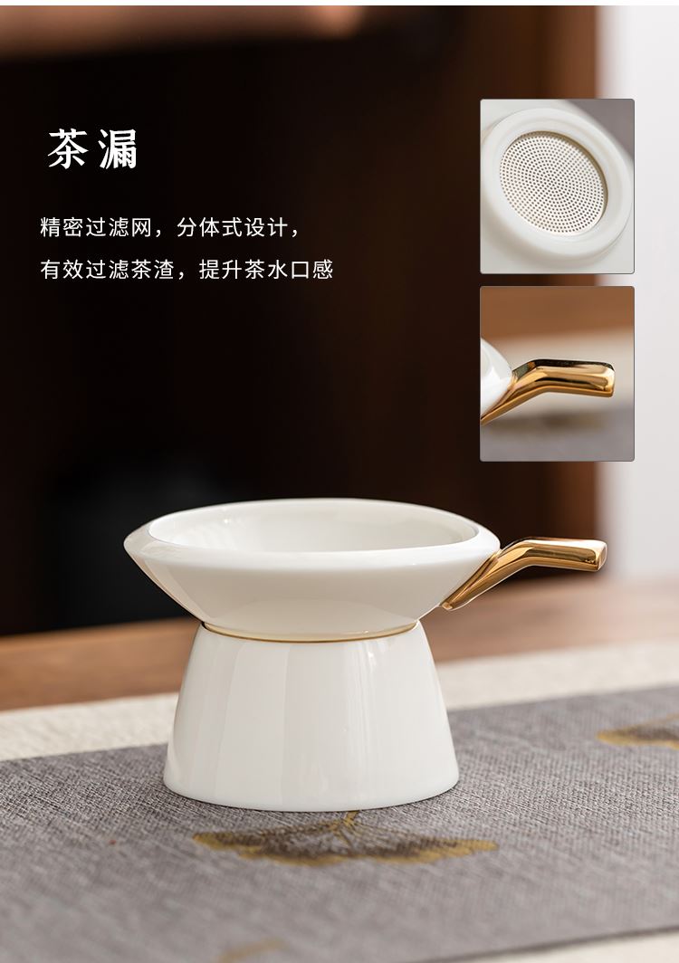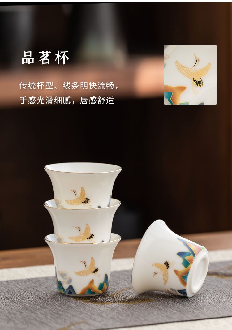羊脂玉白瓷 全手工描金工艺 国潮新国风 尽显东方气韵 传统工艺 高温窑烧 器型别致 甄选好礼 材质 羊脂玉瓷 工艺 高温窑烧 烤花 风格 中式国风 配置清单 盖碗*1 茶漏*1 公道杯*1 茶夹*1 盖置*1 茶杯*6
