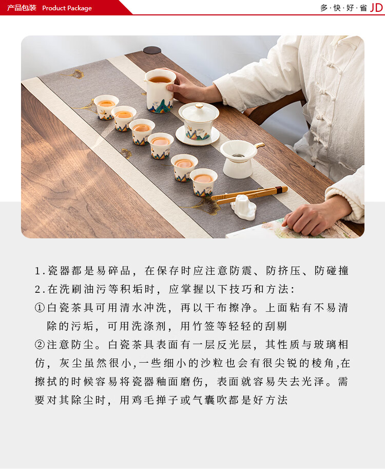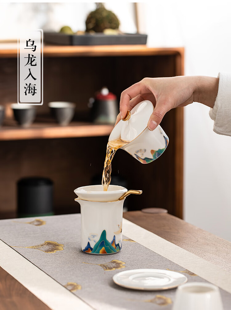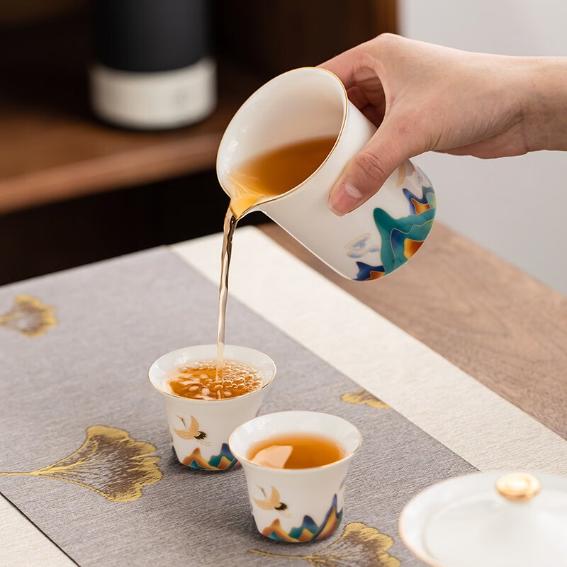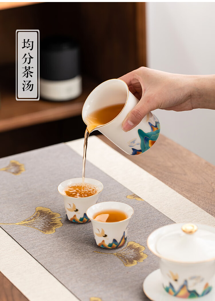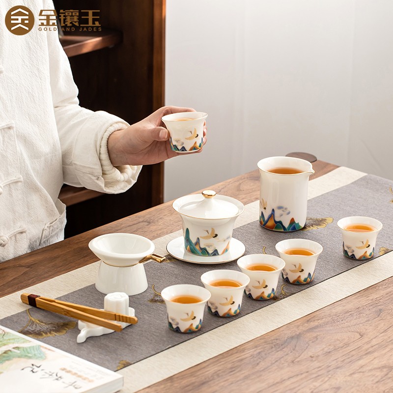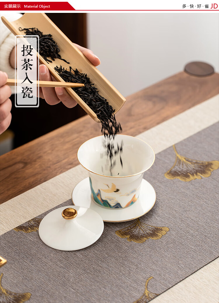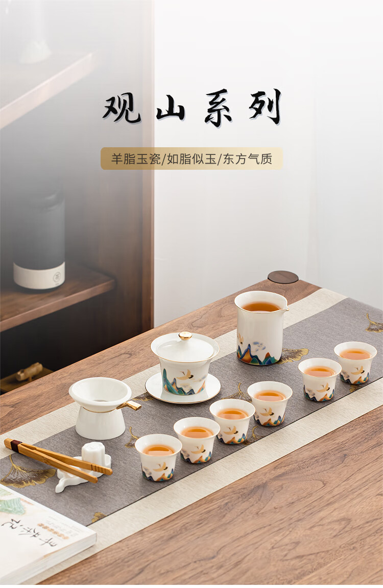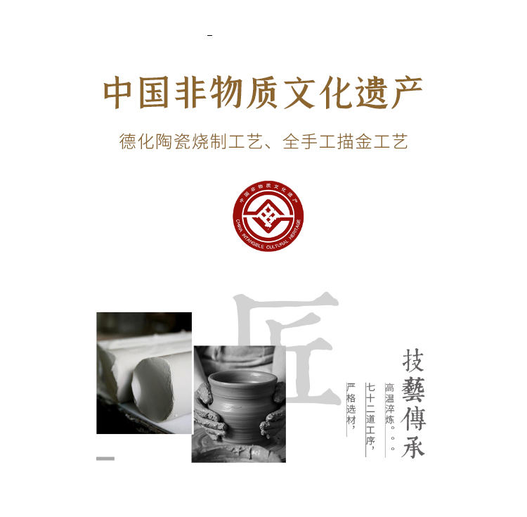 羊脂玉白瓷 全手工描金工艺 国潮新国风 尽显东方气韵 传统工艺 高温窑烧 器型别致 甄选好礼 材质 羊脂玉瓷 工艺 高温窑烧 烤花 风格 中式国风 配置清单 盖碗*1 茶漏*1 公道杯*1 茶夹*1 盖置*1 茶杯*6