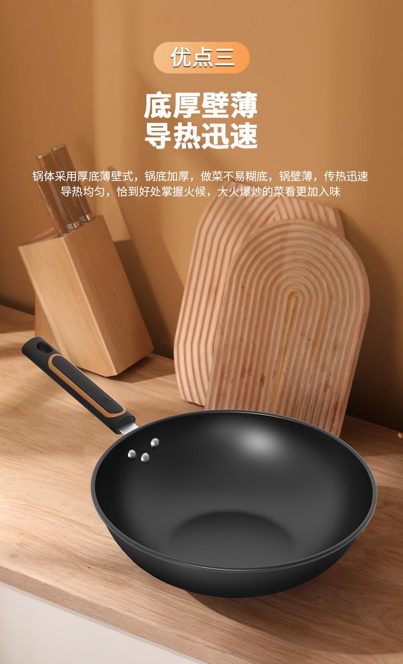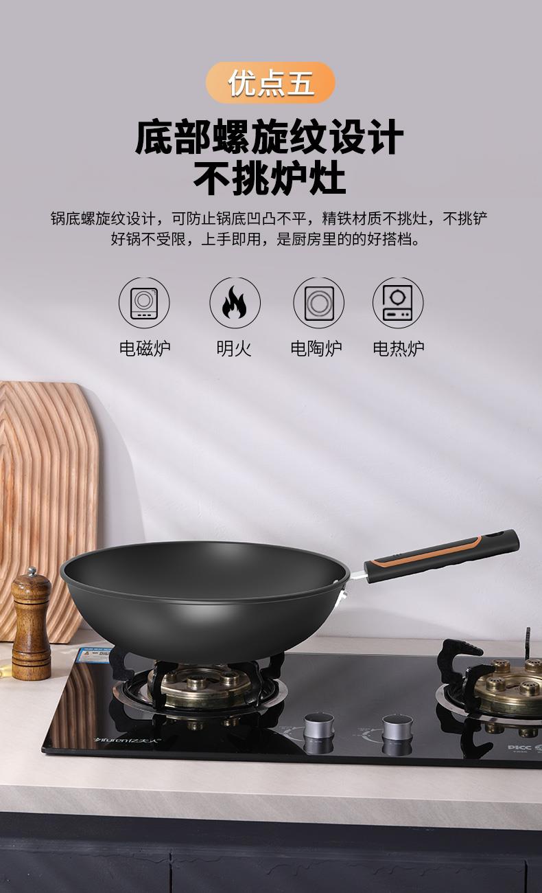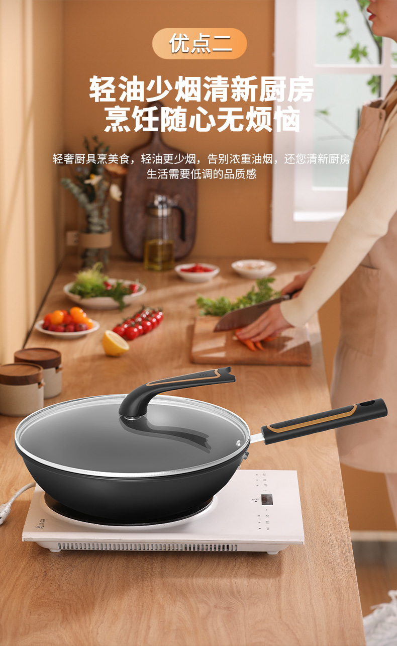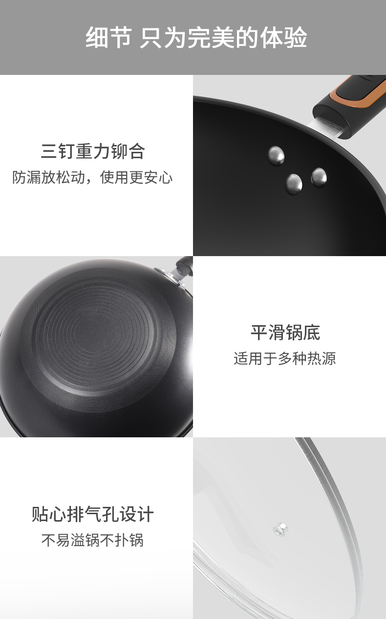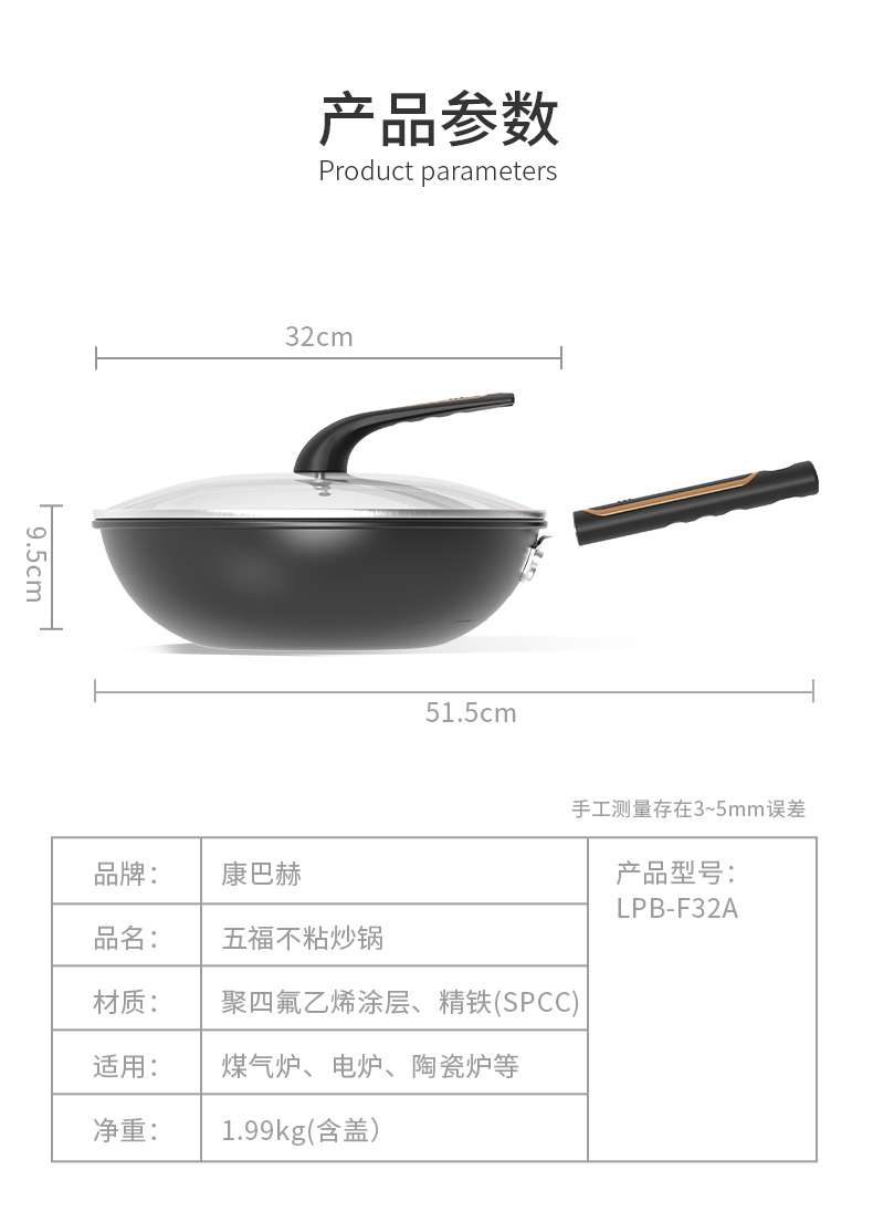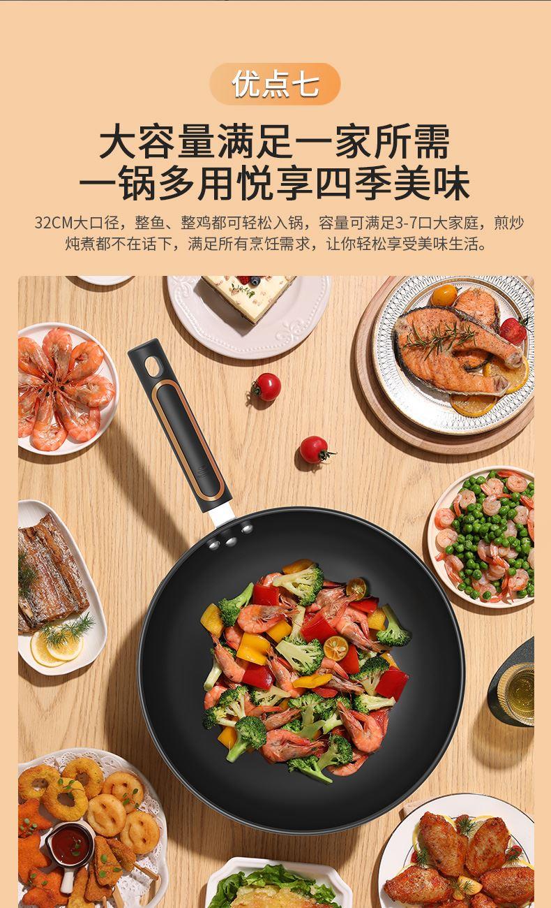 规格:32cm 重量:1.99kg(含盖) 包装尺寸:52*35*73cm ◎高颜耐用,将实用与美感相融合。导热性能强,导热速度快,轻松翻炒—道菜,省时又省力。 ◎翻炒不易粘,爆炒更随心。翻炒不易粘,在少油甚至是无油的条件下,都可以达到不易粘的效果,轻松翻面,爆炒随心,让烹饪更简单。 ◎实力烹饪,畅享轻油生活。优质精铁基材,健康不粘技术,少油即可烹饪。煎蛋、摊饼、炒时蔬、煎炒两用、样样拿手,尽情玩转厨房美味。 ◎金属卷边工艺,有效密封不易变形。利用卷边工艺的优点,保证锅体焊接的紧密性,有效平衡锅内气压,防止锅体变形,做您居家生活的好伙伴。 ◎一体成型,储热更持久。锅体一体成型,储热效果持久,提高加热效率,经过细火慢炖,充分释放出食材的原汁原味,更快焖出鲜嫩的口感。