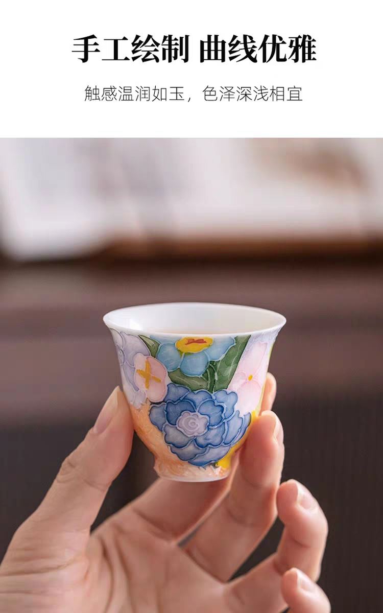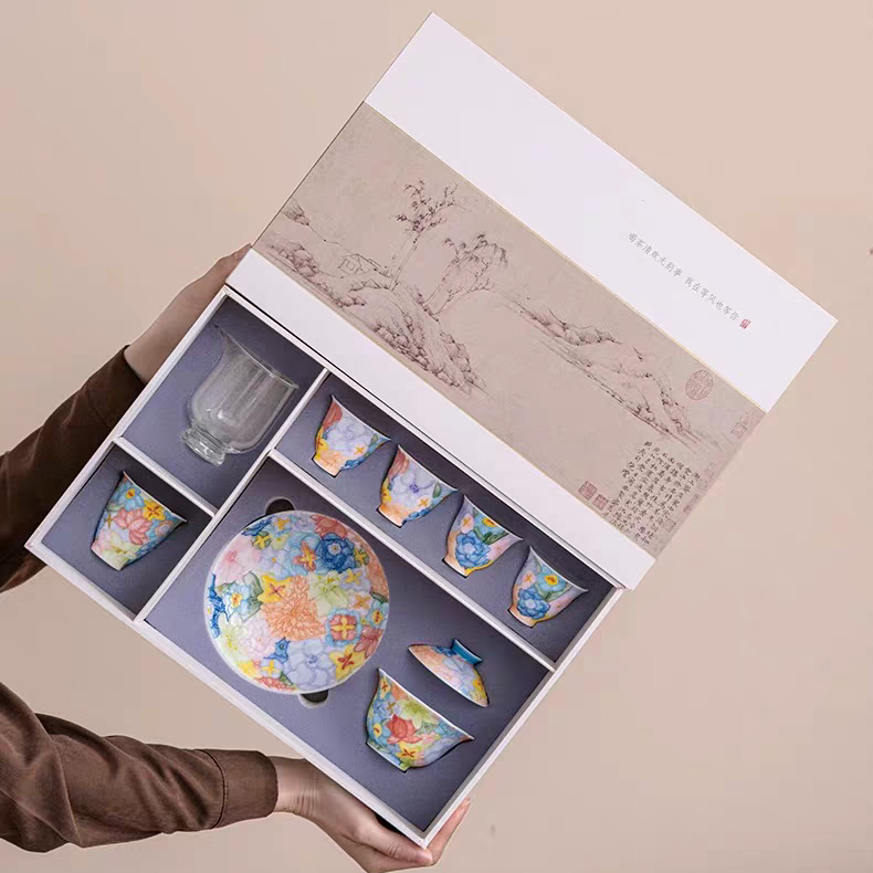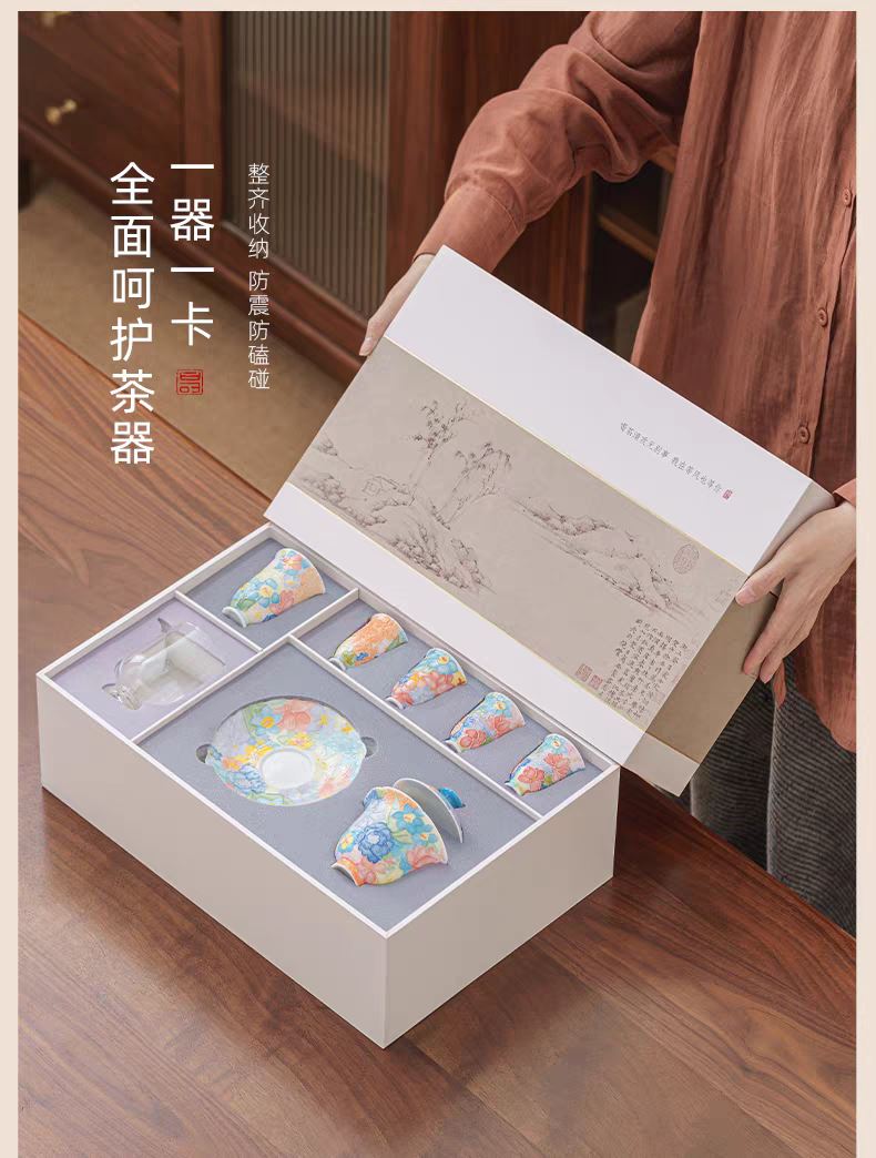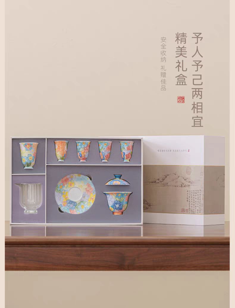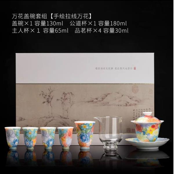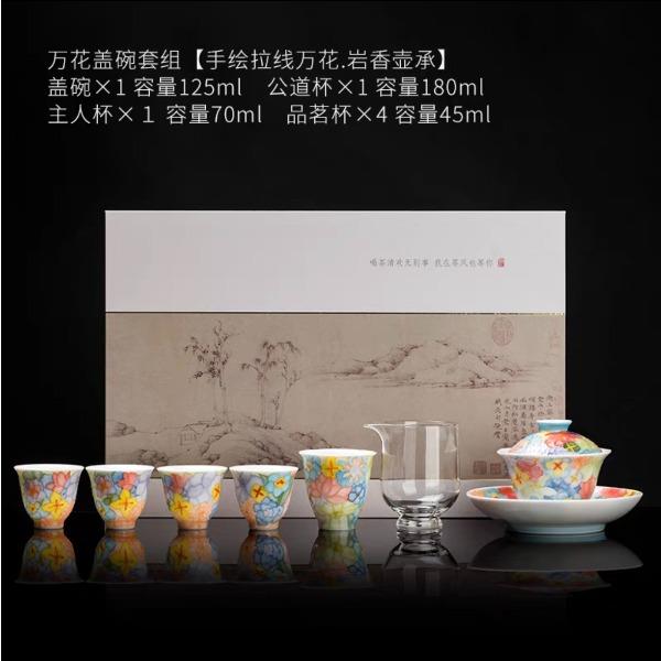 配置一:岩香盖碗:9*8.8cm,容量125ml , 岩香茶 杯:4.8*5.6cm 容量 45ml, 岩香主人杯:6.3cm*6cm 容量 70ml , 岩香壶承:14.3*14.3cm,高度 3cm。 公道杯: 6.3cm*8.8cm 容量 175ml(满杯容量), 礼 盒:38.5*25.5*12.5cm。 配置二:万花盖碗:8*9.7*12cm 容量130ml, 万花茶杯:5.7*4.4cm 容量30ml, 万花主人杯:7.3*5.6cm 容量65ml, 公道杯: 6.3cm*8.8cm 容量 175ml(满杯容量), 礼 盒:38.5*25.5*12.5cm。