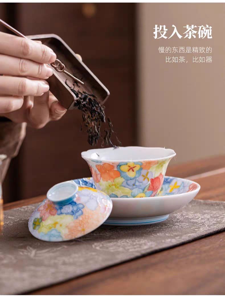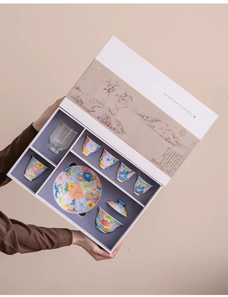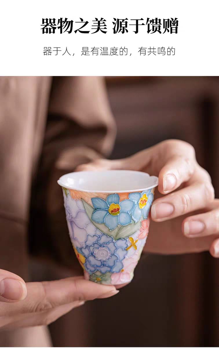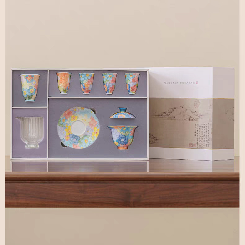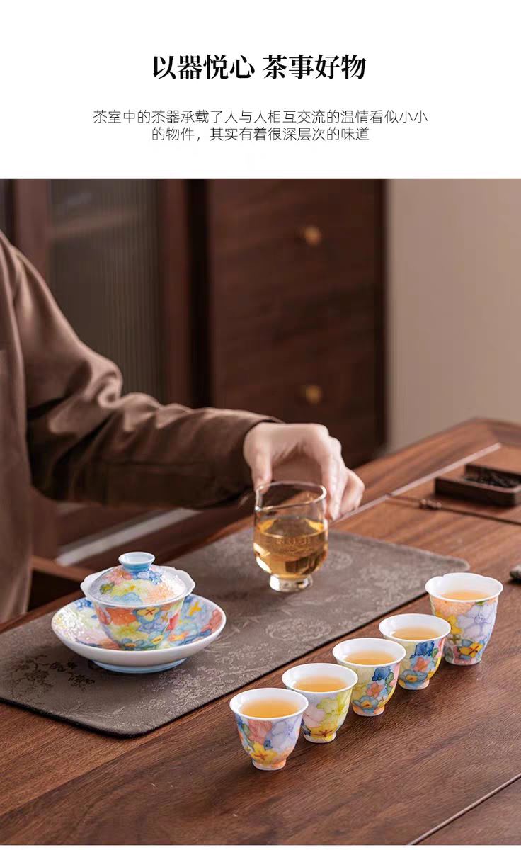 • 尾桥下窑釉下满彩手绘拉线浮雕万花功夫茶具套装商务会所礼品