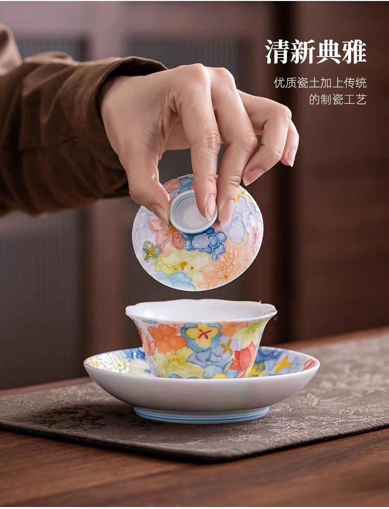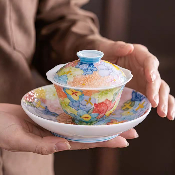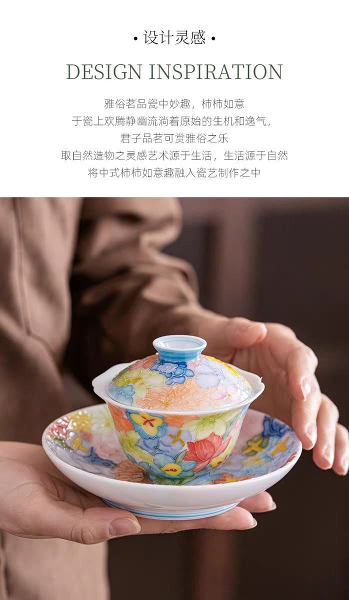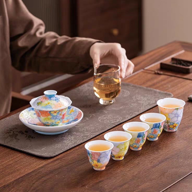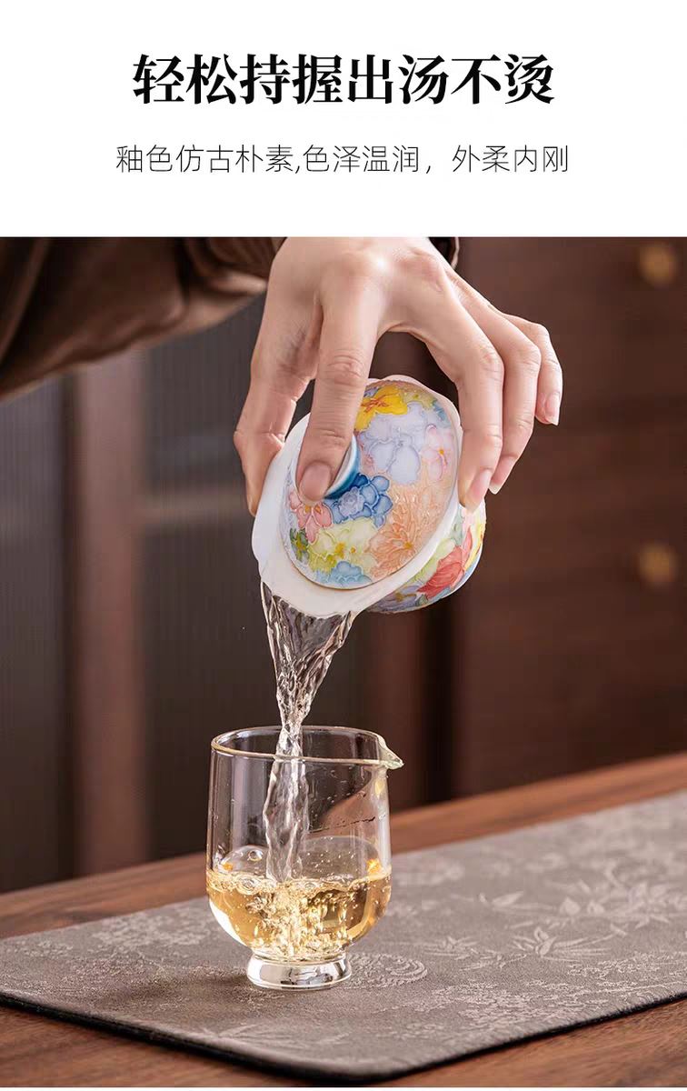 • 尾桥下窑釉下满彩手绘拉线浮雕万花功夫茶具套装商务会所礼品