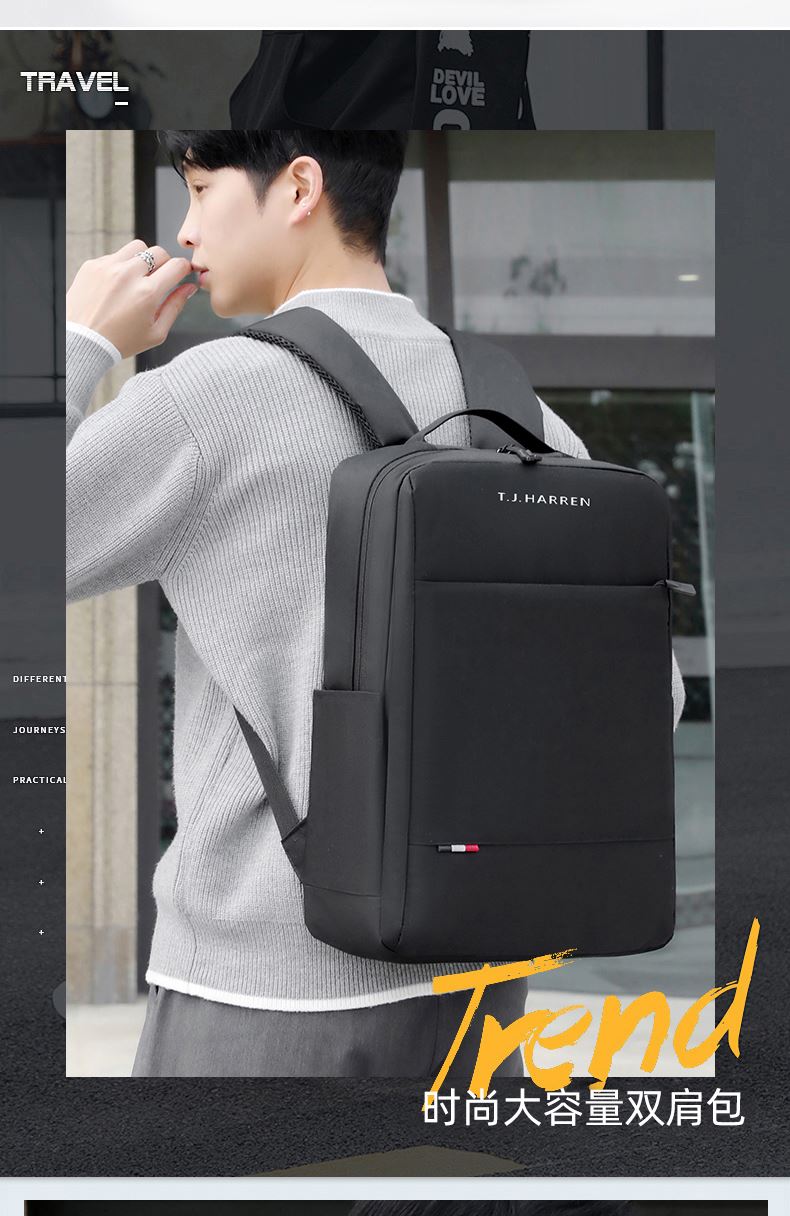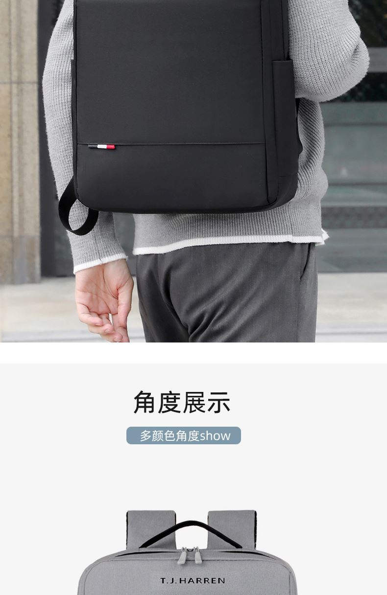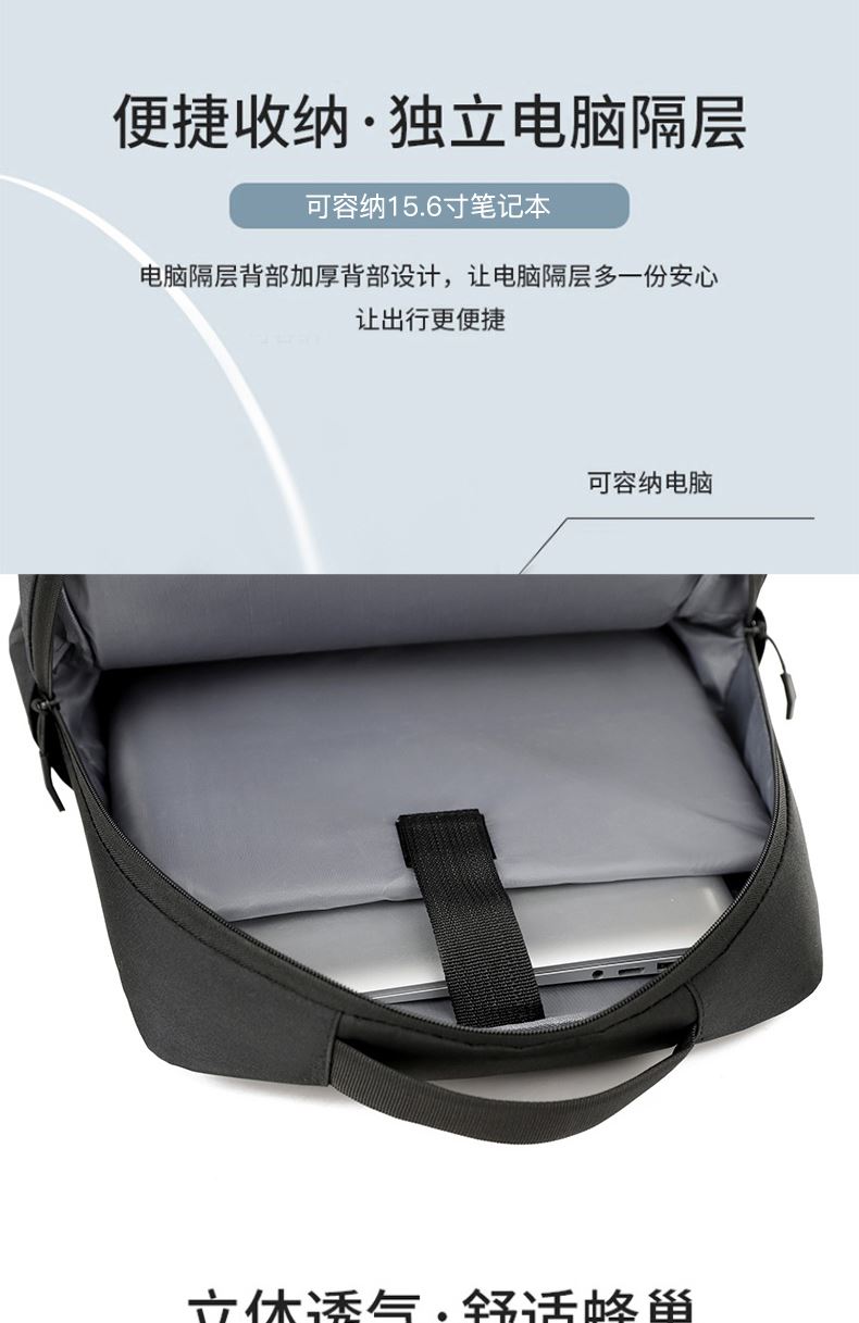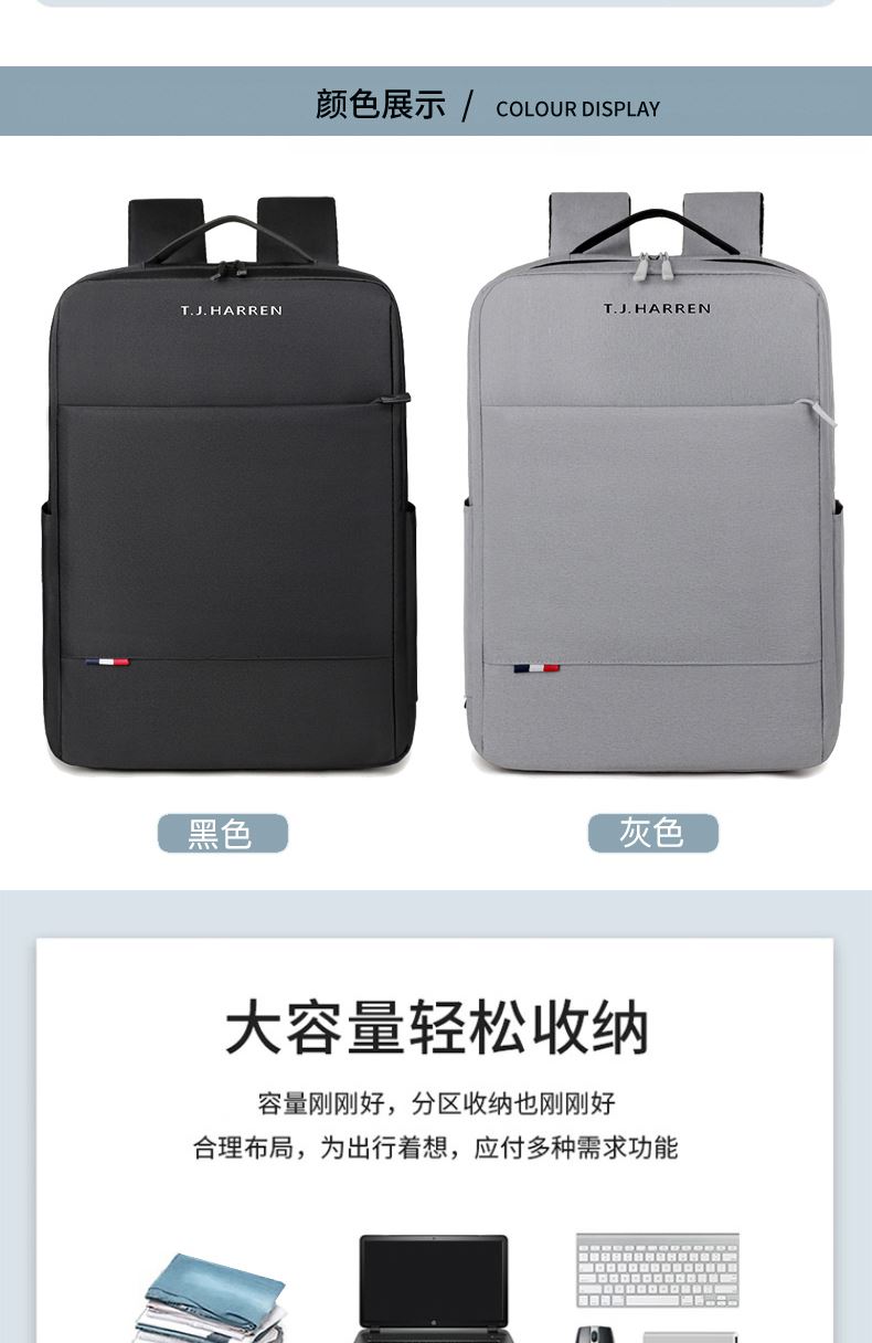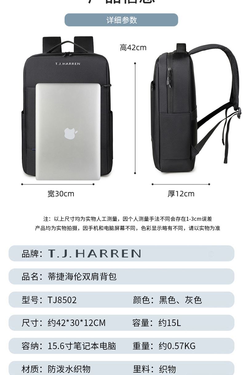 型号:TJ8502 颜色:黑色、灰色 尺寸:约42*30*12CM 容量:约15L 面料:防泼水织物 里料:织物 重量:约0.58KG 等级:一等合格品 执行标准:QB/T 1333-2018 产品特点: 1、新款轻量化设计,轻盈时尚,旅行休闲商务三用;2、防泼水面料,一擦即干,轻松打理;3、多隔层结构,分区合理,轻松收纳;4、主袋约15L大容量,装的更多;5、独立加棉加厚电脑隔层袋,可放置15.6寸电脑;6、大容量前置拉链袋,放置贴身物品;7、醒目三色装饰条,时尚好看;8、双侧袋设计,放置更多物件;9、拉杆固定束带设计,解放双手;10、加大加厚舒适提手与肩带,可背可提,出行更方便;11、支持客户定制。