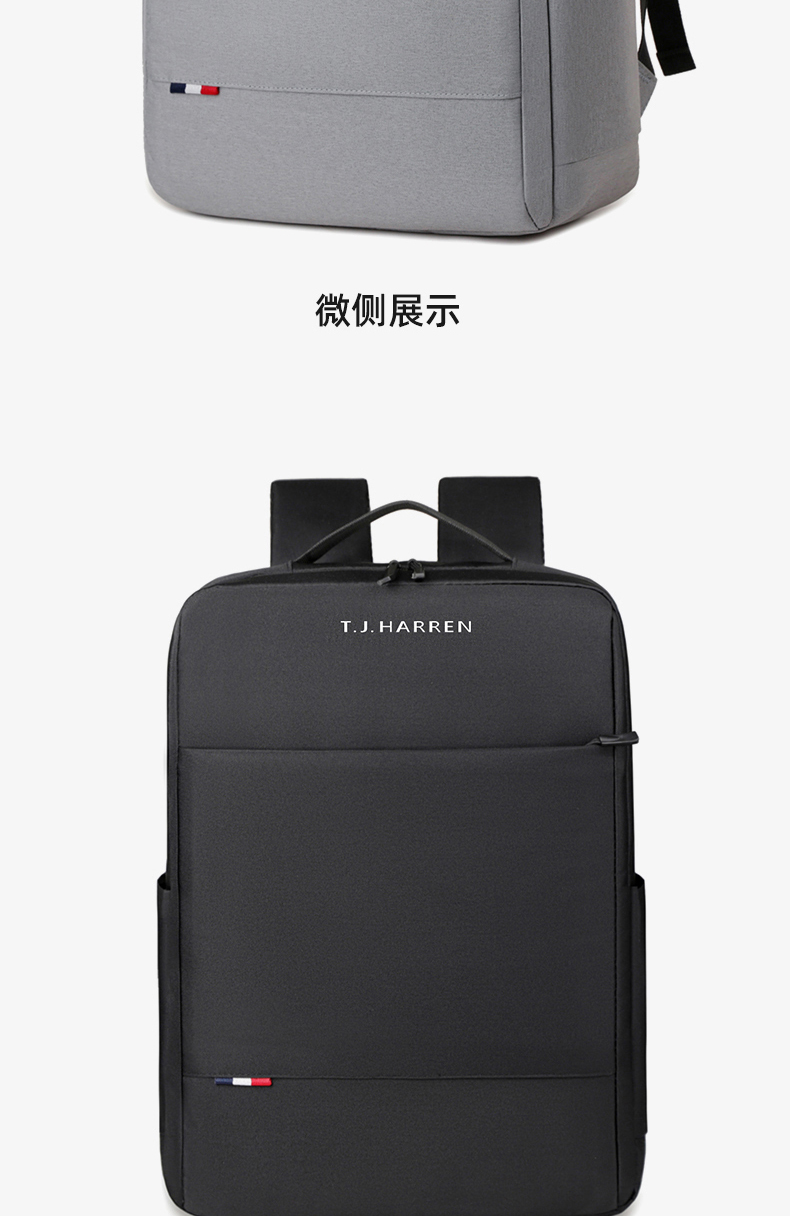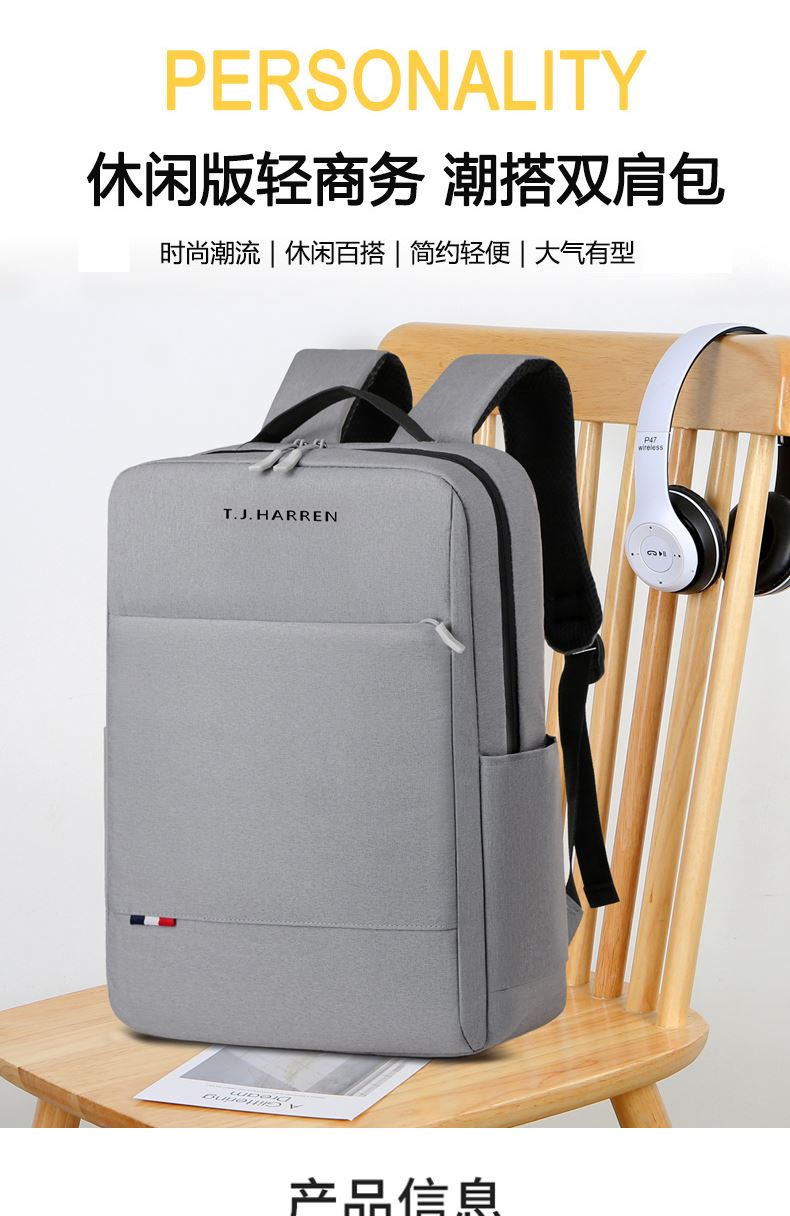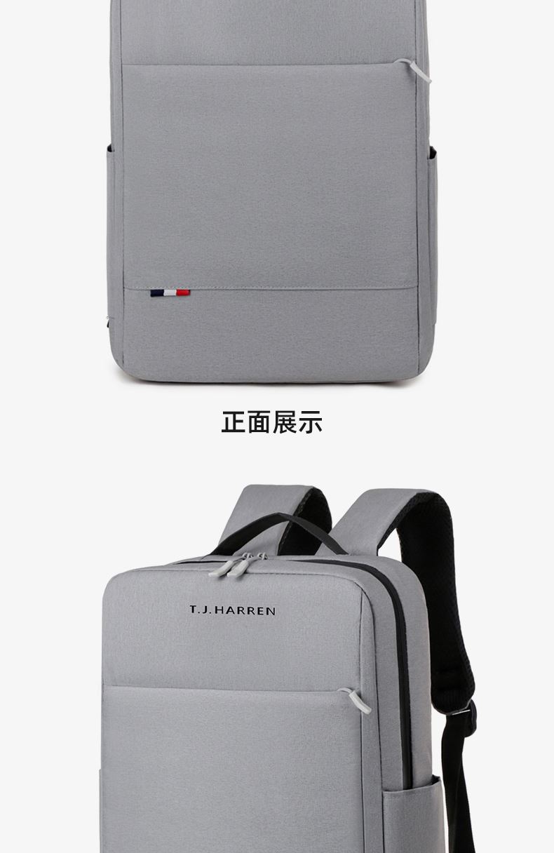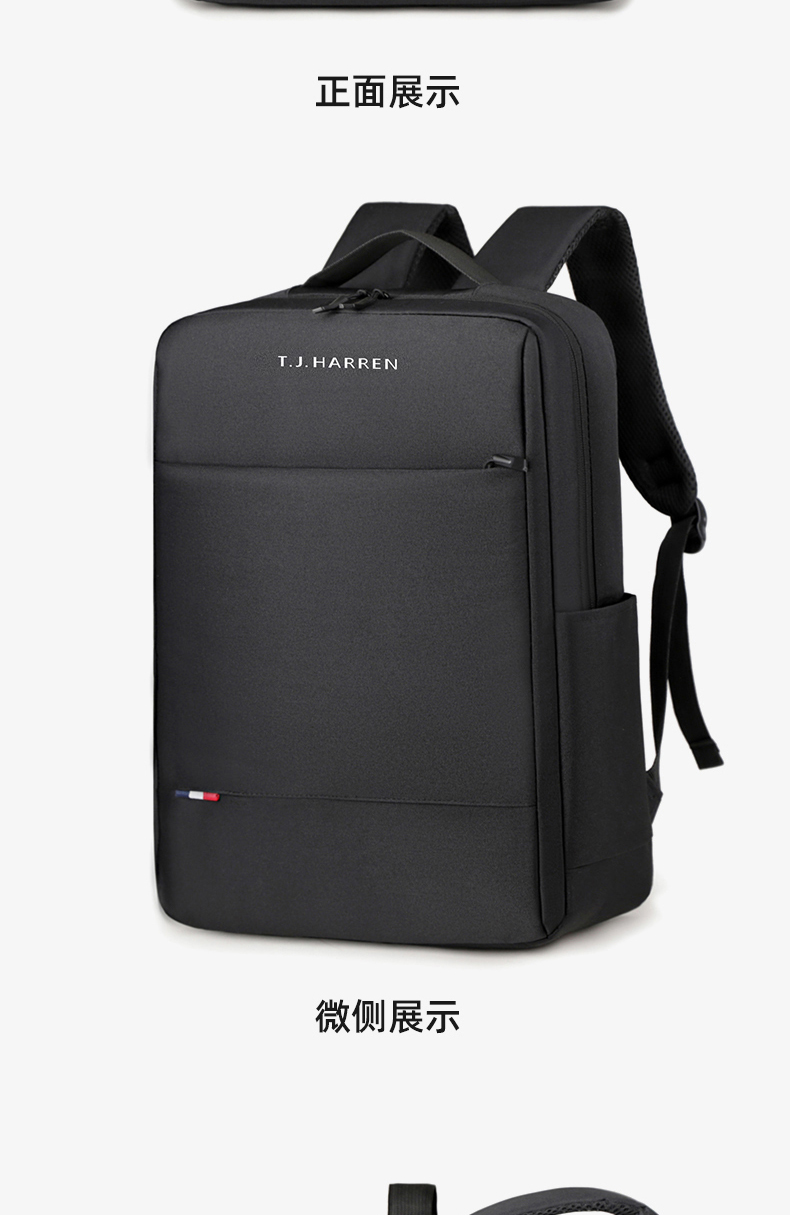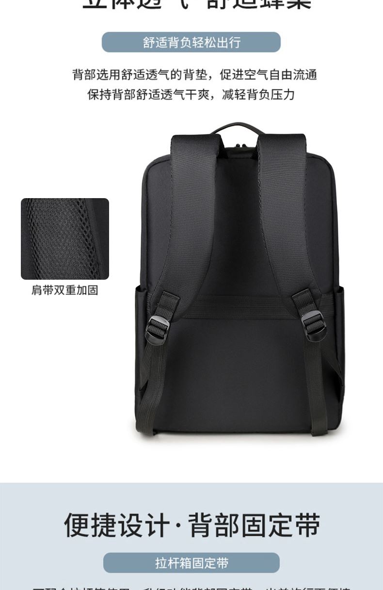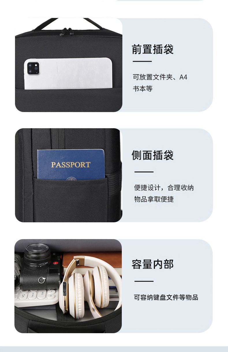 型号:TJ8502 颜色:黑色、灰色 尺寸:约42*30*12CM 容量:约15L 面料:防泼水织物 里料:织物 重量:约0.58KG 等级:一等合格品 执行标准:QB/T 1333-2018 产品特点: 1、新款轻量化设计,轻盈时尚,旅行休闲商务三用;2、防泼水面料,一擦即干,轻松打理;3、多隔层结构,分区合理,轻松收纳;4、主袋约15L大容量,装的更多;5、独立加棉加厚电脑隔层袋,可放置15.6寸电脑;6、大容量前置拉链袋,放置贴身物品;7、醒目三色装饰条,时尚好看;8、双侧袋设计,放置更多物件;9、拉杆固定束带设计,解放双手;10、加大加厚舒适提手与肩带,可背可提,出行更方便;11、支持客户定制。
