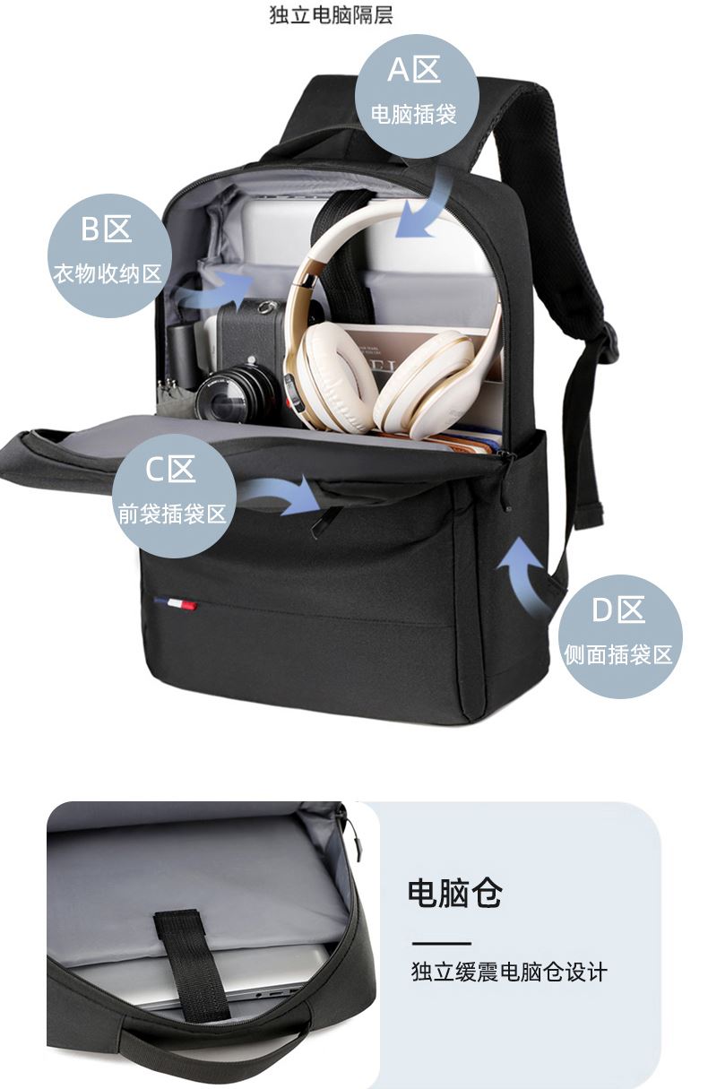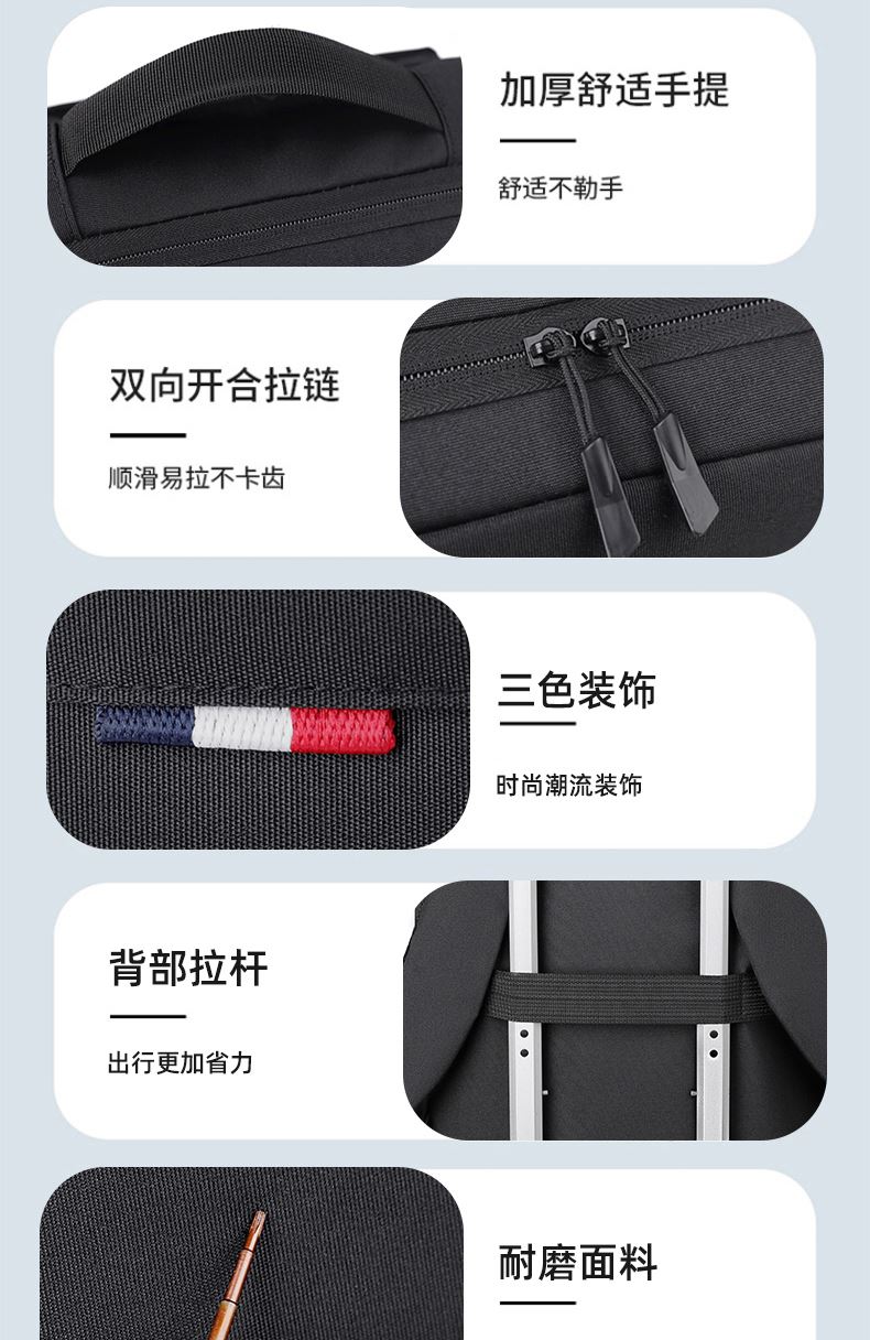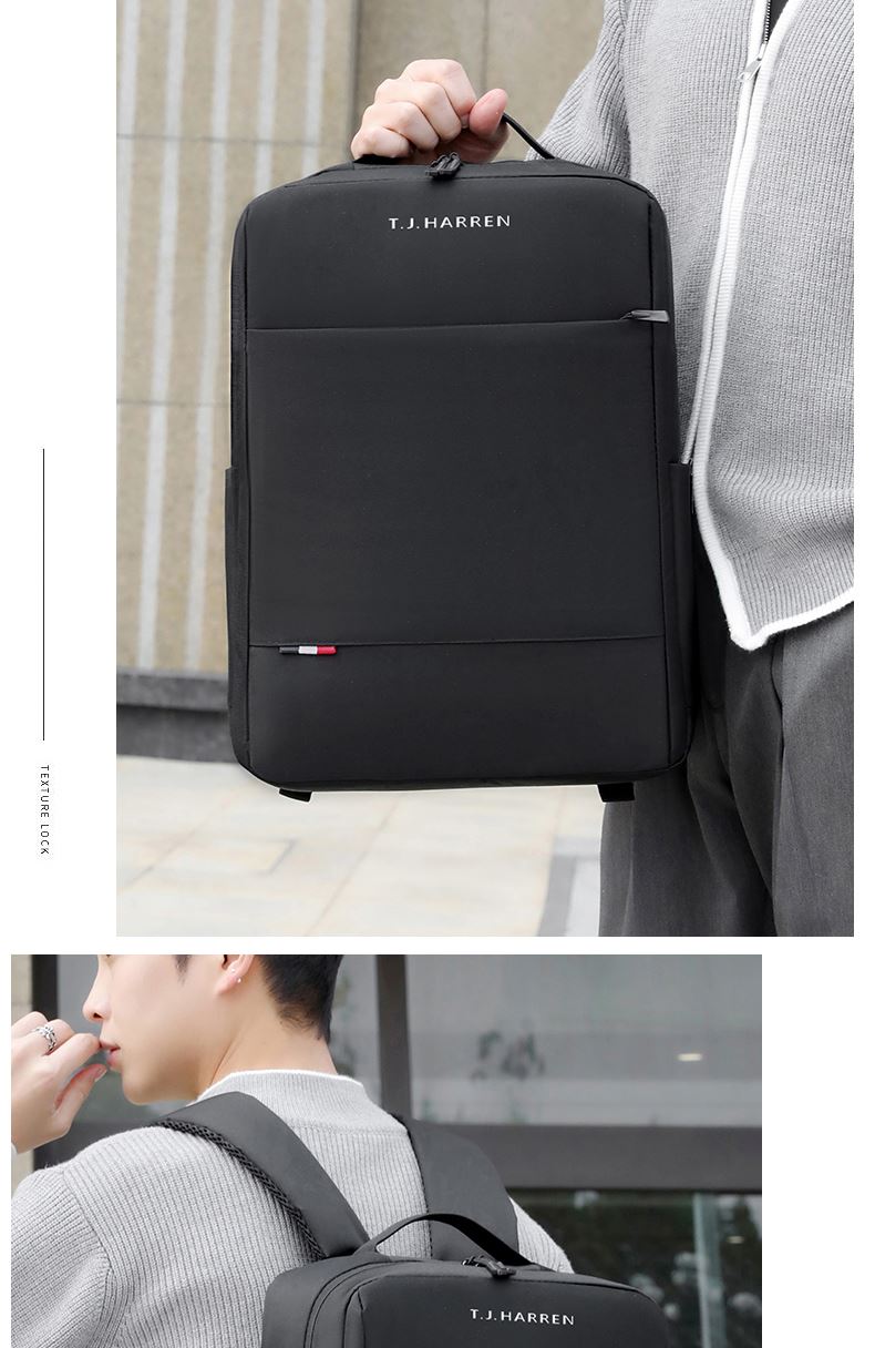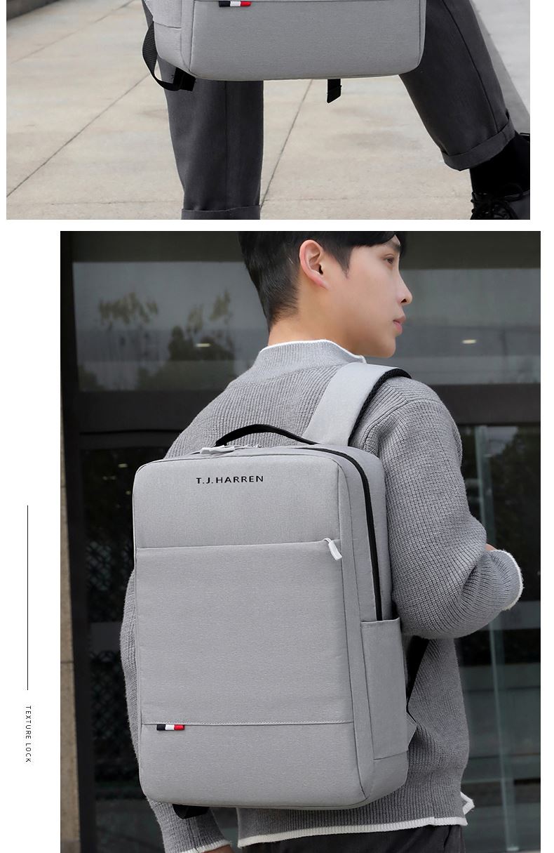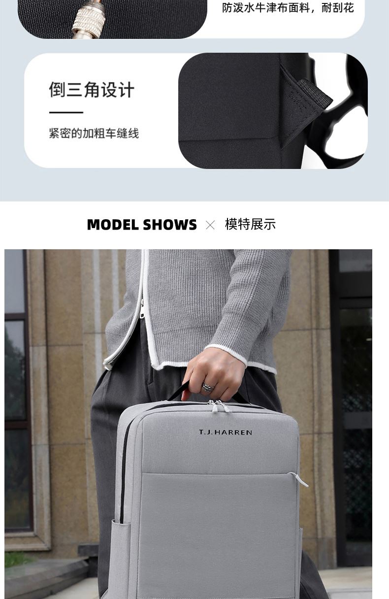 型号:TJ8502 颜色:黑色、灰色 尺寸:约42*30*12CM 容量:约15L 面料:防泼水织物 里料:织物 重量:约0.58KG 等级:一等合格品 执行标准:QB/T 1333-2018 产品特点: 1、新款轻量化设计,轻盈时尚,旅行休闲商务三用;2、防泼水面料,一擦即干,轻松打理;3、多隔层结构,分区合理,轻松收纳;4、主袋约15L大容量,装的更多;5、独立加棉加厚电脑隔层袋,可放置15.6寸电脑;6、大容量前置拉链袋,放置贴身物品;7、醒目三色装饰条,时尚好看;8、双侧袋设计,放置更多物件;9、拉杆固定束带设计,解放双手;10、加大加厚舒适提手与肩带,可背可提,出行更方便;11、支持客户定制。