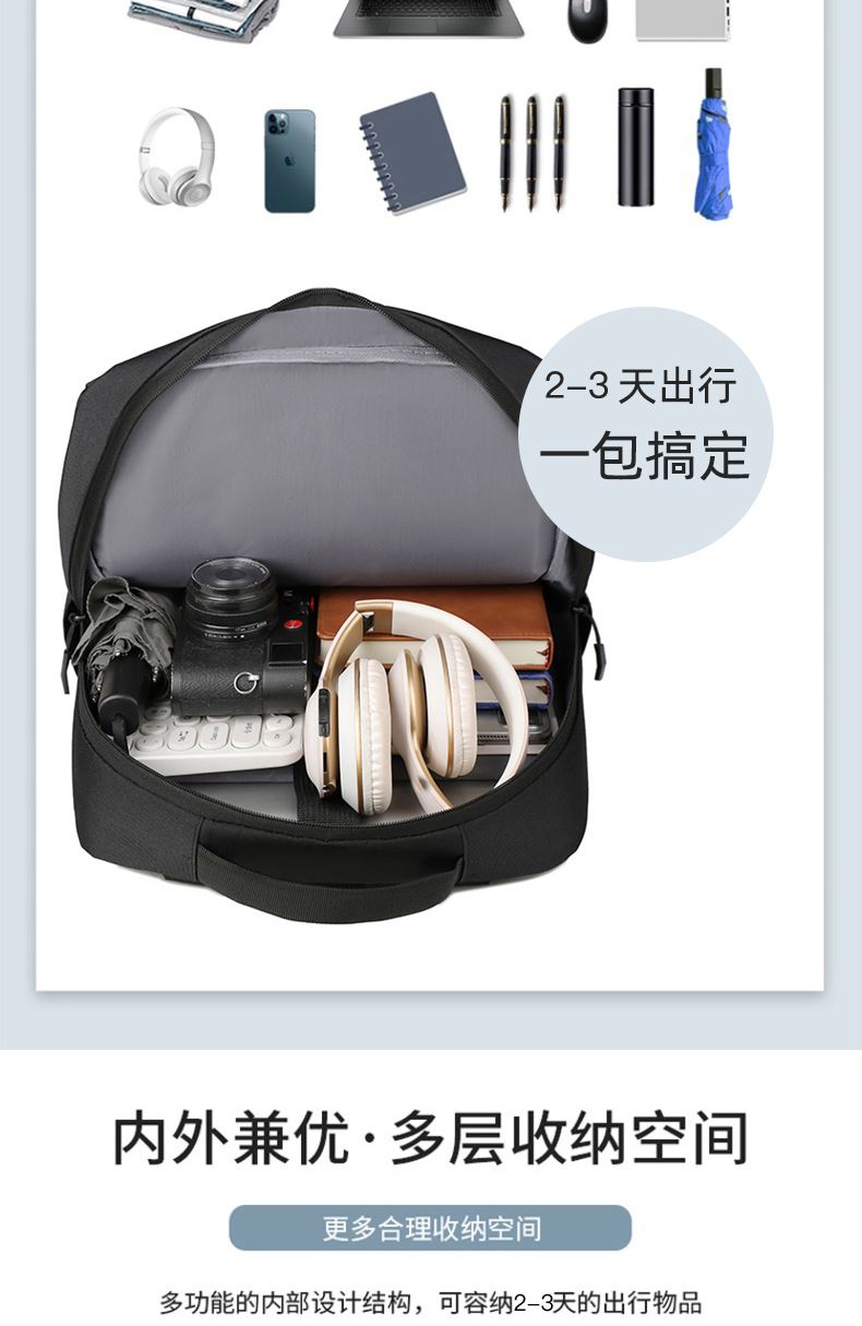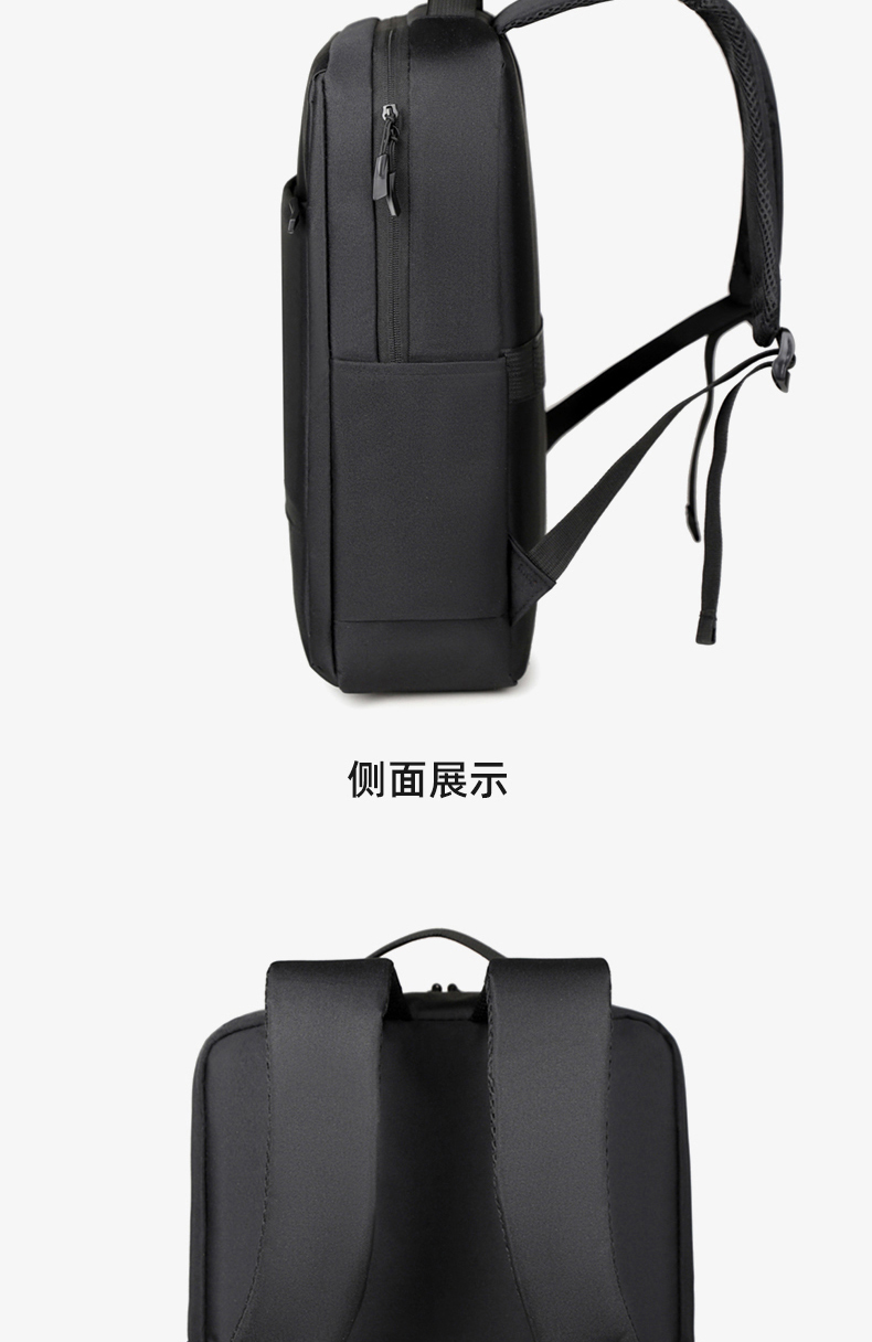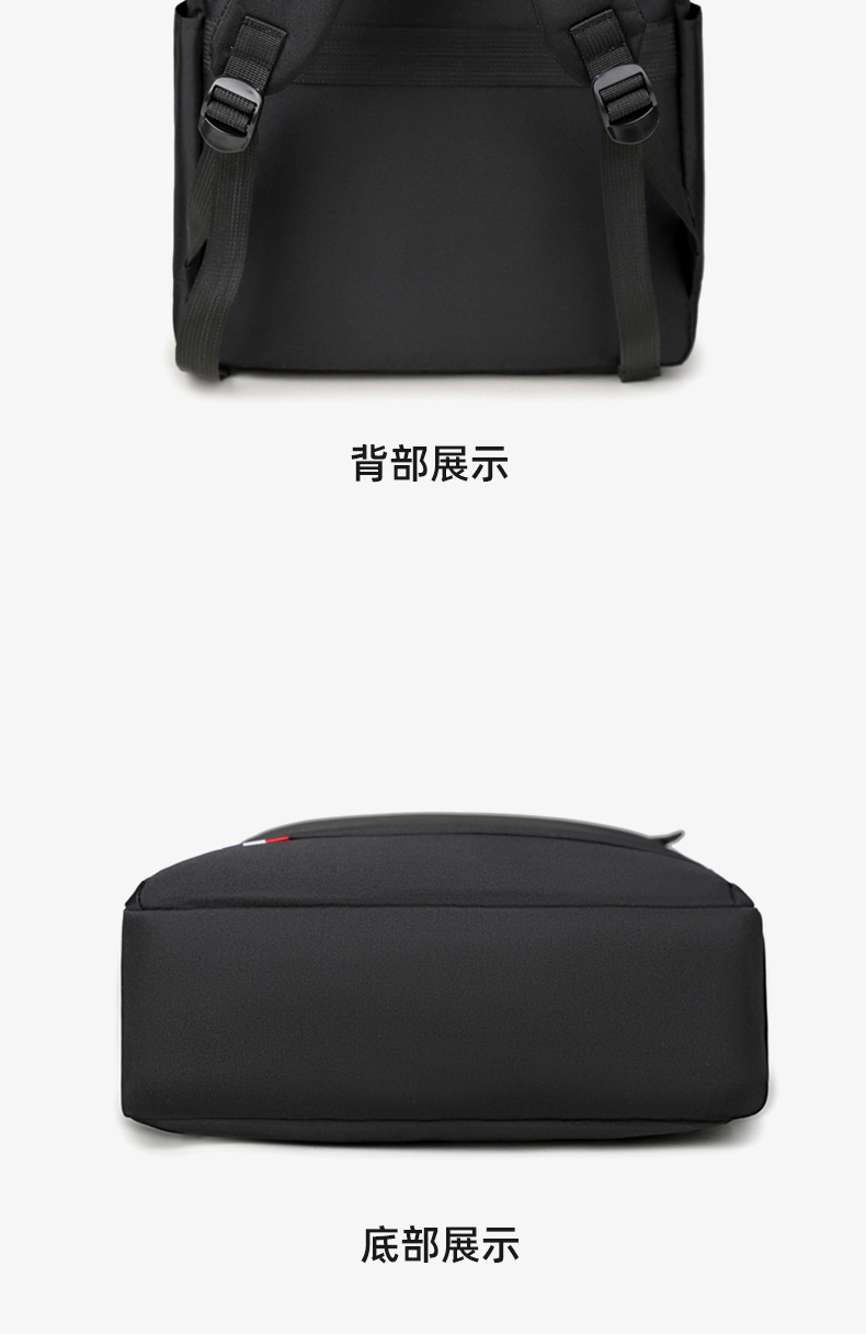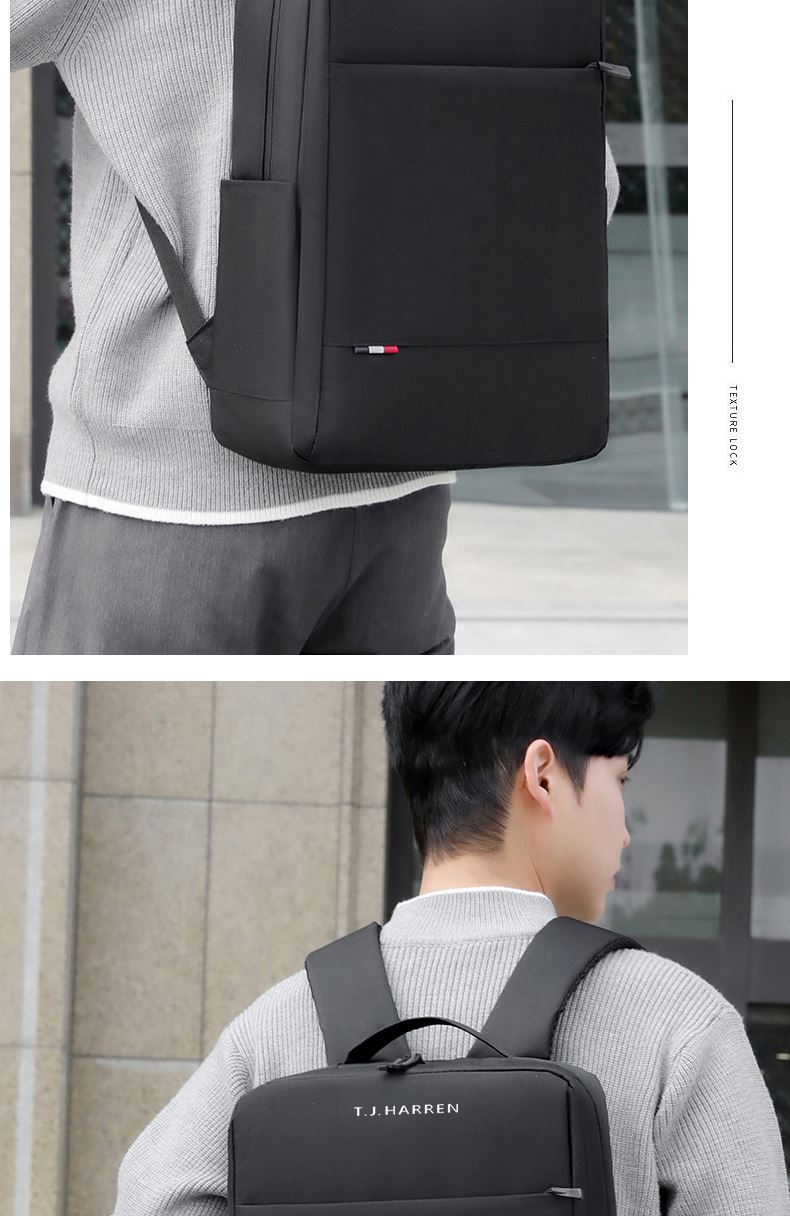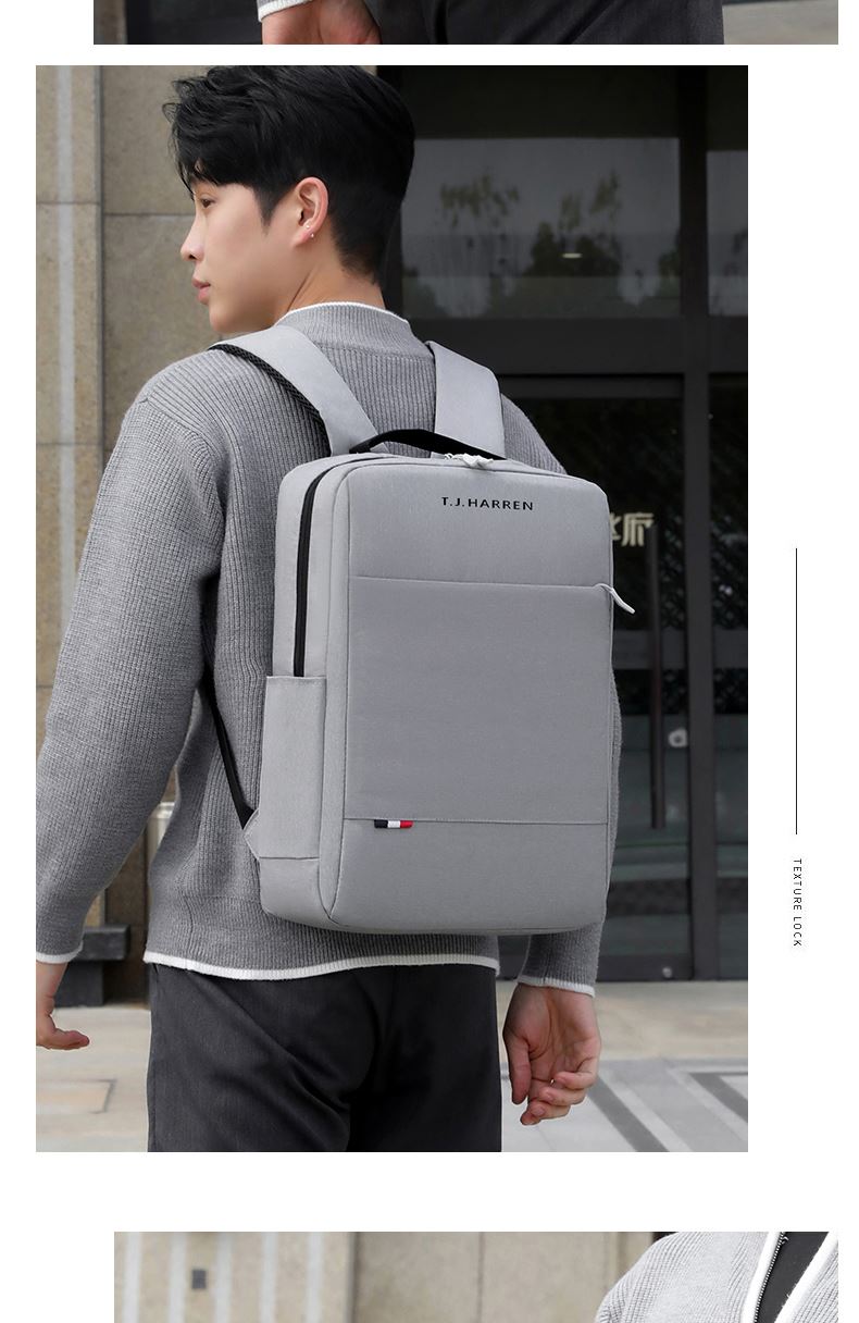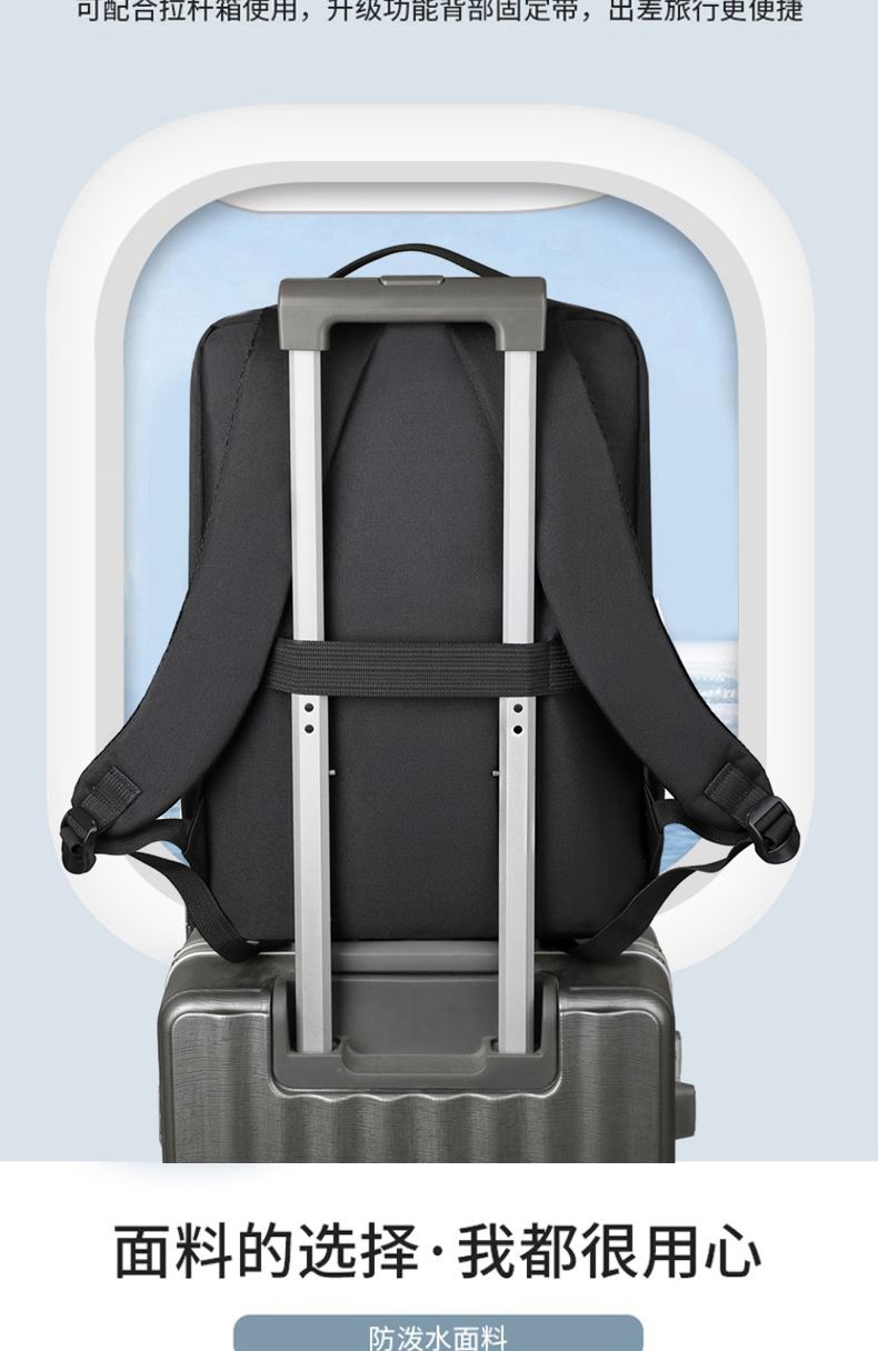 型号:TJ8502 颜色:黑色、灰色 尺寸:约42*30*12CM 容量:约15L 面料:防泼水织物 里料:织物 重量:约0.58KG 等级:一等合格品 执行标准:QB/T 1333-2018 产品特点: 1、新款轻量化设计,轻盈时尚,旅行休闲商务三用;2、防泼水面料,一擦即干,轻松打理;3、多隔层结构,分区合理,轻松收纳;4、主袋约15L大容量,装的更多;5、独立加棉加厚电脑隔层袋,可放置15.6寸电脑;6、大容量前置拉链袋,放置贴身物品;7、醒目三色装饰条,时尚好看;8、双侧袋设计,放置更多物件;9、拉杆固定束带设计,解放双手;10、加大加厚舒适提手与肩带,可背可提,出行更方便;11、支持客户定制。