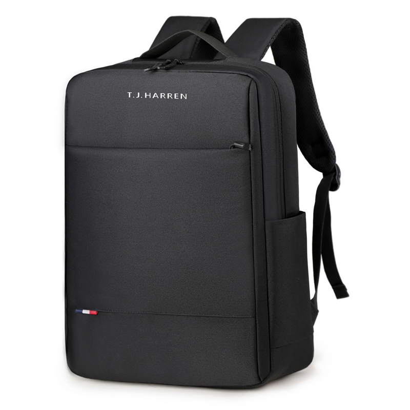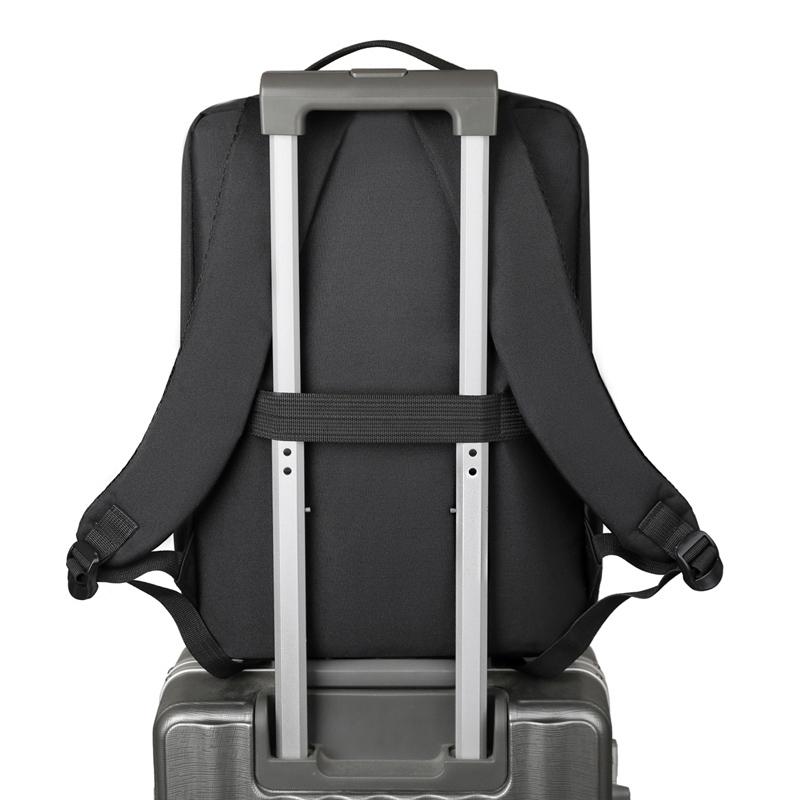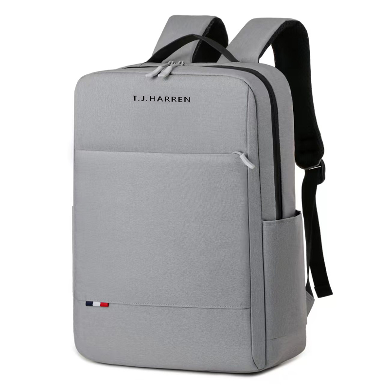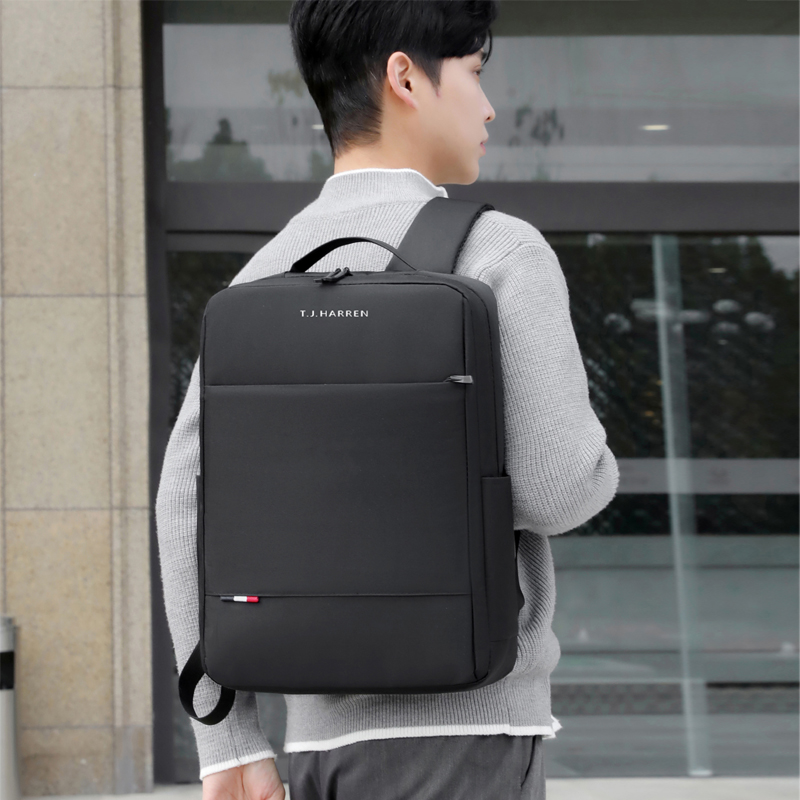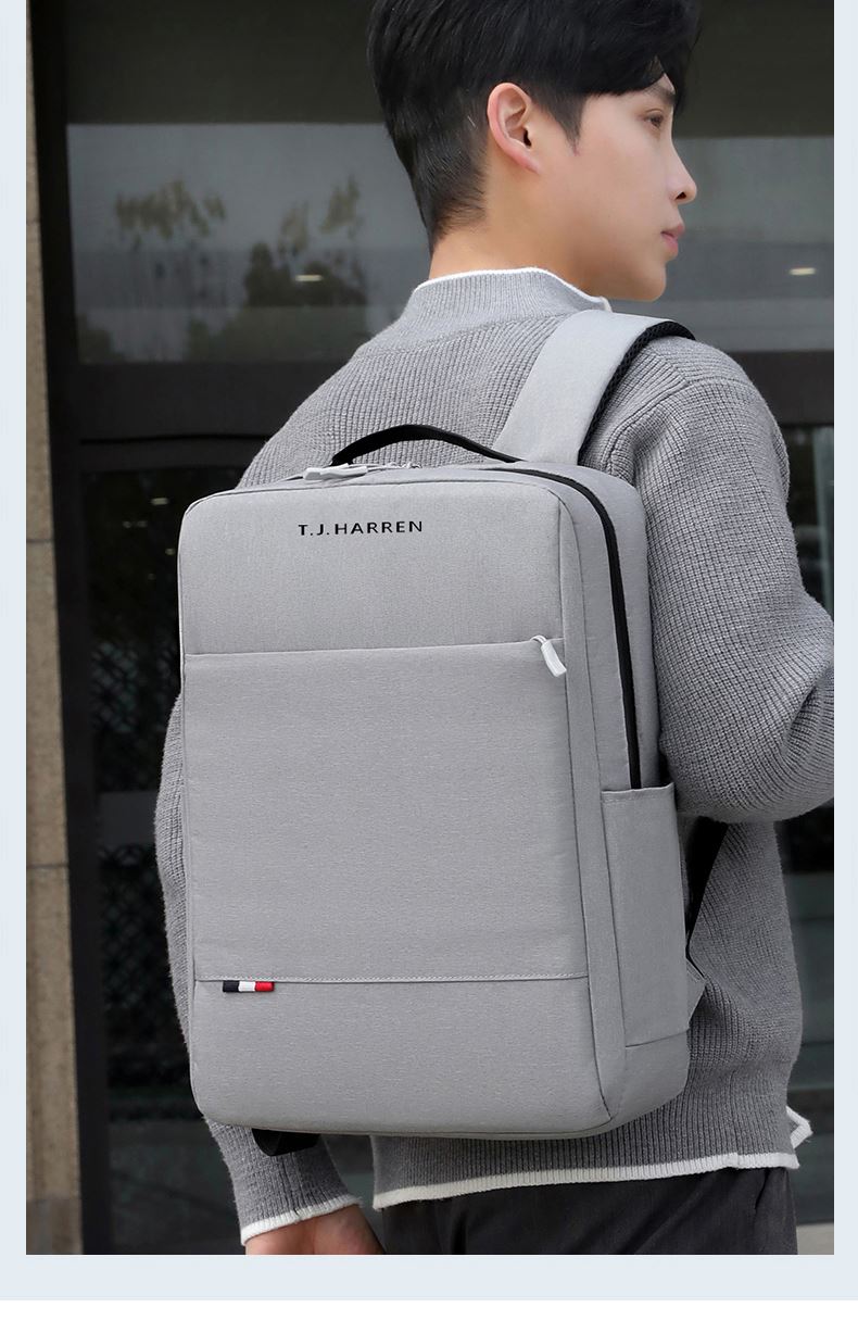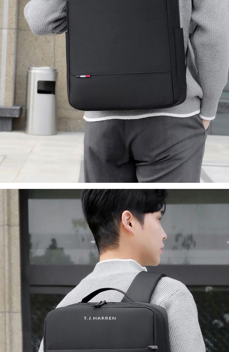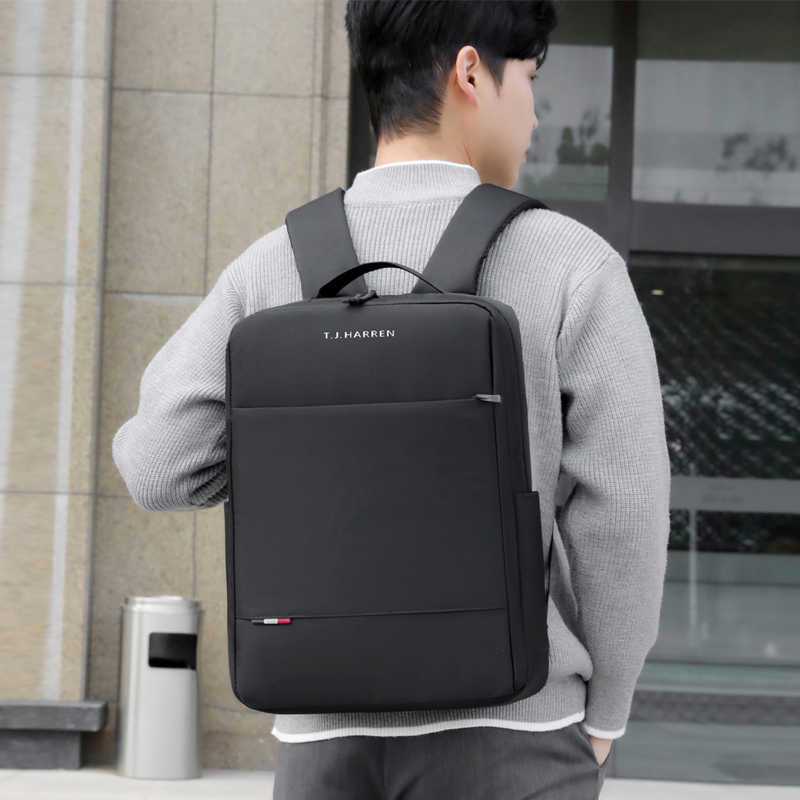 型号:TJ8502 颜色:黑色、灰色 尺寸:约42*30*12CM 容量:约15L 面料:防泼水织物 里料:织物 重量:约0.58KG 等级:一等合格品 执行标准:QB/T 1333-2018 产品特点: 1、新款轻量化设计,轻盈时尚,旅行休闲商务三用;2、防泼水面料,一擦即干,轻松打理;3、多隔层结构,分区合理,轻松收纳;4、主袋约15L大容量,装的更多;5、独立加棉加厚电脑隔层袋,可放置15.6寸电脑;6、大容量前置拉链袋,放置贴身物品;7、醒目三色装饰条,时尚好看;8、双侧袋设计,放置更多物件;9、拉杆固定束带设计,解放双手;10、加大加厚舒适提手与肩带,可背可提,出行更方便;11、支持客户定制。