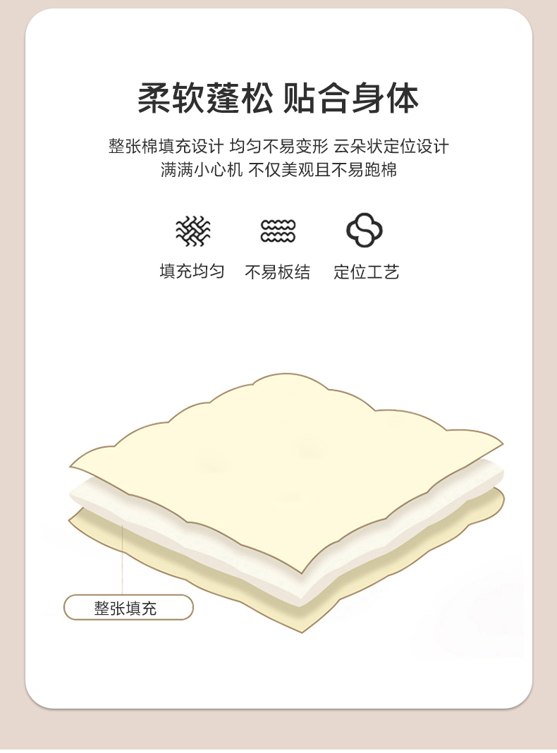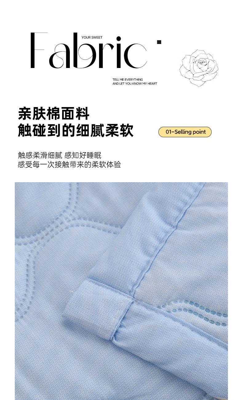 尺寸:150*200cm 面料:亲肤棉 填充:羽丝棉 填充克重:350g 执行标准:GB/T22796-2021 安全类别:GB18401-2010 B类 1.甄选优质亲肤水洗棉纤维面料,水洗棉织物是一种功能性织造方式,在保留面料原有性能的同时,通过再加工,使织物表面形成一层层细腻的短绒毛层的感觉。 2.采用纤维填充,柔软蓬松,亲肤性佳,回弹性优,贴身覆盖且轻盈。