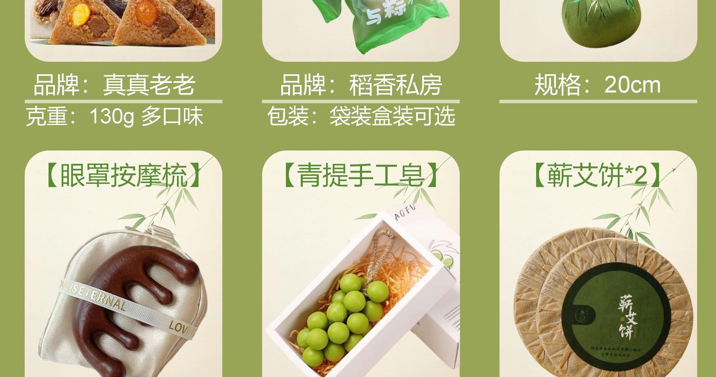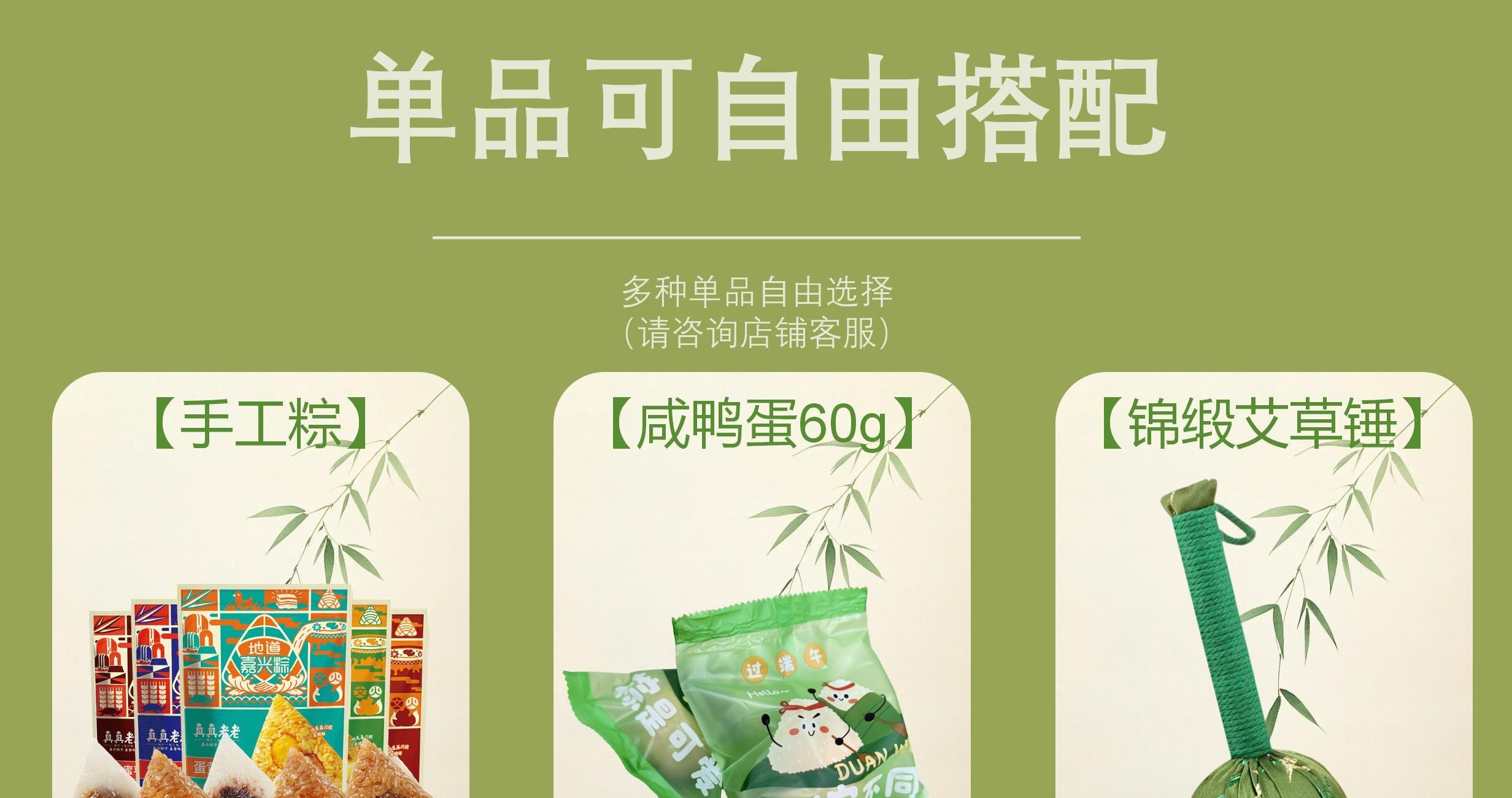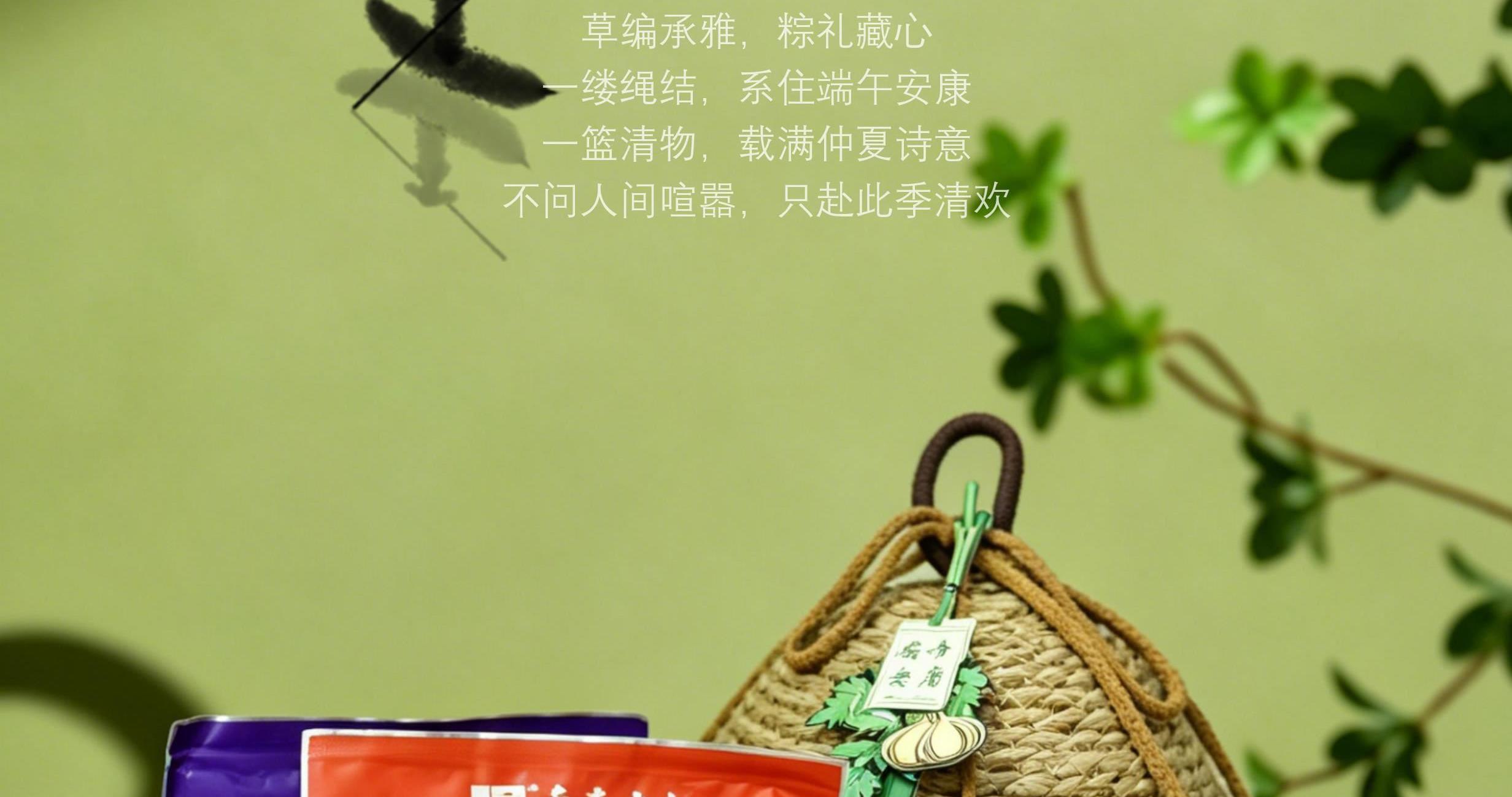真真老老经典鲜肉粽100g*2 真真老老红袍豆沙粽100g*2 稻香私房咸鸭蛋4枚 平安喜乐陶瓷品茗杯*2 端午风物艾草精油香皂100g 竹筒香薰蜡烛氛围摆件 五谷丰登端午编织收纳筐 网兜手提袋 端午风物吊牌 提篮尺寸:φ20*13(23)cm