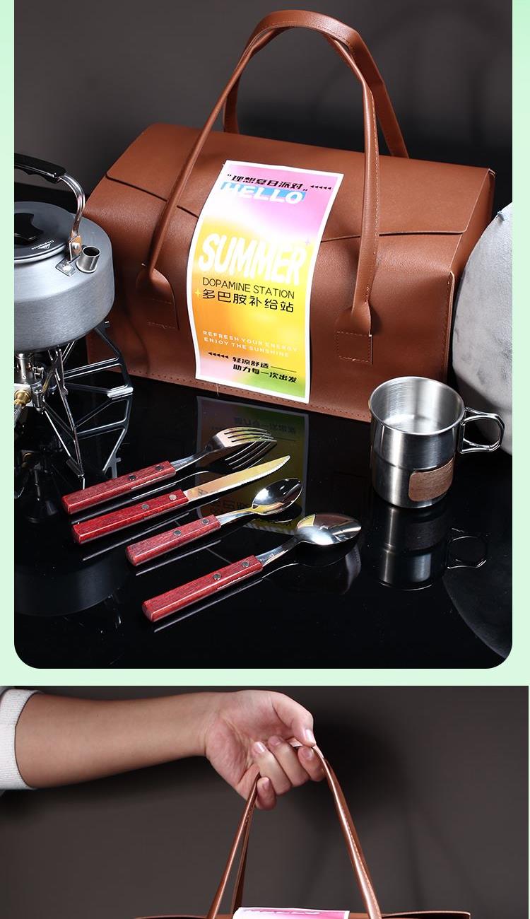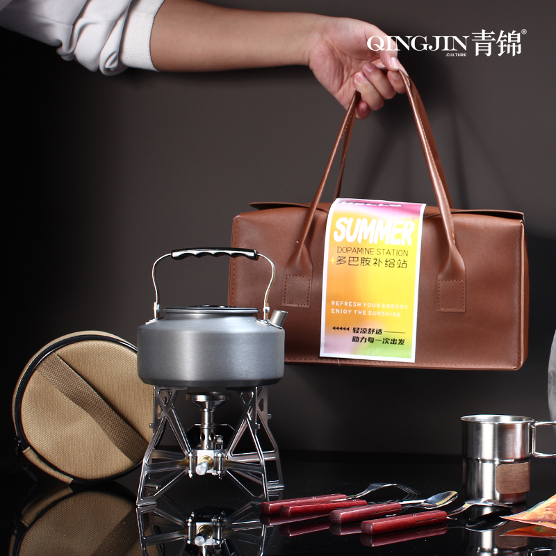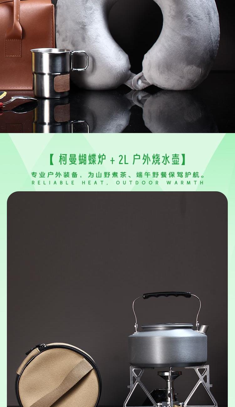 配置 手提式便携旅行皮包*1户外颈枕*1 五芳斋粽x4只(蜜枣粽*2-鲜肉粽*2) 柯曼蝴蝶炉*1 柯曼户外烧水壶*1 容量2L(均配独立收纳) 户外金属小杯*1 野餐刀叉勺餐具*1套说明书*1 材质 户外水壶:铝合金 1 蝴蝶炉:铝合金不锈钢黄铜 皮革 填充记忆棉 尺寸 烧水壶:185*180*112mm 卡式炉:195*120*150(收纳包170*70mm) 手提皮包:340*200*165mm