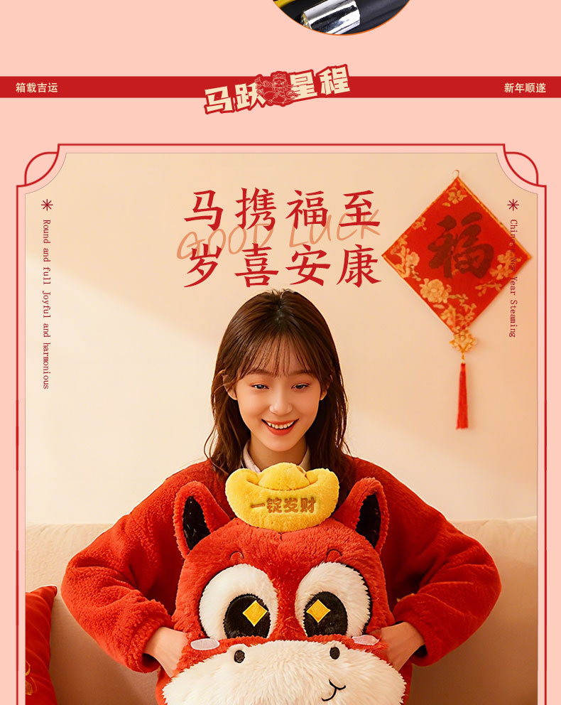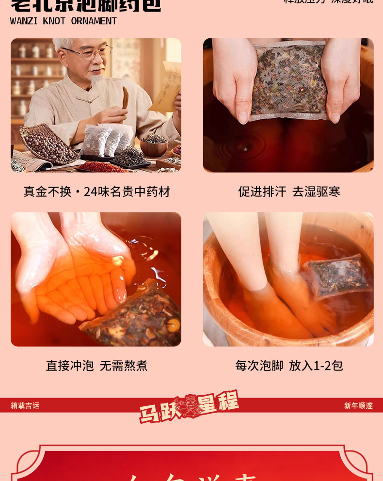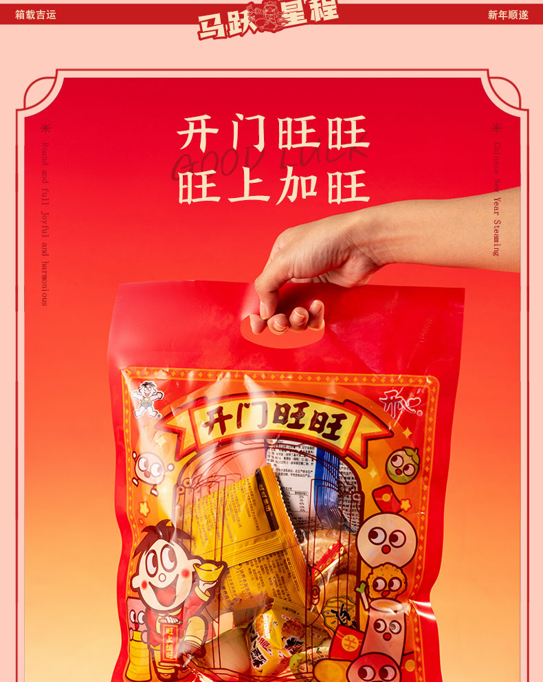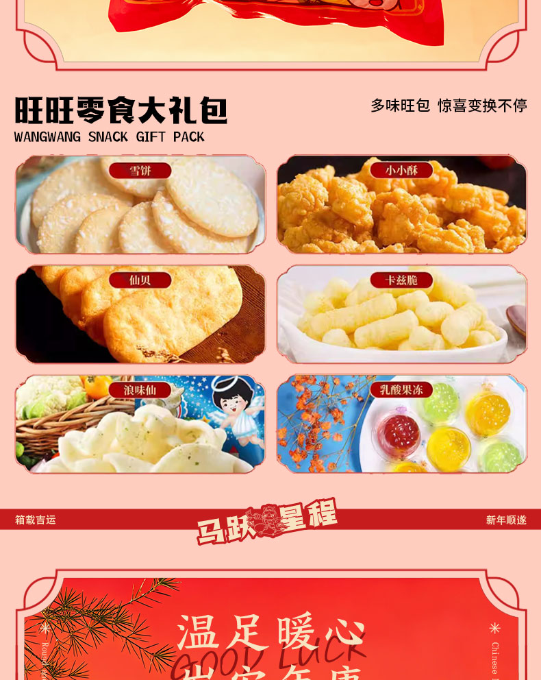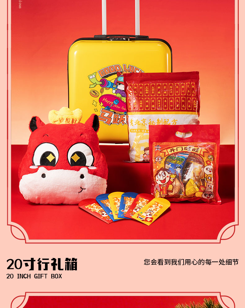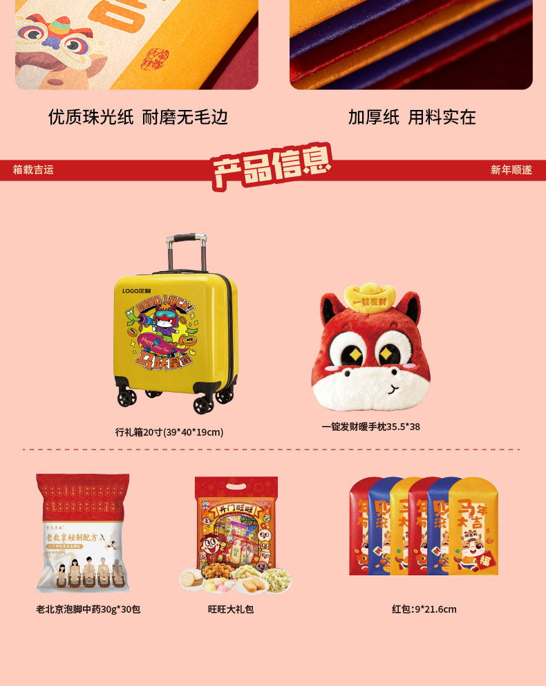 产品配置:20寸行李箱、旺旺大礼包147G 、一锭发财暖手抱枕、十八味药材泡脚包30小包一袋、马年大吉红包*6个