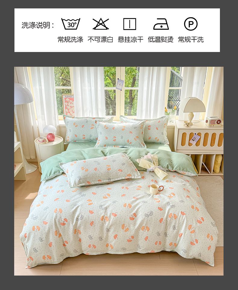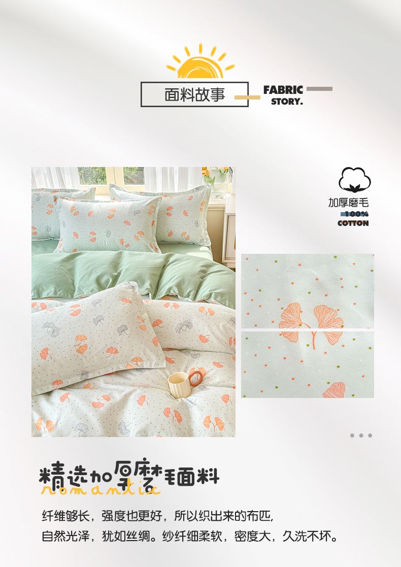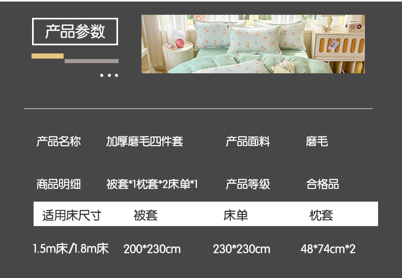 被套:200×230cm 床单:230×230cm 枕套:48×74cm 适用:1.5M-1.8M床 面料:磨绒(聚酯纤维) 印染工艺:环保印花 包装:精美手提盒 甄选柔肤棉面料,质地柔软 细腻,搭配时尙印花点缀柔和色彩的选择 手感舒适亲肤细腻 ,一起感受美好邂逅。