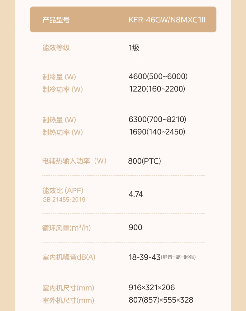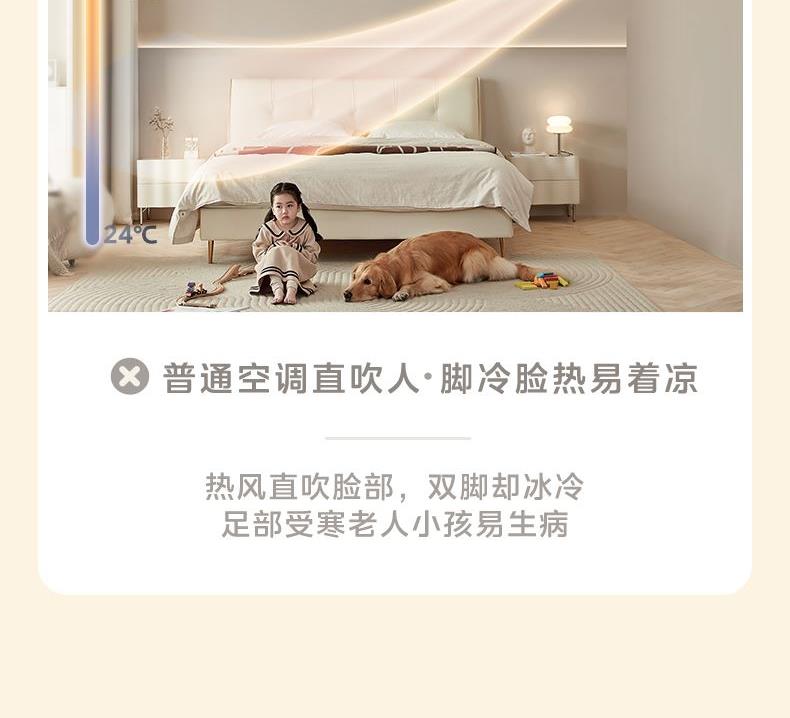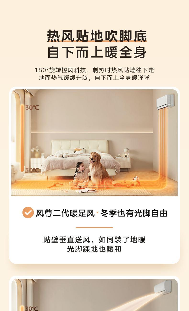 能效等级:1级 制冷量 (W):4600(500~6000) 制冷功率 (W):1220(160~2200) 制热量 (W):6300(700~8210) 制热功率 (W):1690(140~2450) 电辅热输入功率(W):800(PTC) 室内机尺寸(mm):916x321x206 室外机尺寸(mm):807(857)x555x328 180°旋转送风舒适不受限 3分钟搅凉全屋自下而上暖全身 一键酷省电全天节能28% 冷媒环技术60℃高温强制冷