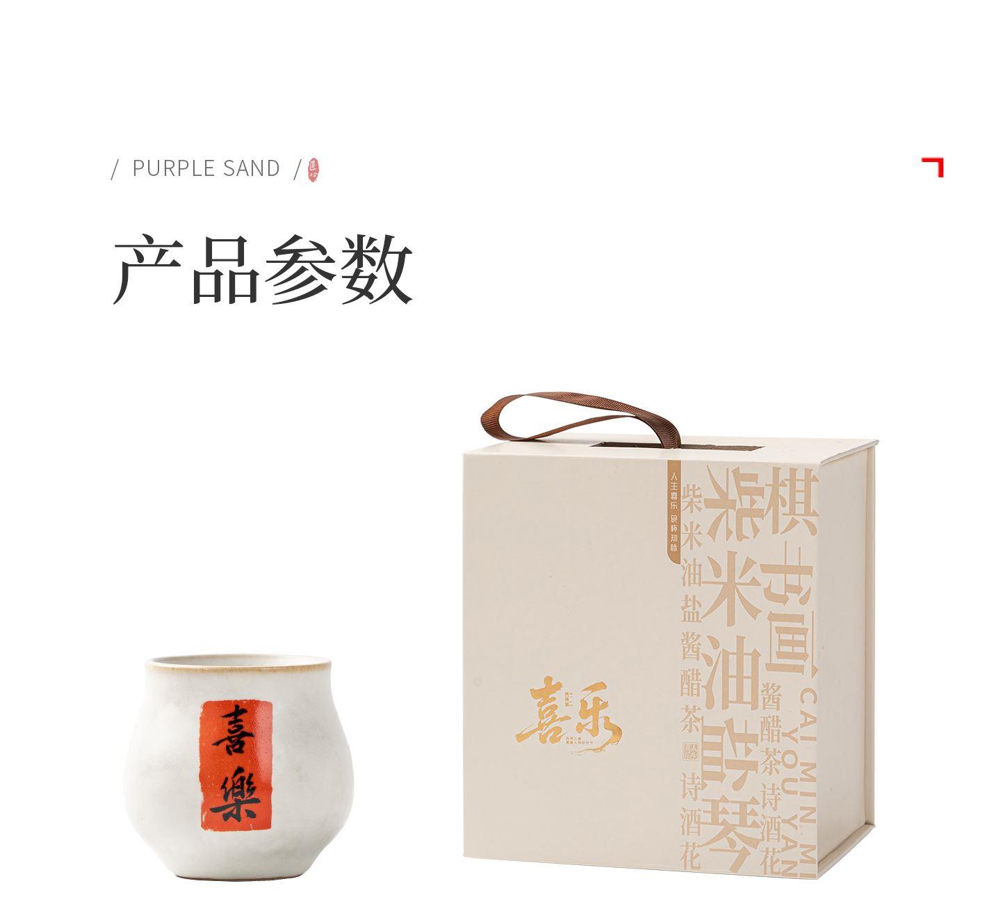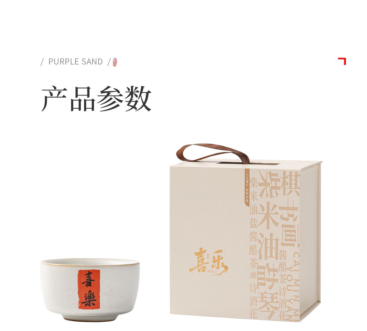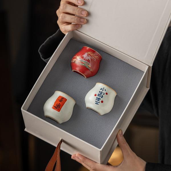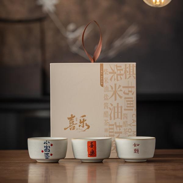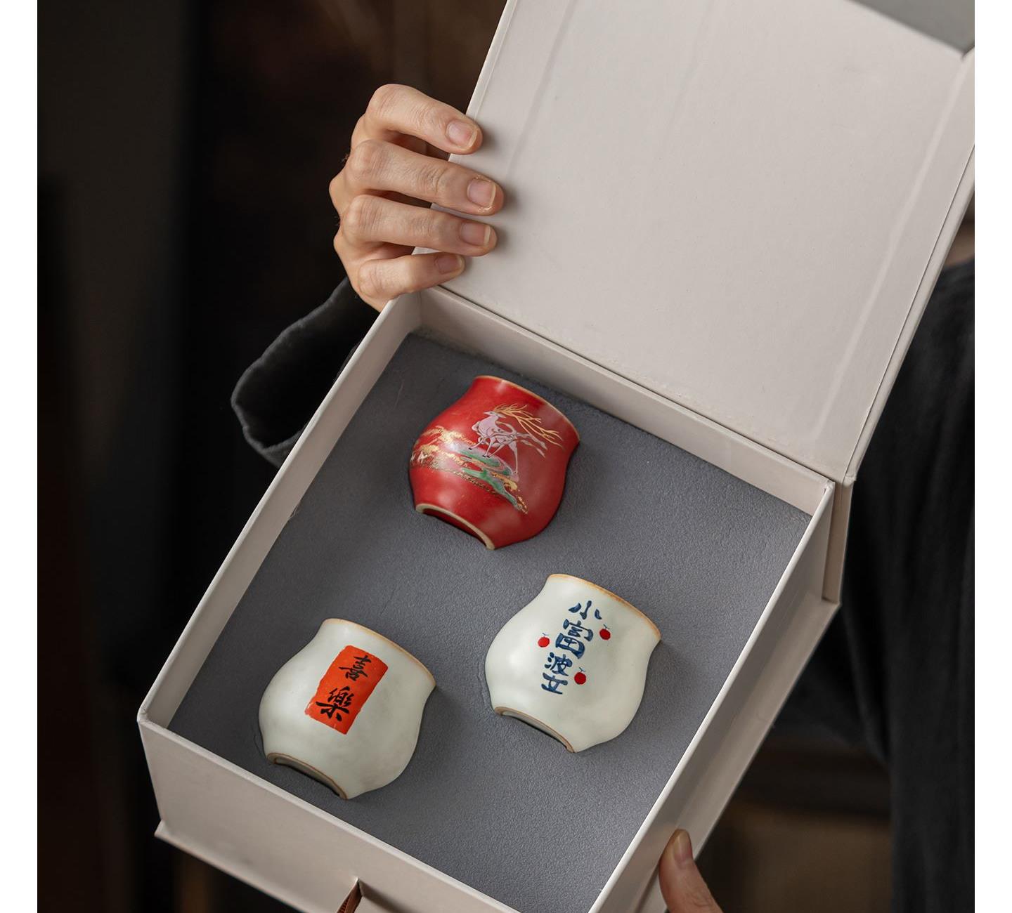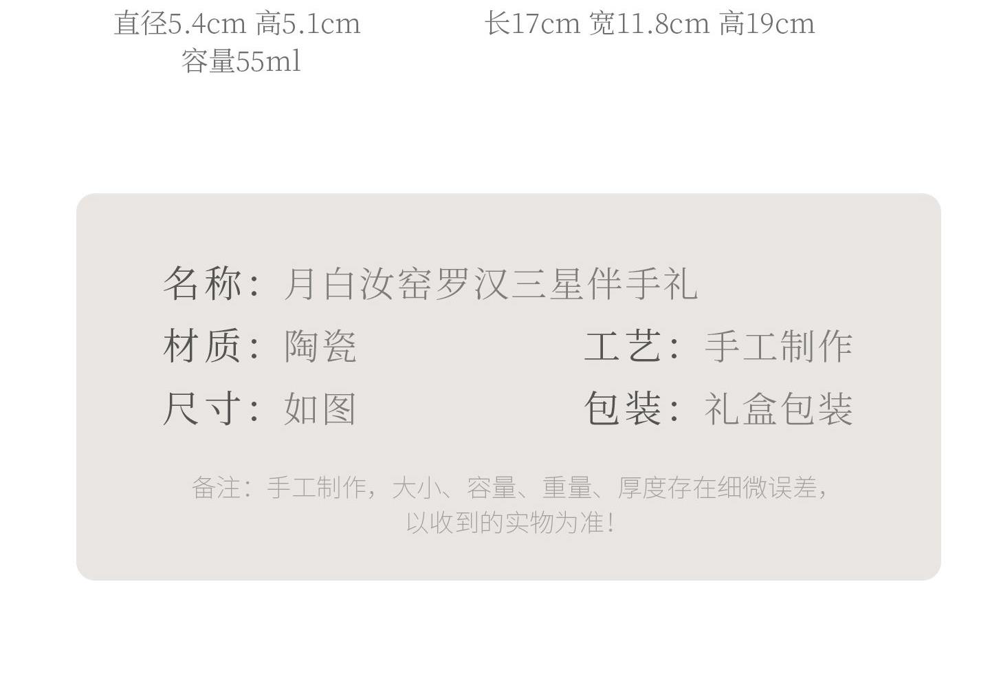 配置:茶杯*3, 尺寸:富贵吉祥杯7.8*4.7cm 容量100ml, 罗汉三星杯5.4*5.1cm 容量55ml, 礼盒:17*11.8*19cm。