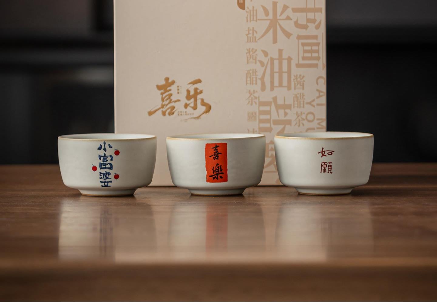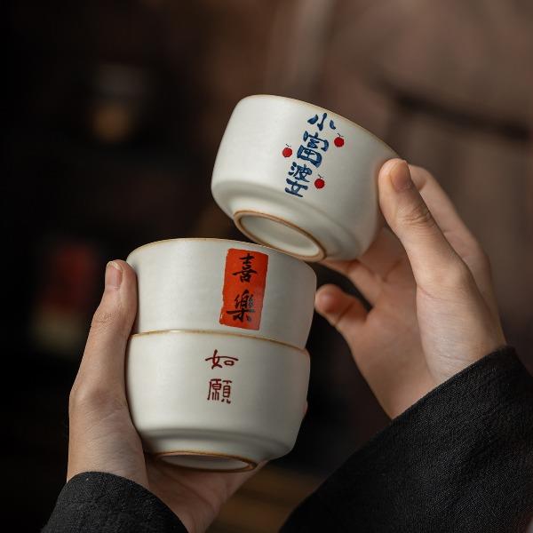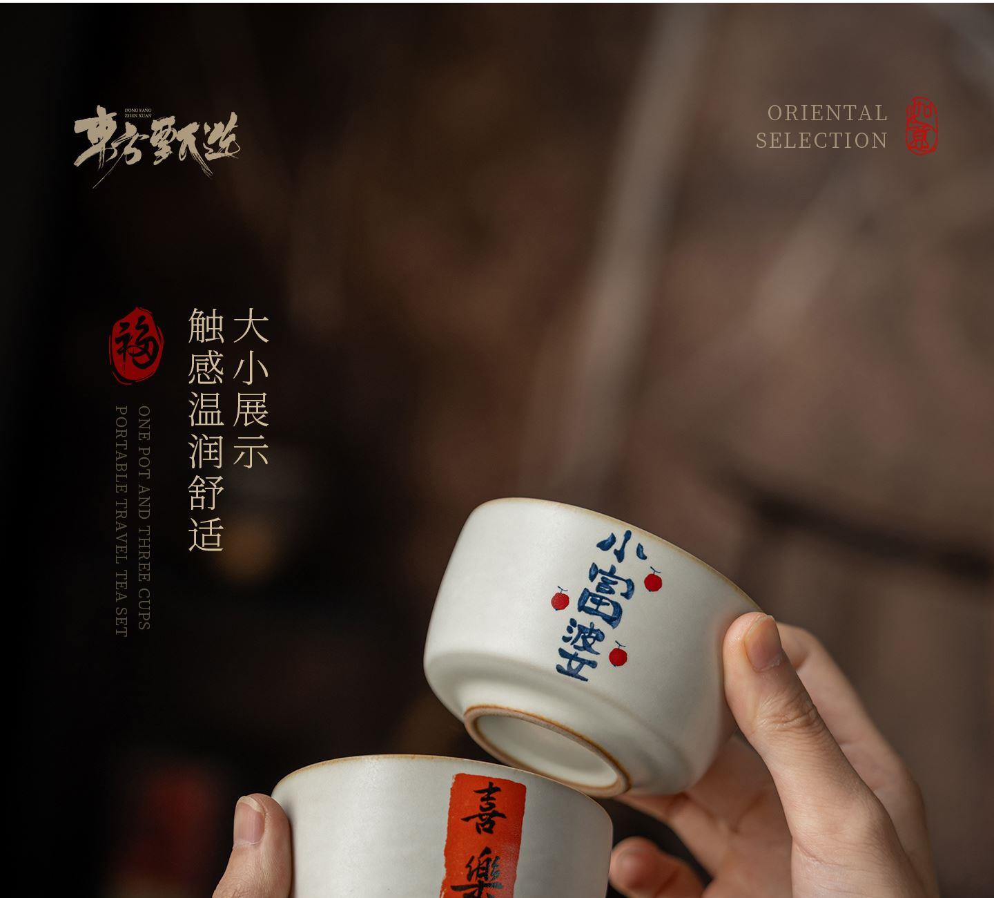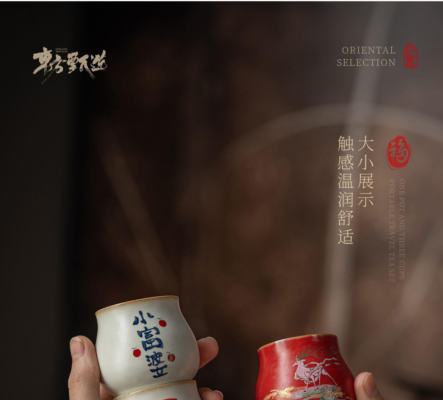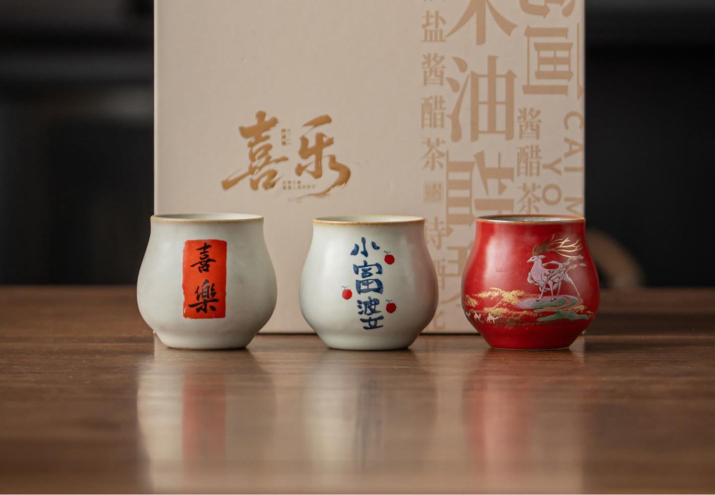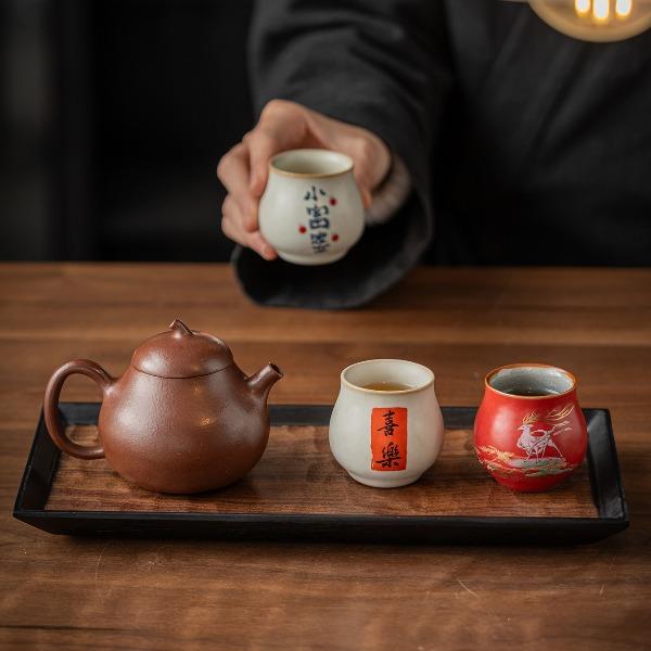 配置:茶杯*3, 尺寸:富贵吉祥杯7.8*4.7cm 容量100ml, 罗汉三星杯5.4*5.1cm 容量55ml, 礼盒:17*11.8*19cm。