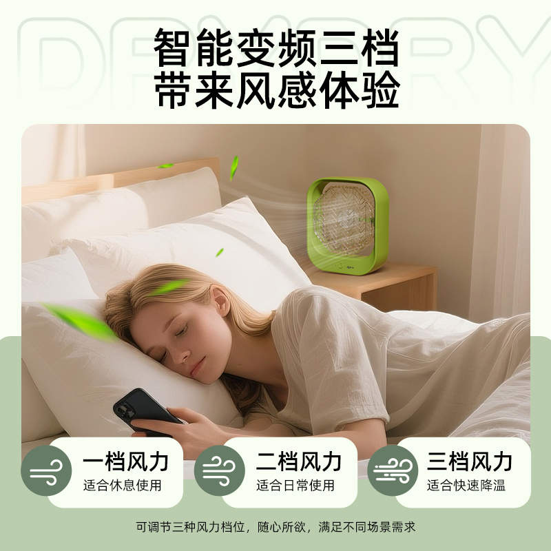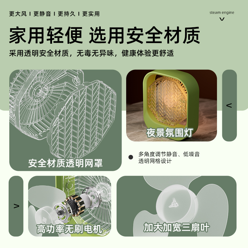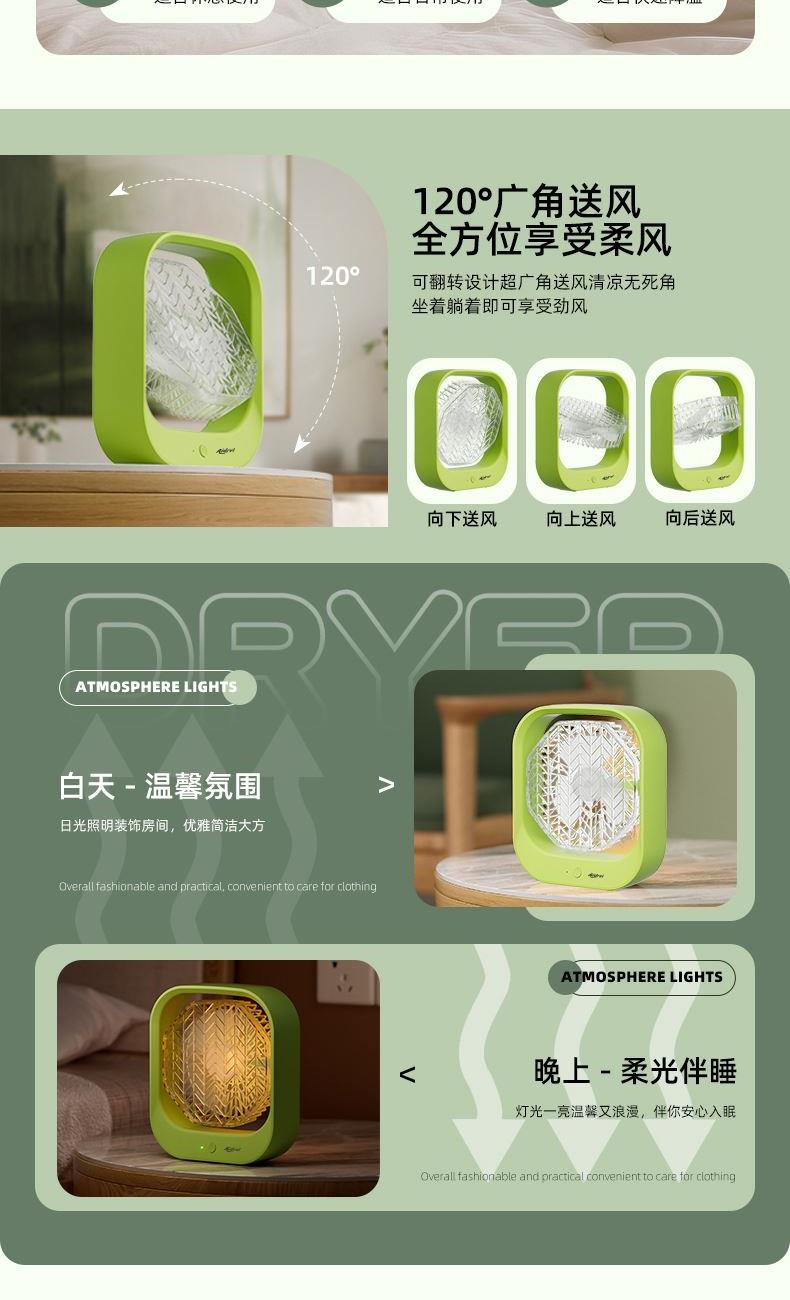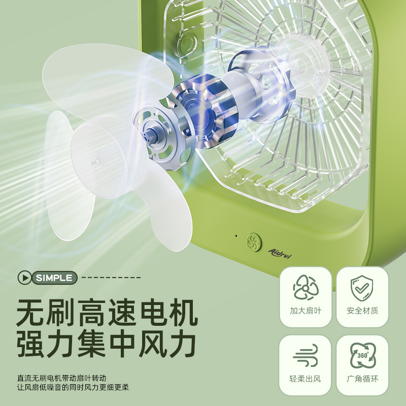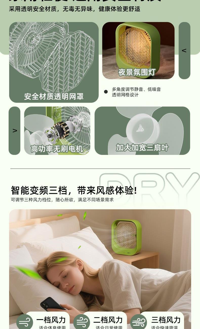 产品功率:5W 产品档位:3档风速 供电接口:TYPE-C 辅助功能:氛围小夜灯 电池容量:1200MA 产品颜色:叶绿色 产品尺寸:23x20x6.5cm 彩盒尺寸:25x22X7.5cm 外箱尺寸:62X44.5x51.5cm 3档调节,柔风强风循环空气任你调; 氛围小夜灯设计,柔光伴睡; 涡轮高速风,轻音低噪给你安静的陪伴; 加大加宽扇叶,风力集中,广角循环; 内置电池,持久续航,随身携带,凉爽一夏