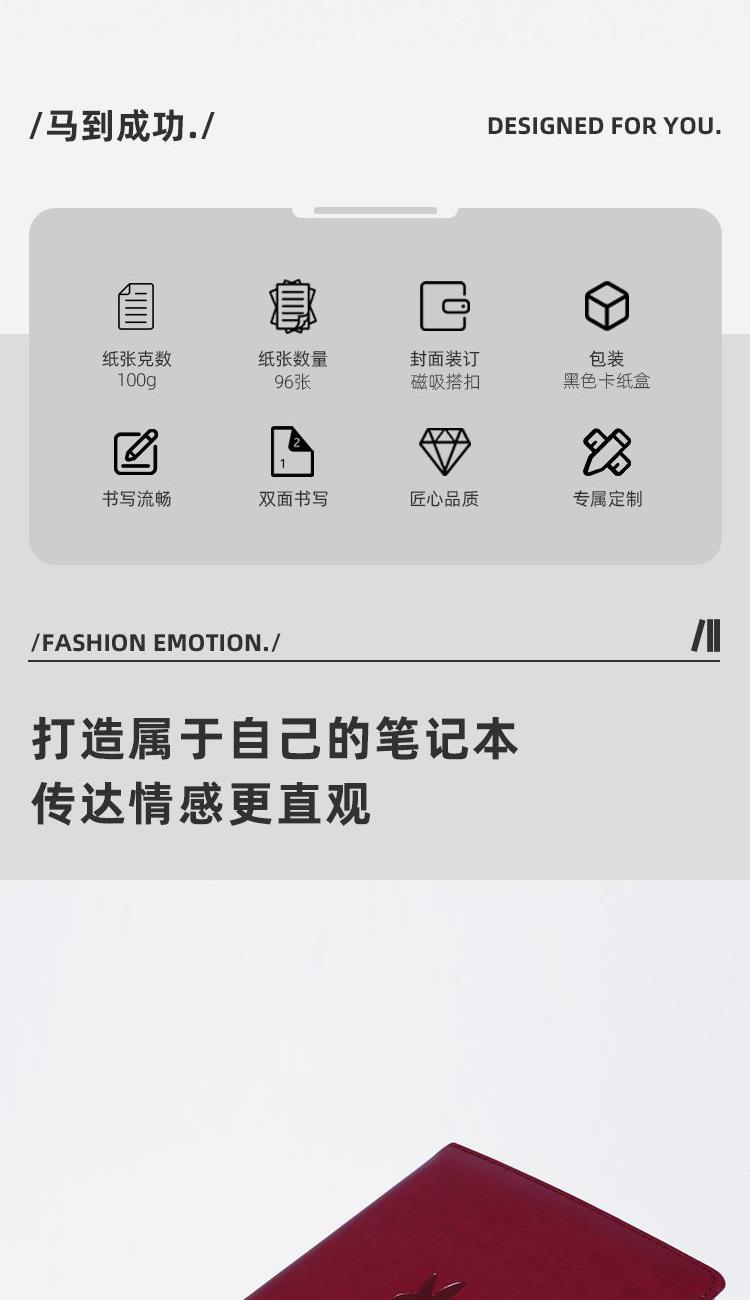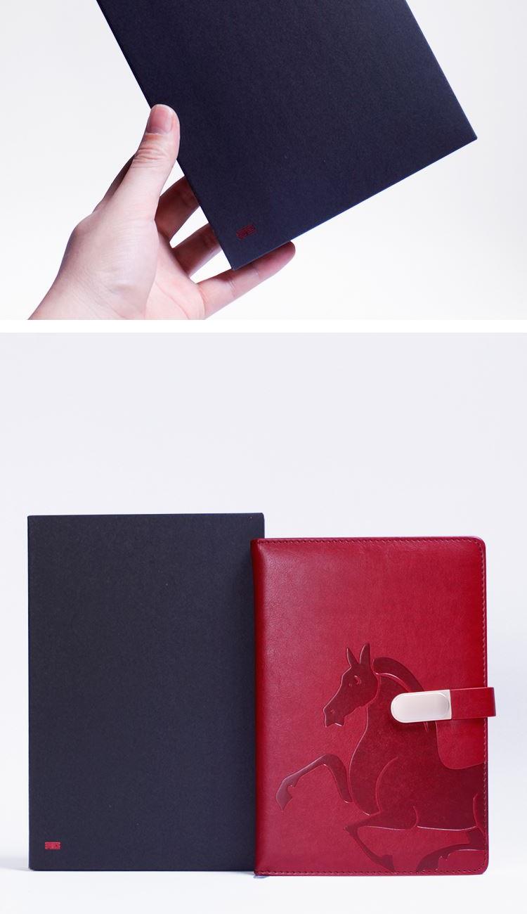 配置 记事本*1 黑卡纸盒*1 材质 变色皮革 100克太阳米黄96张 定制工艺 激光 镭射 马年专属版 尺寸 笔记本 :145*210mm 礼盒:230*152*28mm
