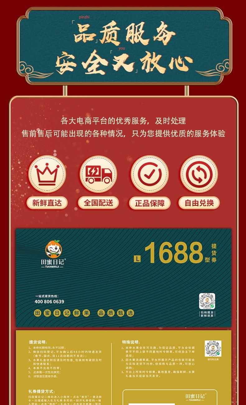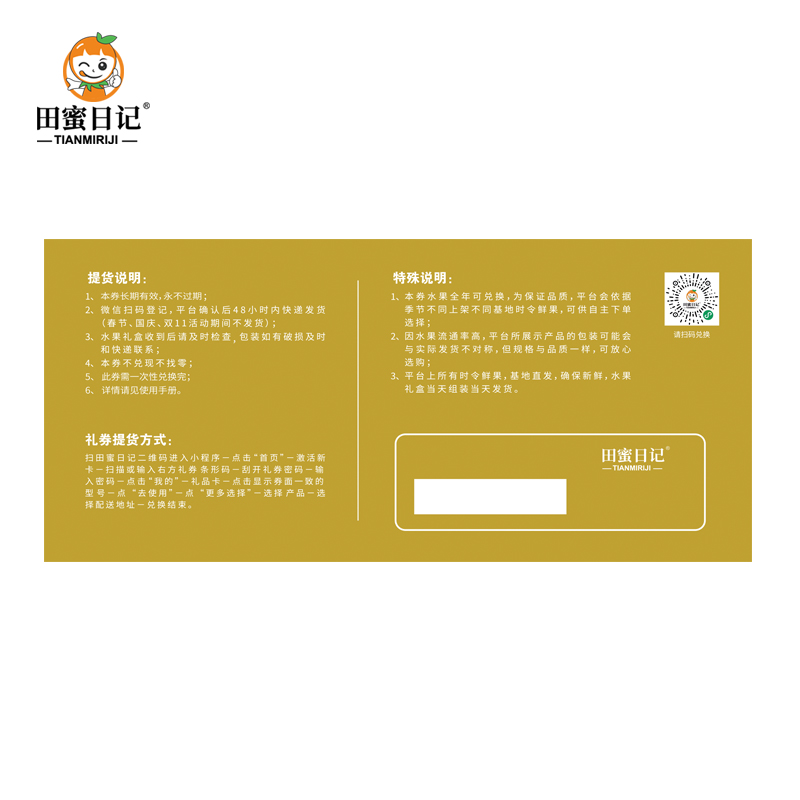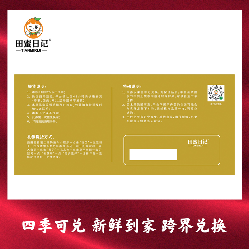 田蜜日记专业给各综合性平台、礼品公司、卡册公司等渠道提供全年水果一件代发及节假日项目集采业务,目前已对接了如:得力、史泰博、齐心等三百多个平台及渠道,整年水果单品丰富,可开专票、可授权、提供京东比价链接、提供主图详情页,同时发行全国通用,全年可自由兑换的田蜜日记水果提货券,全国免费配送到家,长期有效,售后全包
