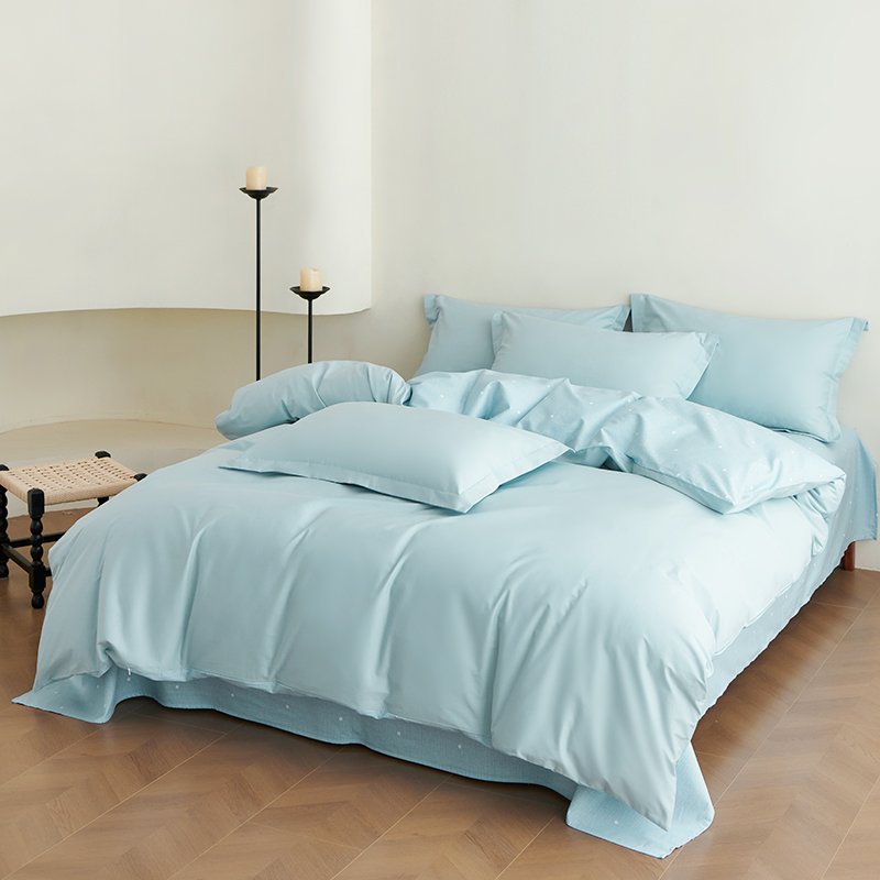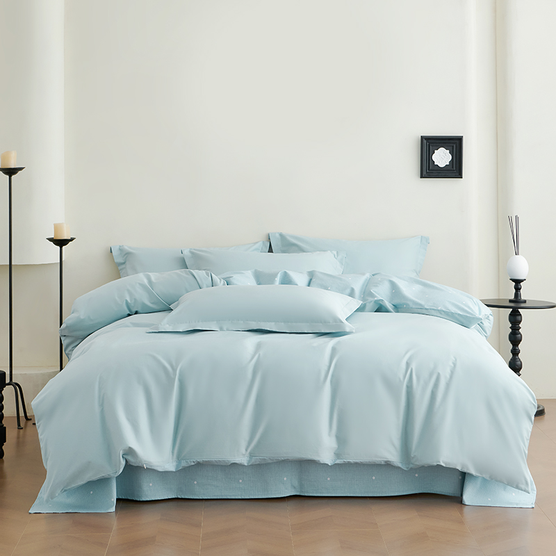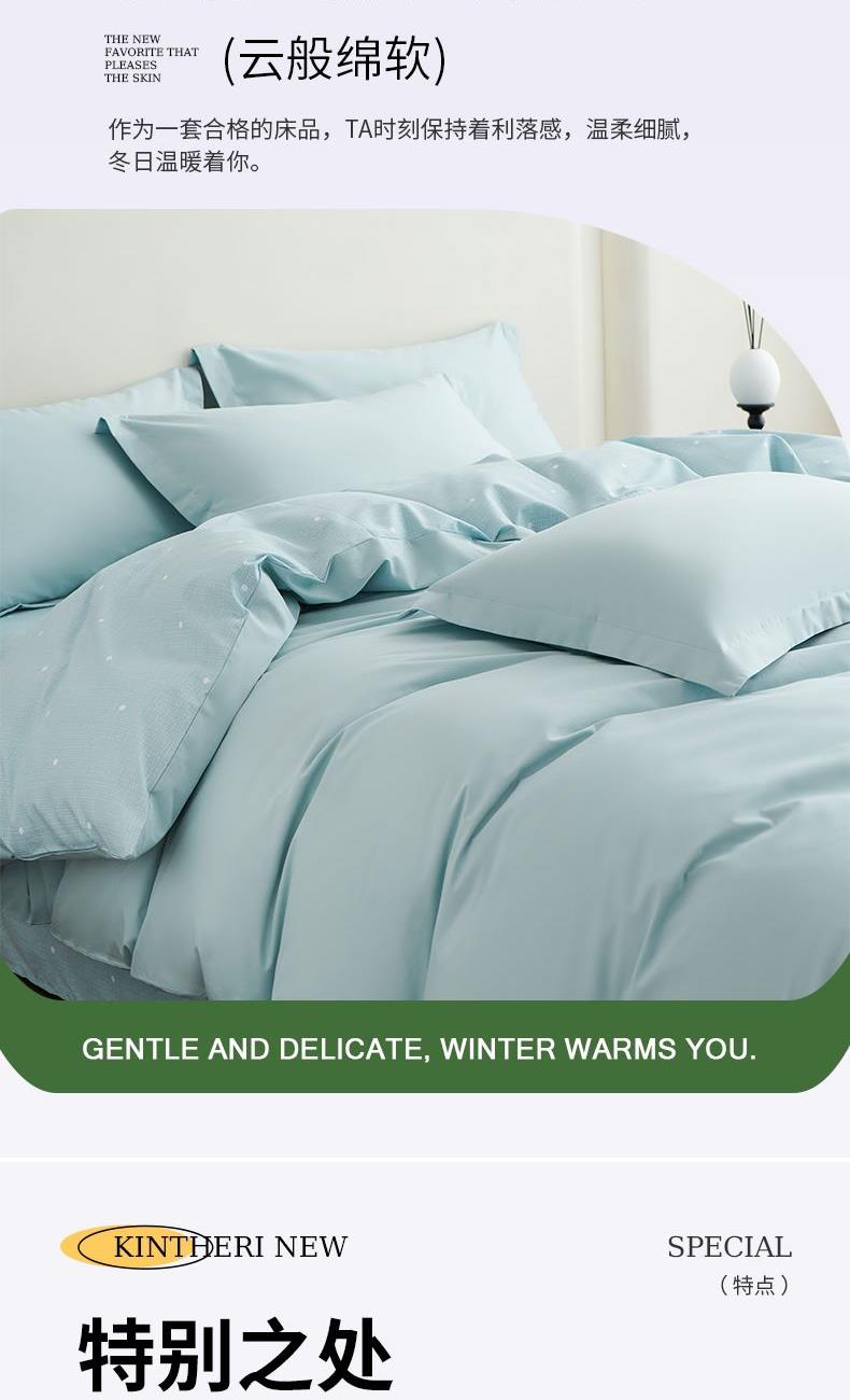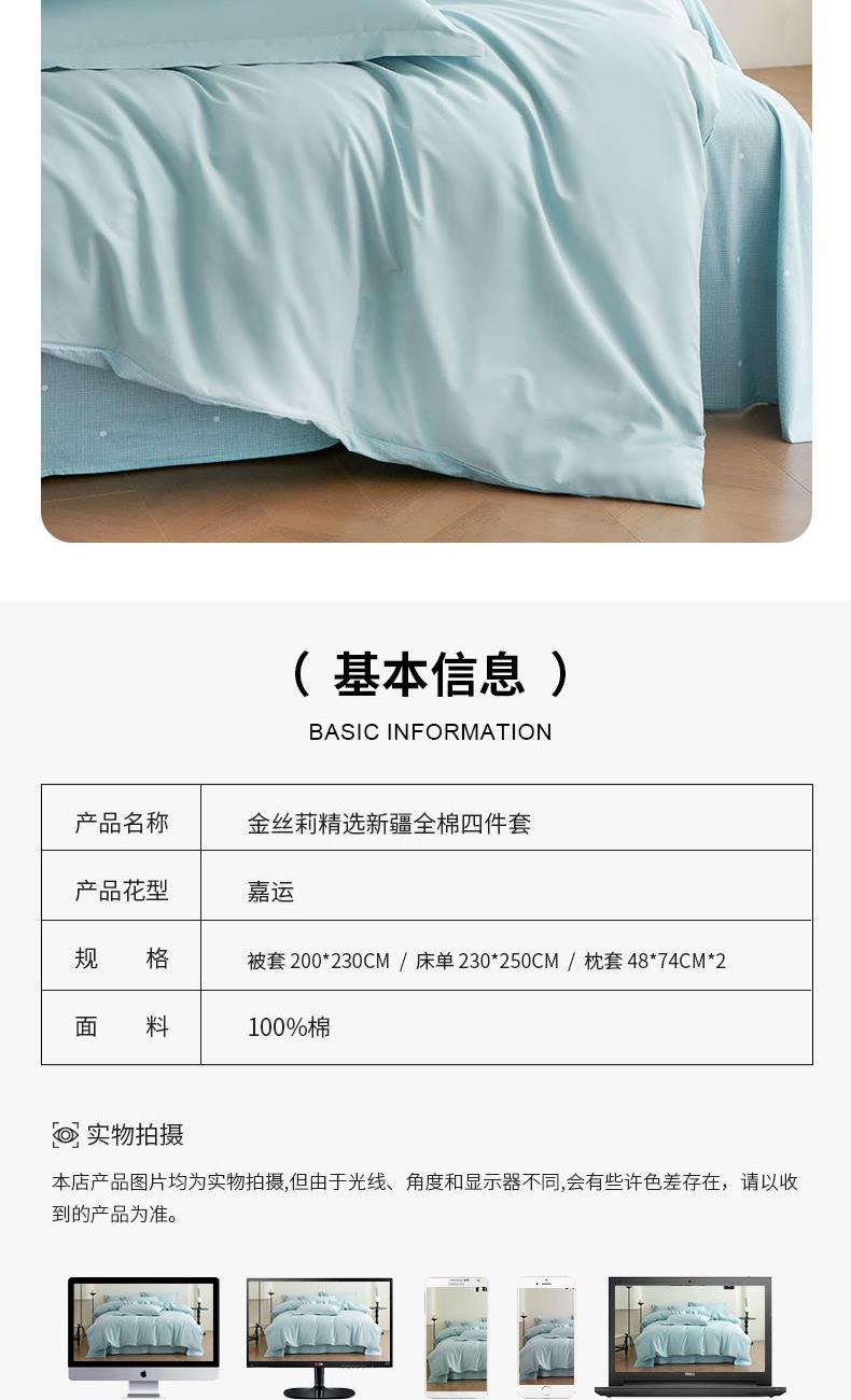花 型:嘉运 面 料:全棉 规 格:被套 200×230cm 床单 230×250cm 枕套 48×74cm×2 采用新疆棉全棉活性贡缎印花面料,纱支更细,面料超柔软,透气舒适,环保染料印花技术,刺绣精美,彰显高贵品质感,富有丝绸光泽优雅,探索柔软、裸感睡眠值得你拥有。
