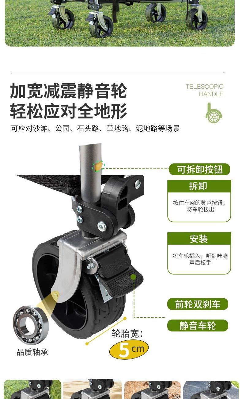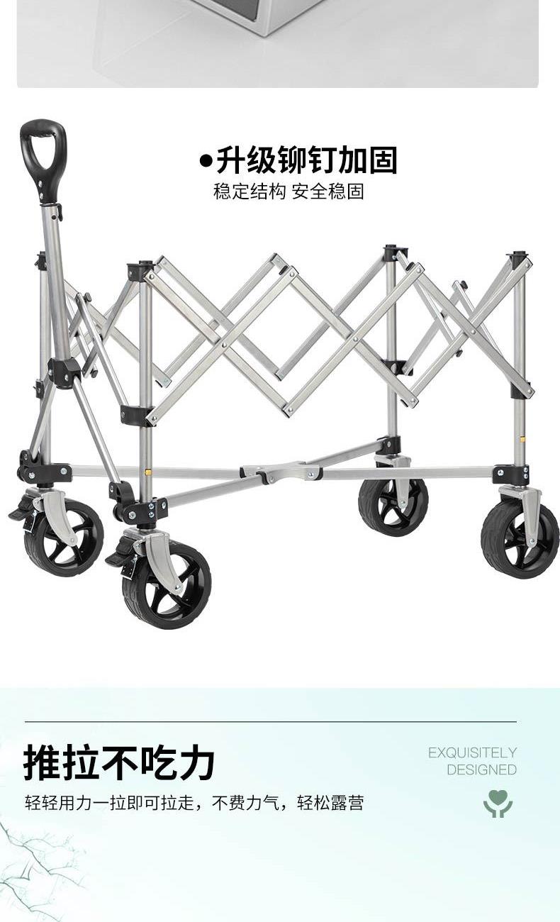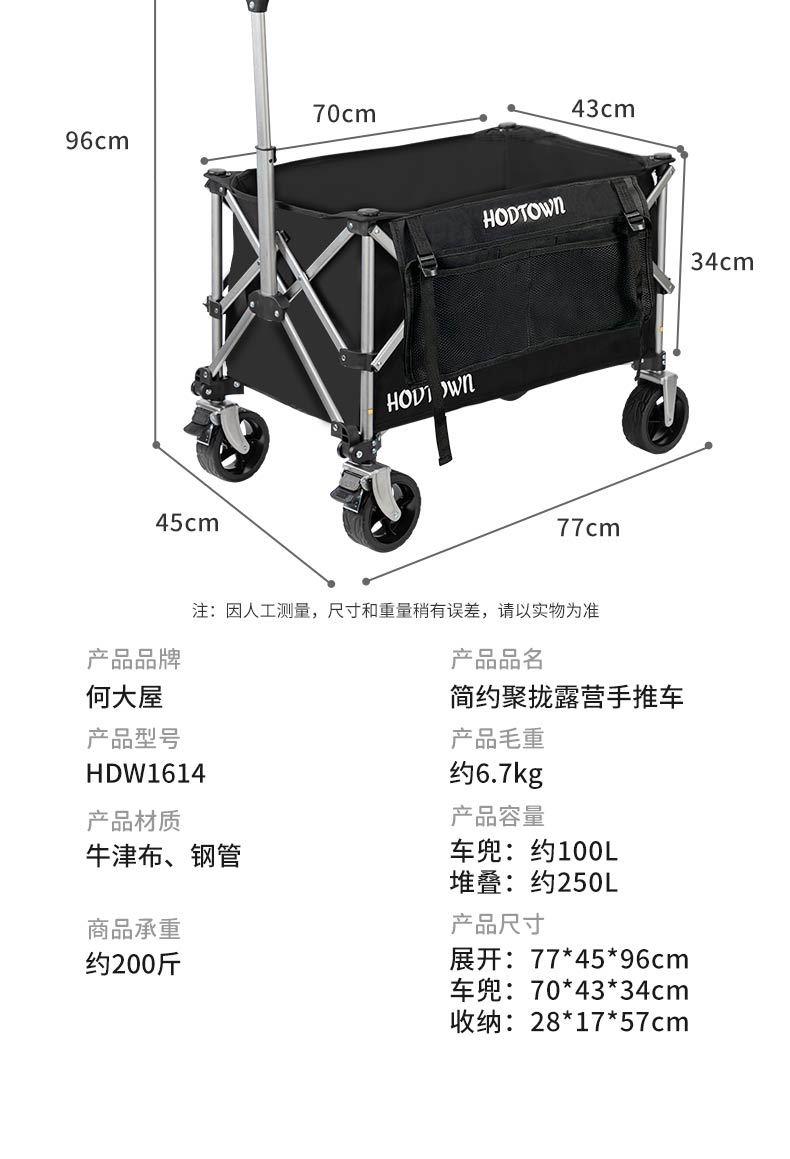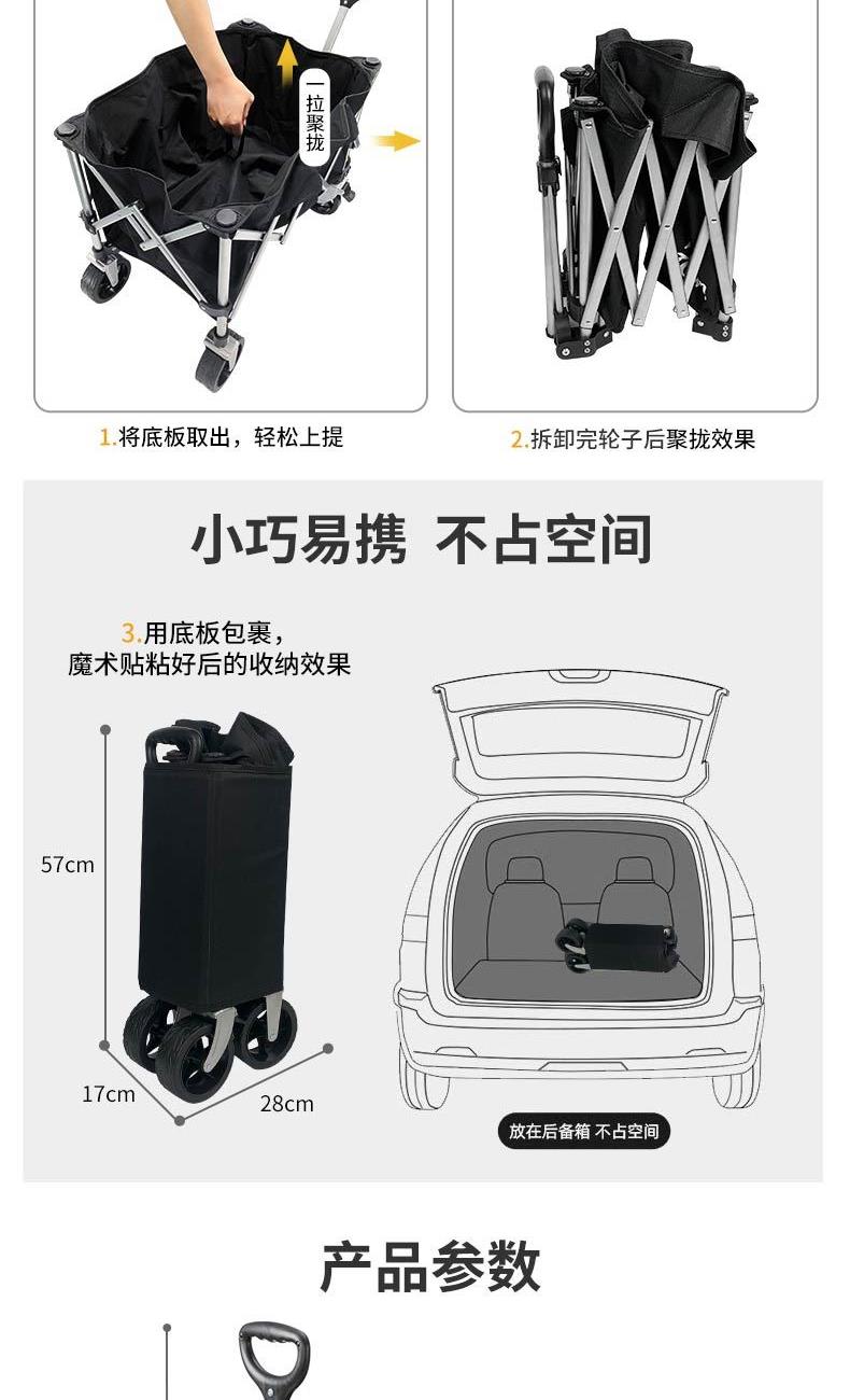 材质:600D牛津布、钢管 毛重:6.7kg 产品尺寸:车兜:70*43*34cm、 展开:77*45*96cm、收纳:28*17*57cm 容量:约100L 承重:约100kg(均匀受力) 外箱尺寸:43*19*33cm 聚拢收纳不占空间,户外携带更方便 可调节手柄,灵活便捷拖,阻尼把手,松手不落地 360°万向车轮,转弯随心操控灵活转向省心省力;可拆卸越野大轮,适用多种地形 前轮带刹车片 600D牛津布,耐磨,加厚面料更抗压,坚韧耐用 置物侧兜,空间大,易存储,更方便