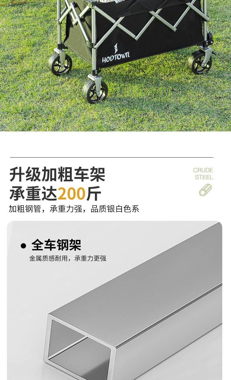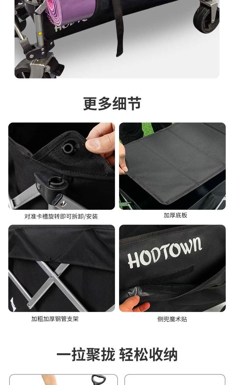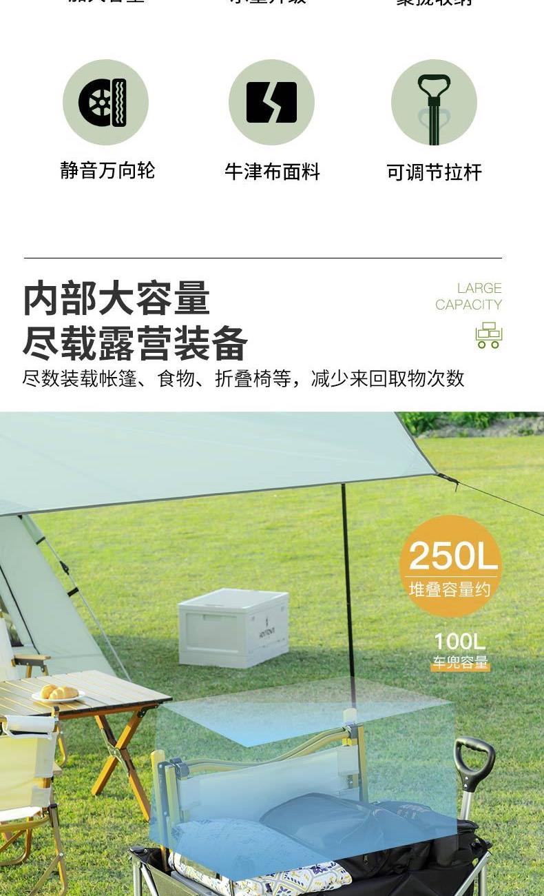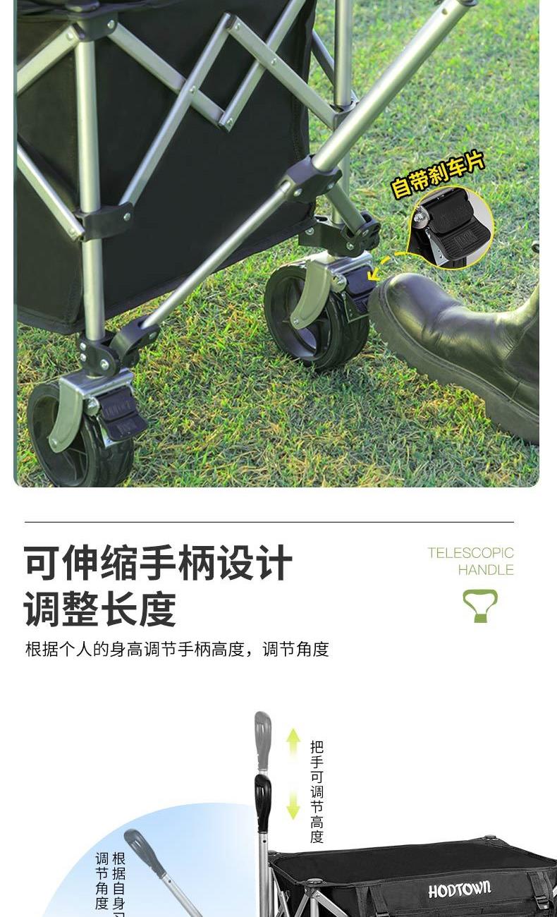 材质:600D牛津布、钢管 毛重:6.7kg 产品尺寸:车兜:70*43*34cm、 展开:77*45*96cm、收纳:28*17*57cm 容量:约100L 承重:约100kg(均匀受力) 外箱尺寸:43*19*33cm 聚拢收纳不占空间,户外携带更方便 可调节手柄,灵活便捷拖,阻尼把手,松手不落地 360°万向车轮,转弯随心操控灵活转向省心省力;可拆卸越野大轮,适用多种地形 前轮带刹车片 600D牛津布,耐磨,加厚面料更抗压,坚韧耐用 置物侧兜,空间大,易存储,更方便
