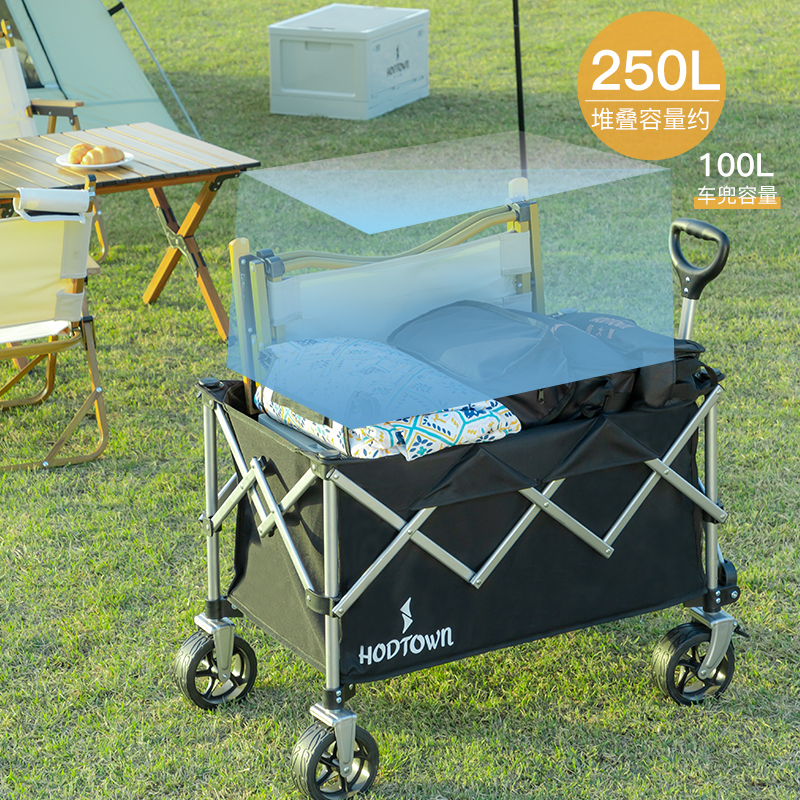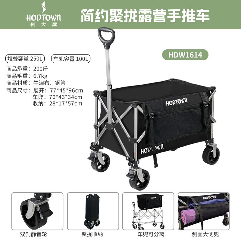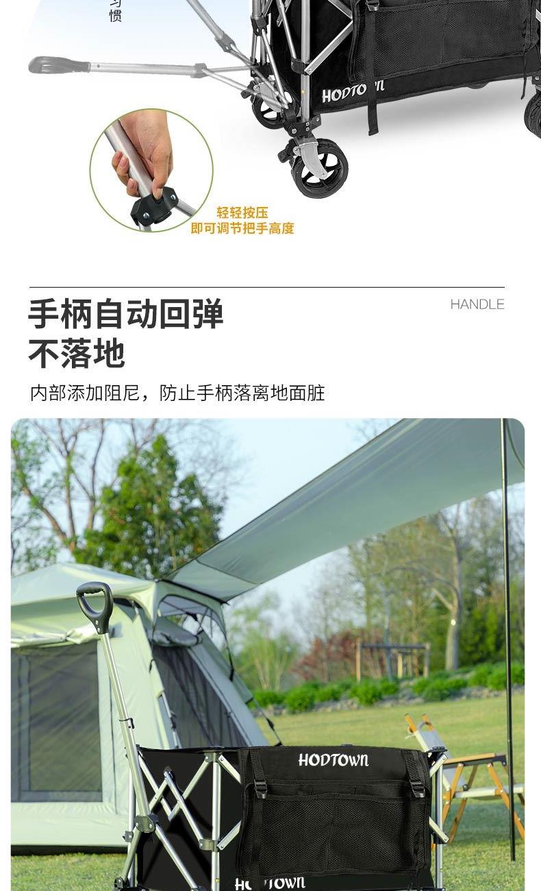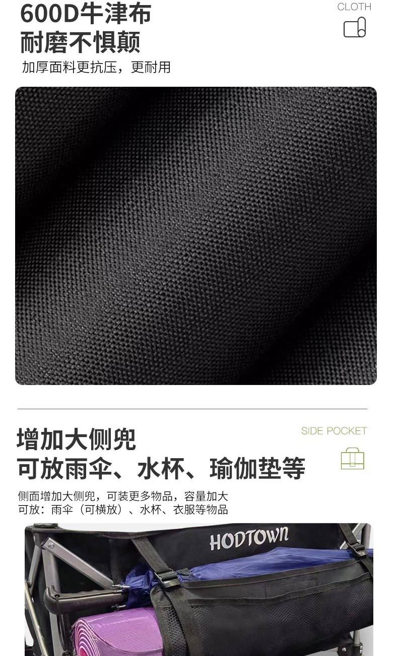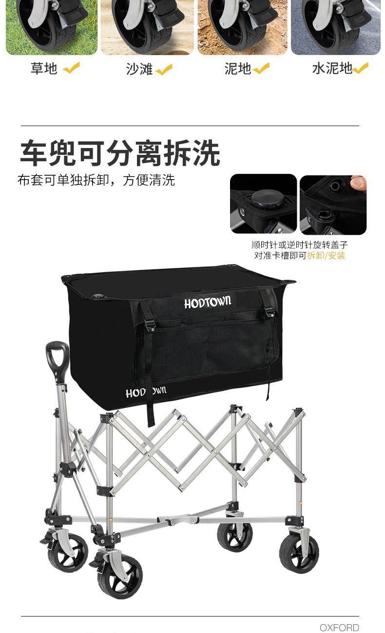 材质:600D牛津布、钢管 毛重:6.7kg 产品尺寸:车兜:70*43*34cm、 展开:77*45*96cm、收纳:28*17*57cm 容量:约100L 承重:约100kg(均匀受力) 外箱尺寸:43*19*33cm 聚拢收纳不占空间,户外携带更方便 可调节手柄,灵活便捷拖,阻尼把手,松手不落地 360°万向车轮,转弯随心操控灵活转向省心省力;可拆卸越野大轮,适用多种地形 前轮带刹车片 600D牛津布,耐磨,加厚面料更抗压,坚韧耐用 置物侧兜,空间大,易存储,更方便