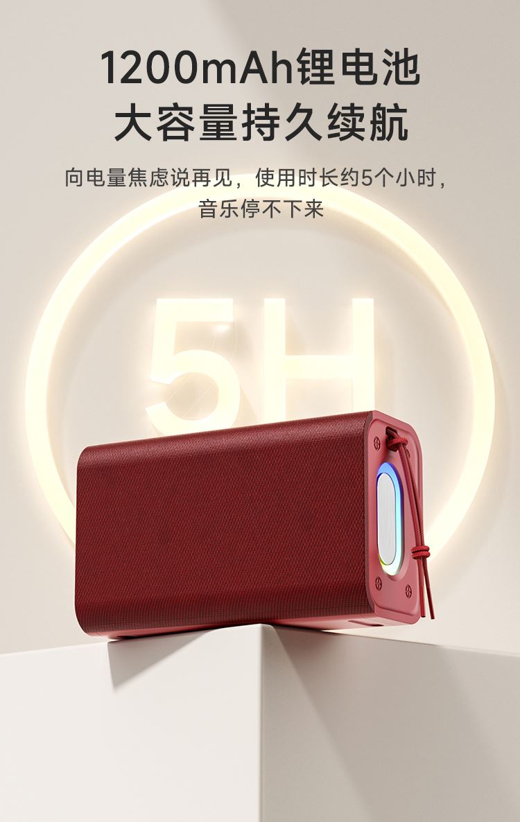 额定输入:DC 5V-1A 蓝牙版本:V5.3 输出功率:5W 连接距离:≥10米 电池容量:1200mAh 3.7V 播放时长:约5小时 材质:ABS+蒙布 大功率喇叭、360°震撼音效、减震喇叭,强大声波,低频精度高,还原声音的真实质感 预设彩色LED灯光效果,散发出时尚气息,满满的气氛感,视觉与听觉的双重享受 蓝牙传输稳定,声音清晰与控制同步,稳定流畅 1200mAh锂电池、大容量持久续航、向电量焦虑说再见,使用时长约5个小时,音乐停不下来