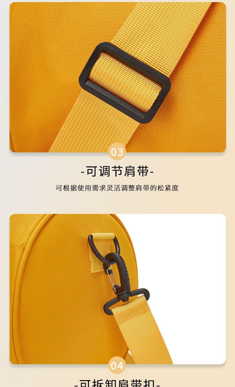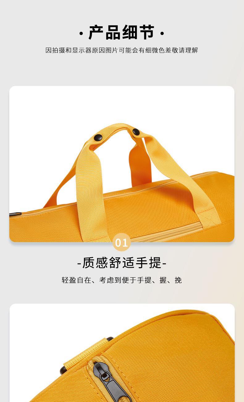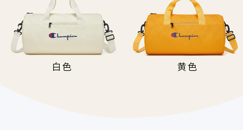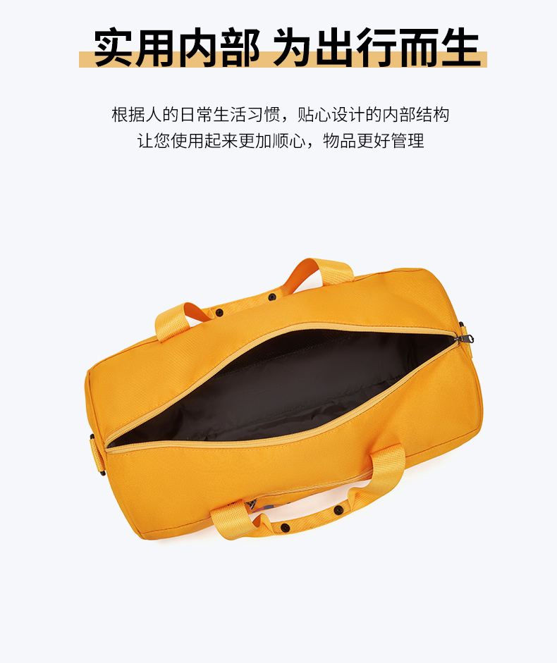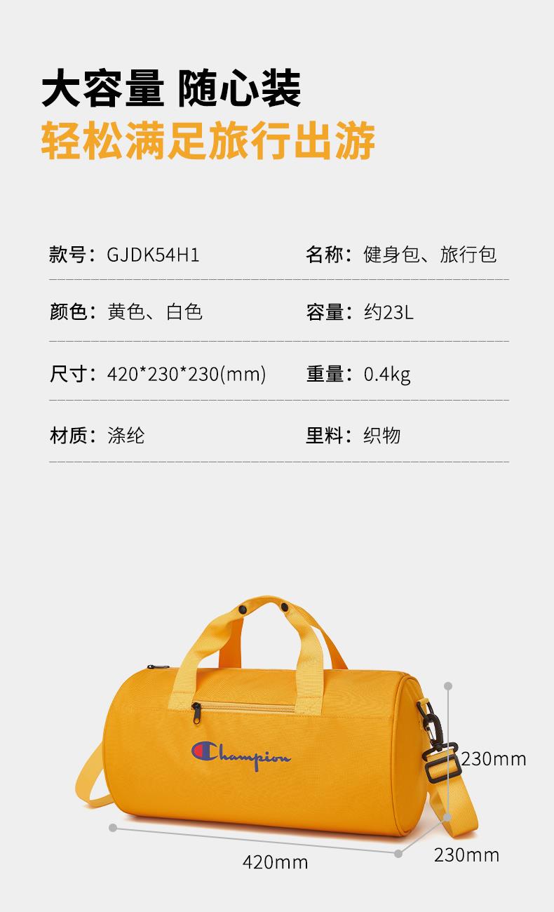 类别:旅行包 颜色:黄色/白色 面料:织物 里料:织物 闭合方式:拉链 尺寸:420*230*230mm 吊牌价 :230元 适用场景:日常包 上市时间:2025年秋季 类别:健身包 包袋大小:中包 适用人群:男女通用