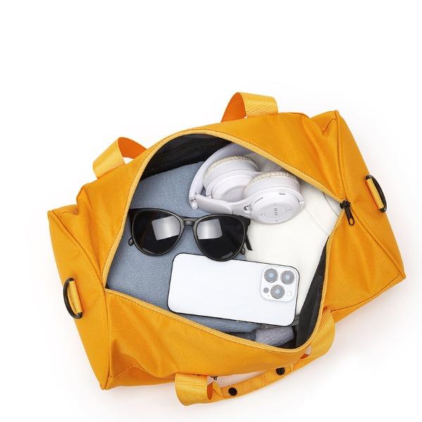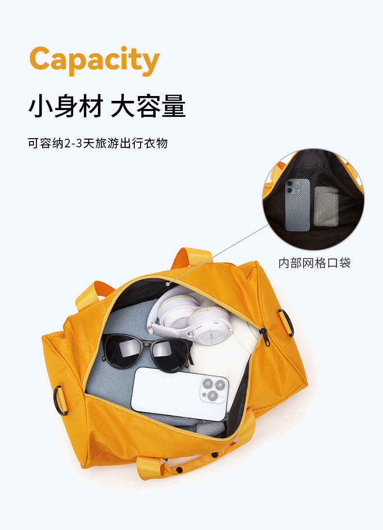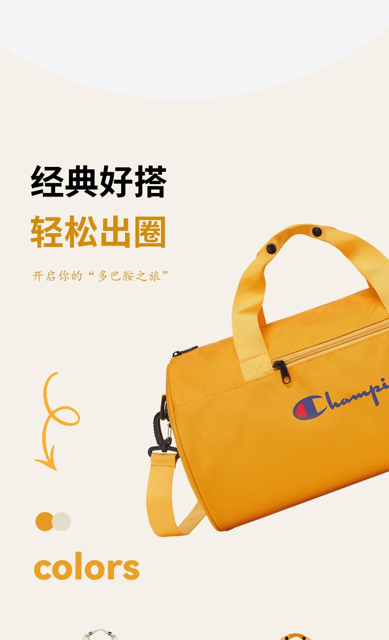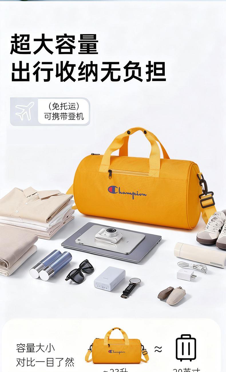 类别:旅行包 颜色:黄色/白色 面料:织物 里料:织物 闭合方式:拉链 尺寸:420*230*230mm 吊牌价 :230元 适用场景:日常包 上市时间:2025年秋季 类别:健身包 包袋大小:中包 适用人群:男女通用