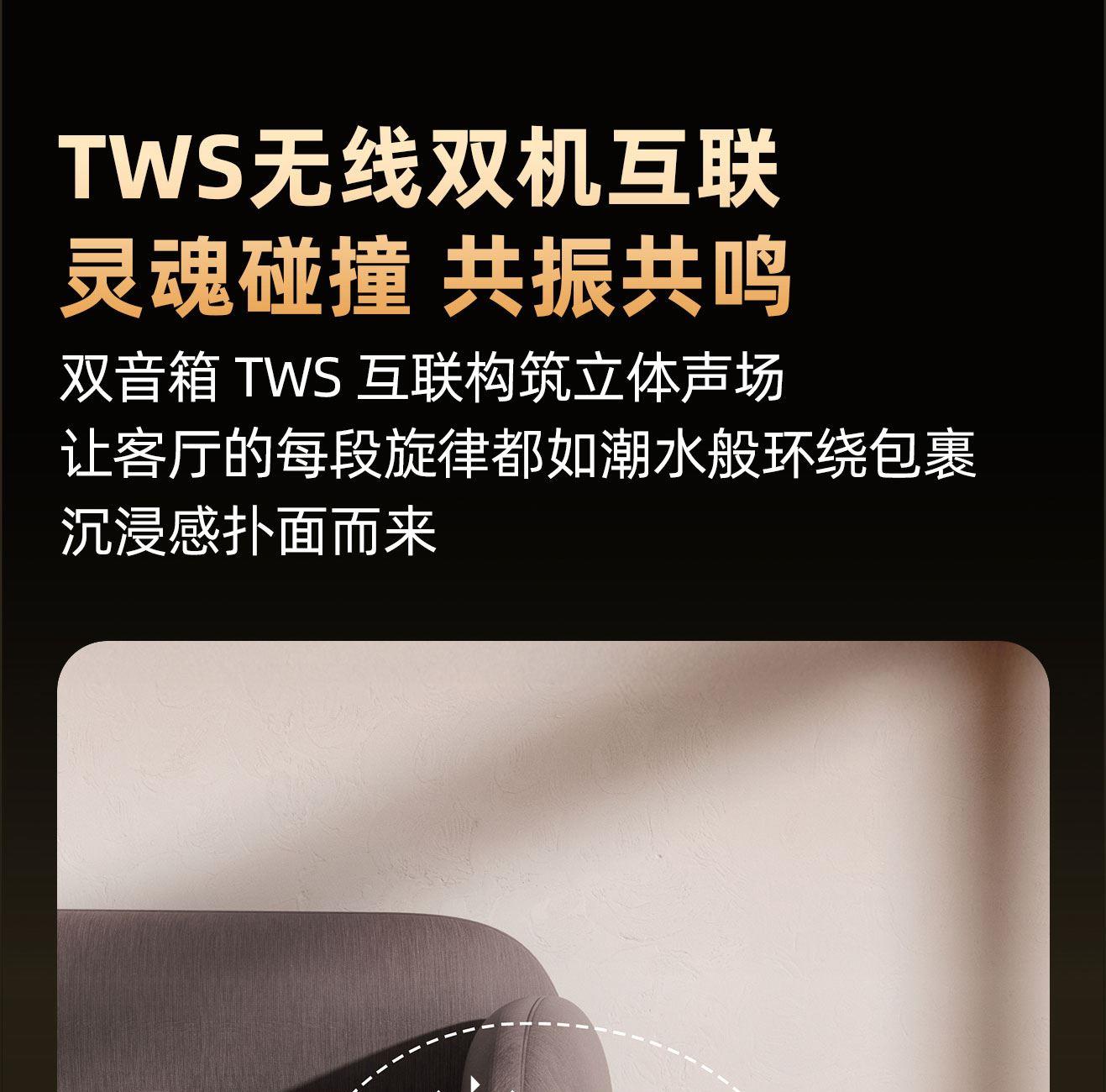 . 支持TWS互联功能,两台共享声音,双倍环绕立体声