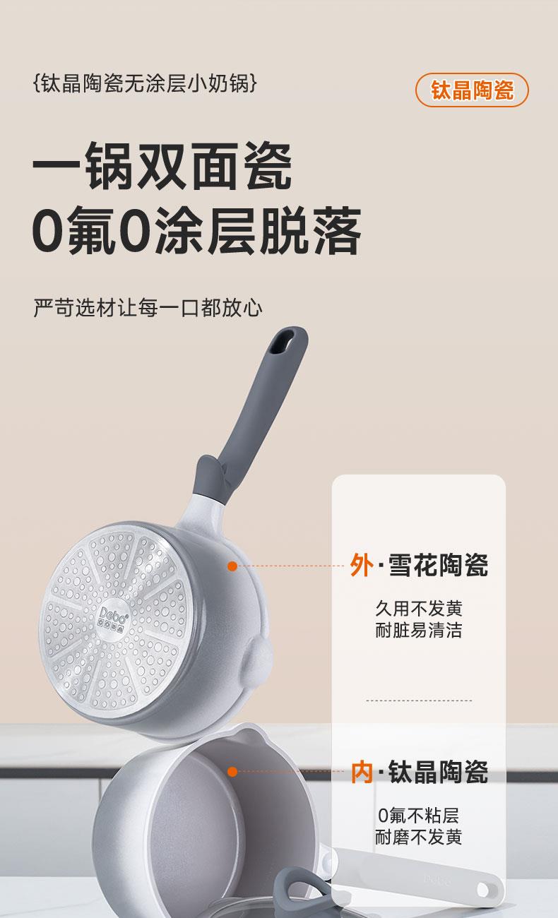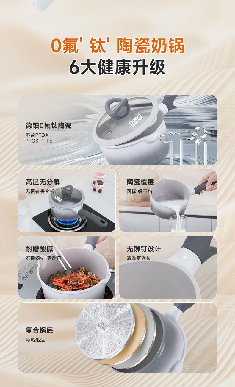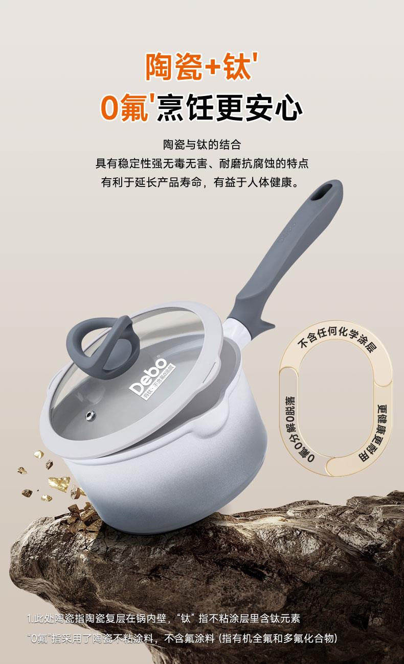 型号:DEP-980 口径:18cm 容量:2.2L 材质:铝合金 包装尺寸:430*130*235mm 配置:锅身*1、玻璃盖*1 1. 内钛外陶双面不粘,无惧各种易粘食材; 2. 有钛更健康,保持食材原汁原味; 3. 锅身双侧导流口设计,倒汤利落不外洒, 左右都顺手; 4. 独特的顶珠设计,可放置铲子, 保持台面干净整洁; 5. 好锅不挑灶,加厚复合锅底,适用更多炉灶。