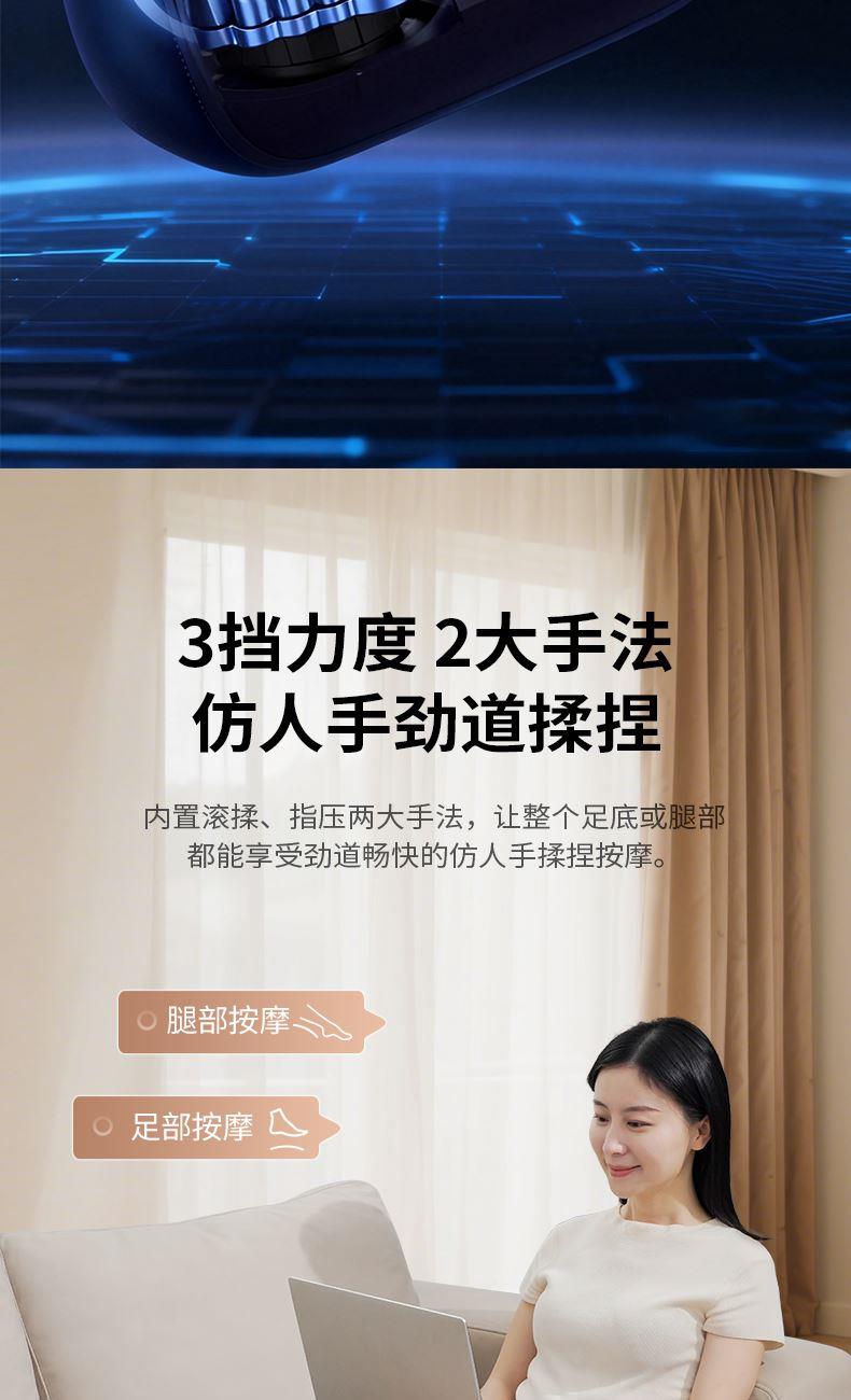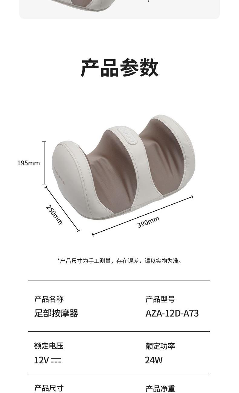 额定电压:12V 额定功率:24W 材 质:PU皮 创新“山”字型设计,足底,小腿,大腿,手臂均可灵活使用 一键启动,长辈轻松使用,简单操控,一键即可舒享按摩 三档力度,舒适随心掌控 3D按摩头,高低错落,仿人手揉捏,温感热敷,正反可转 轻音低噪,在享受按摩的同时又不打扰他人