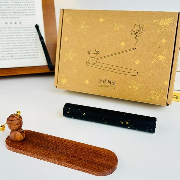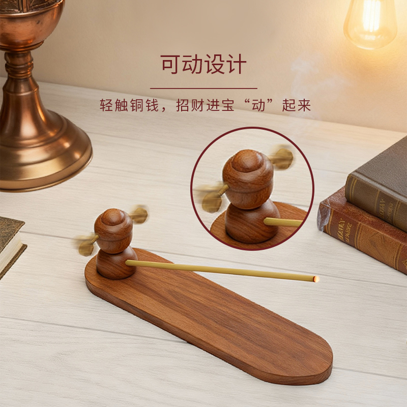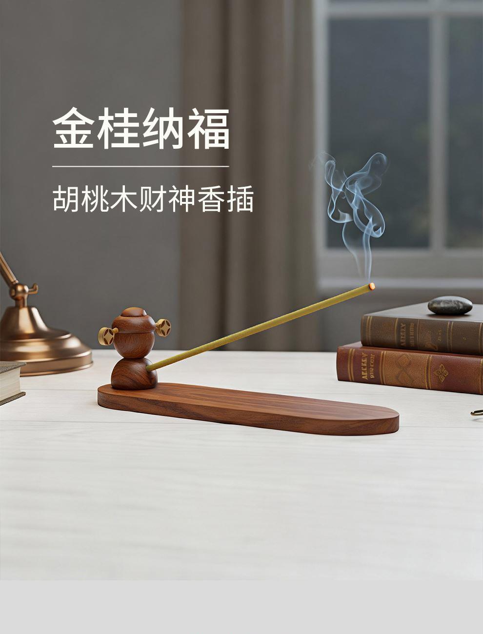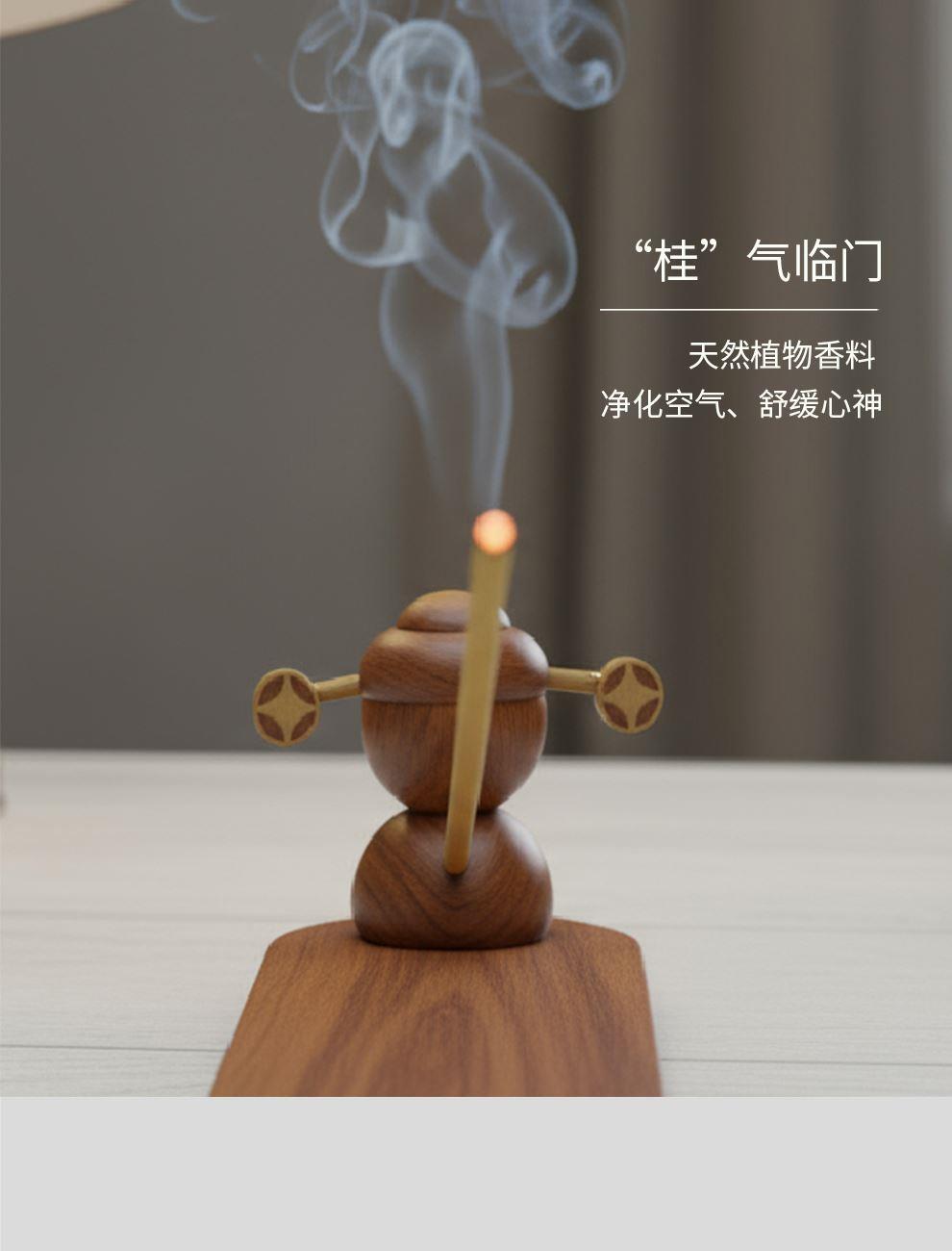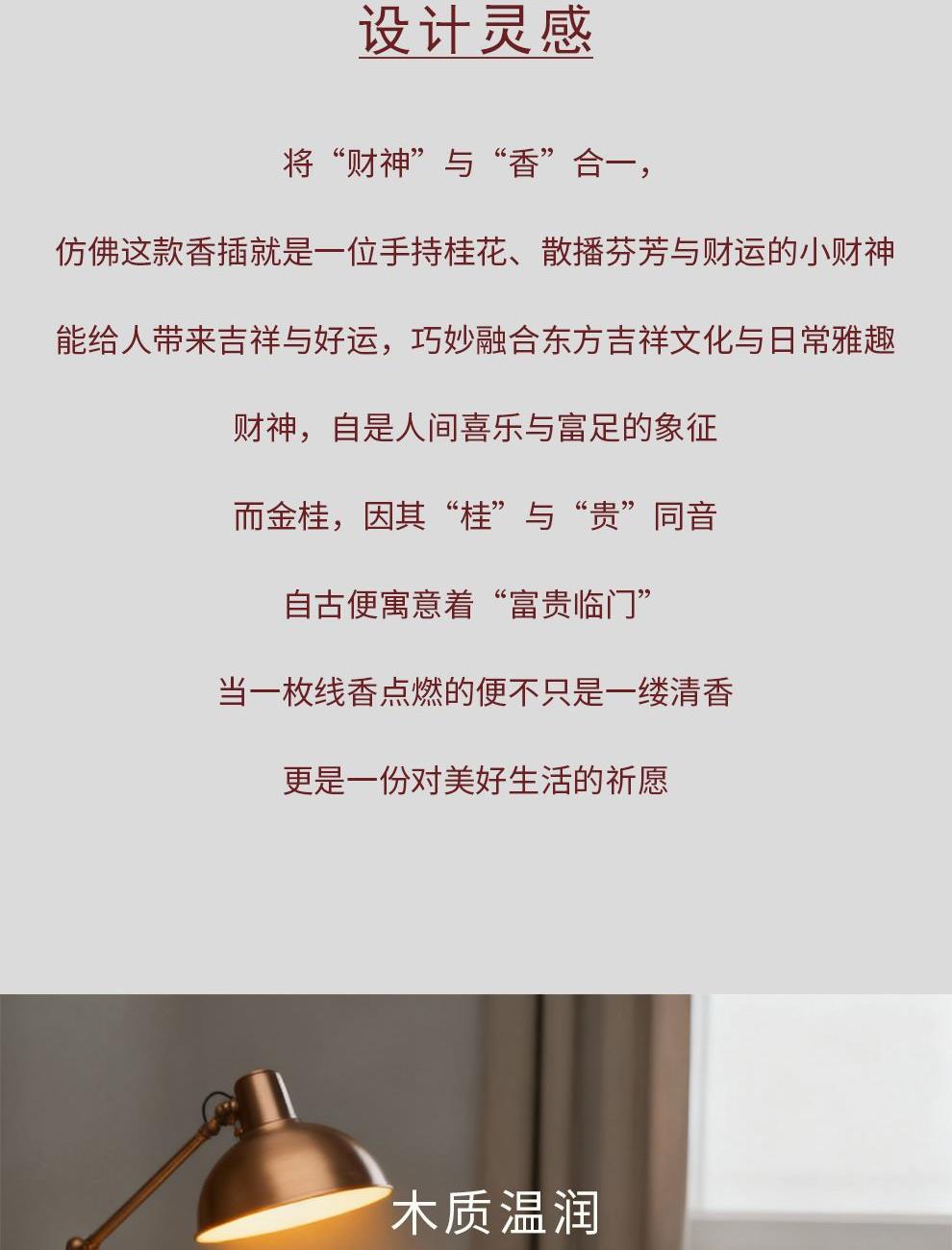 将“财神”与“香”合一,仿佛这款香插就是一位手持桂花、散播芬芳与财运的小财神能给人带来吉祥与好运,巧妙融合东方吉祥文化与日常雅趣。财神,自是人间喜乐与富足的象征;而金桂,因其“桂”与“贵”同音,自古便寓意着“富贵临门”。