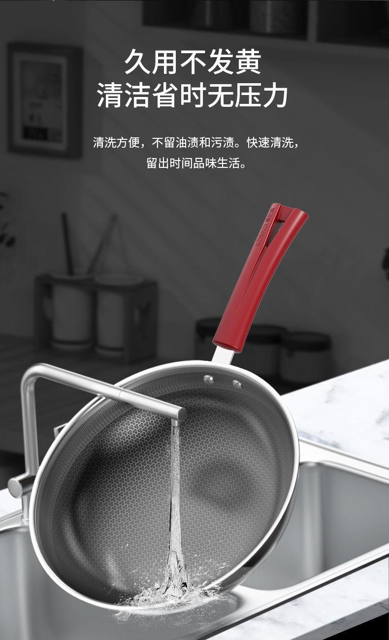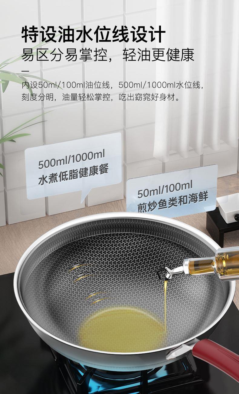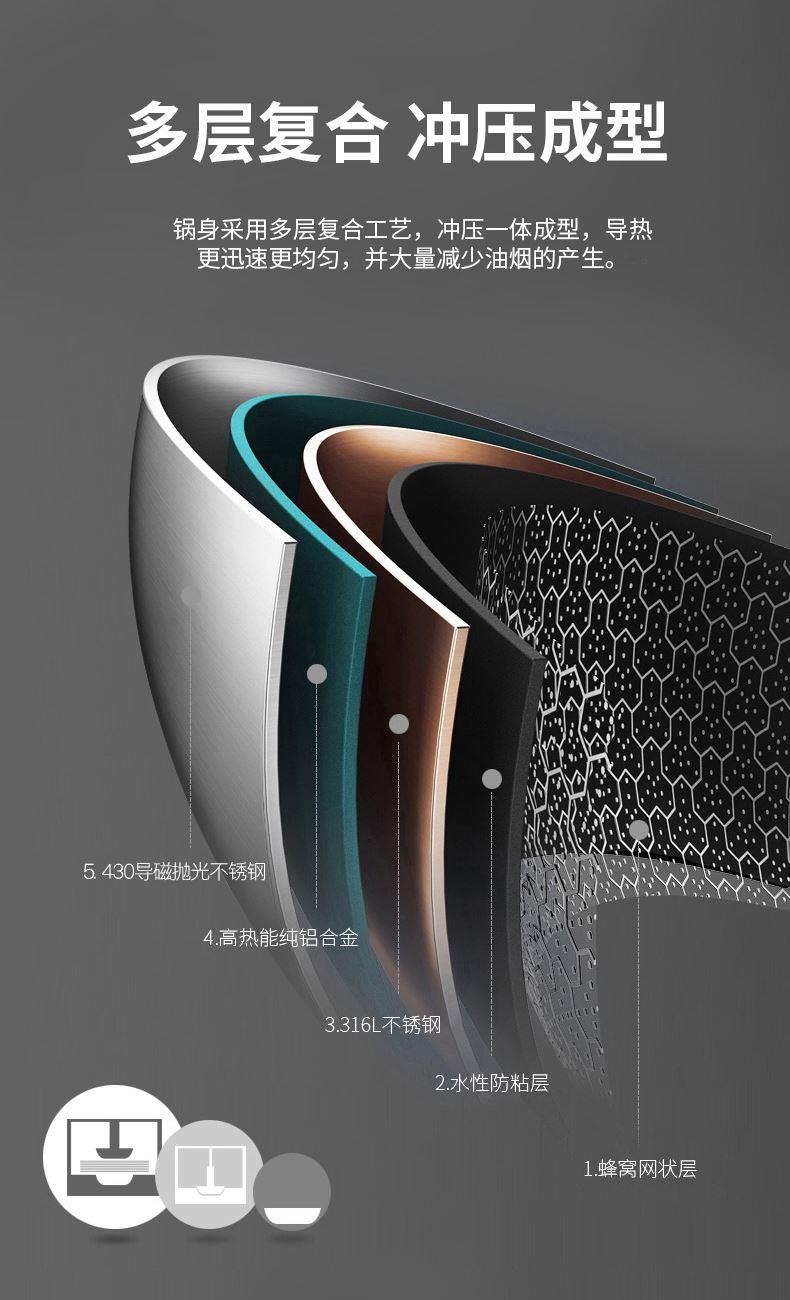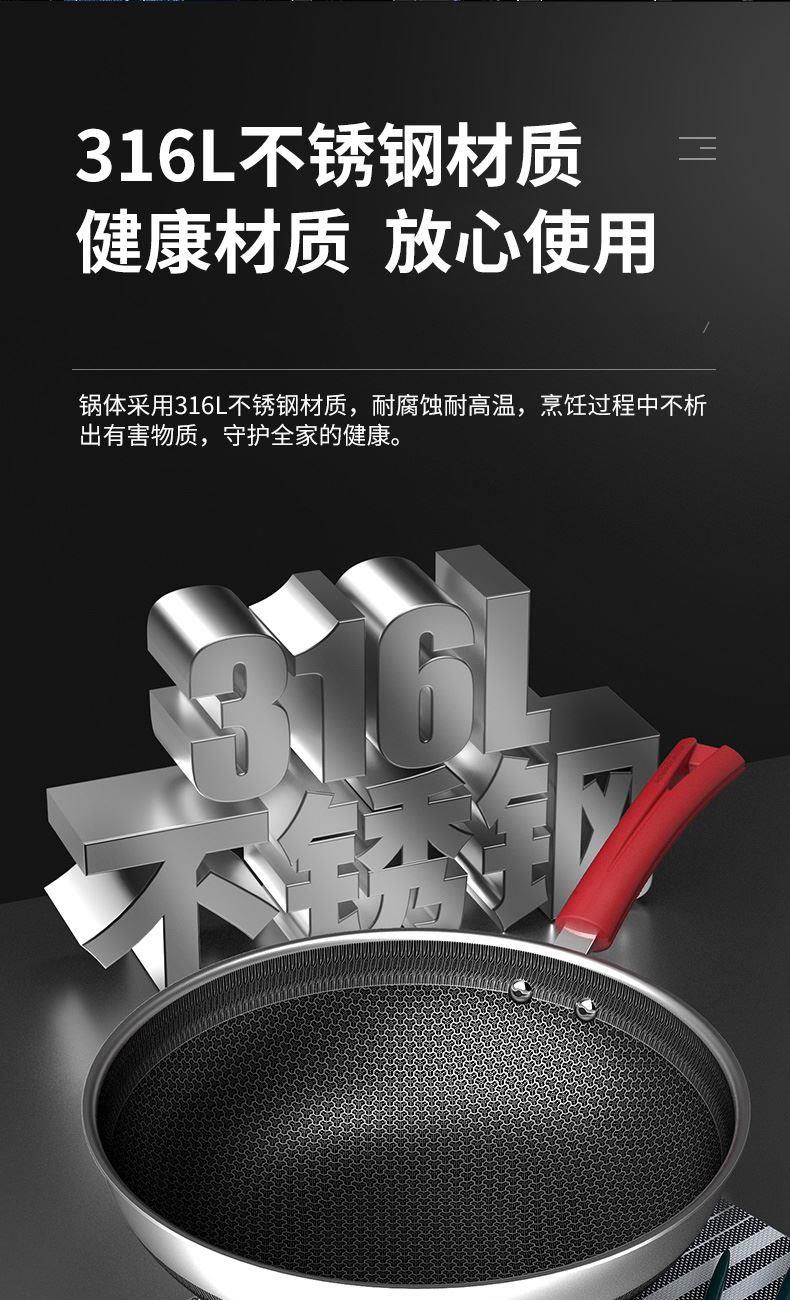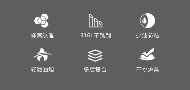 规格:32cm 重量:1.4kg 包装尺寸:56.5*36*69cm ◎锅体采用316L不锈钢材质,食品接触级材质,耐腐蚀性更强更耐用。烹饪过程中杜绝食材和铝的接触,为家人的健康安全护航。 ◎运用蚀刻工艺,在锅壁内蚀刻出精密凹凸纹理,防粘层仅覆盖纹理凹陷处,凸出部分构成一张蜂窝网状结构,减少食材和锅面的直接接触,防粘层不易脱落更耐用。 ◎特设油水位线,易区分,用量易掌控。微压气阀,安全防护,及时泄压,防止溢锅。 ◎同心圆结构浮雕纹理,导热迅速且均匀,锅底稳定性强,不易发黄变形,不惧剐蹭。不挑炉灶,燃气灶、电磁炉、电陶炉等都适用。 ◎多层复合结构,加厚耐凸锅底,热力附着锅底时受热更均匀。锅身冲压成型,结实耐用,无需过多担心久用变形等问题。