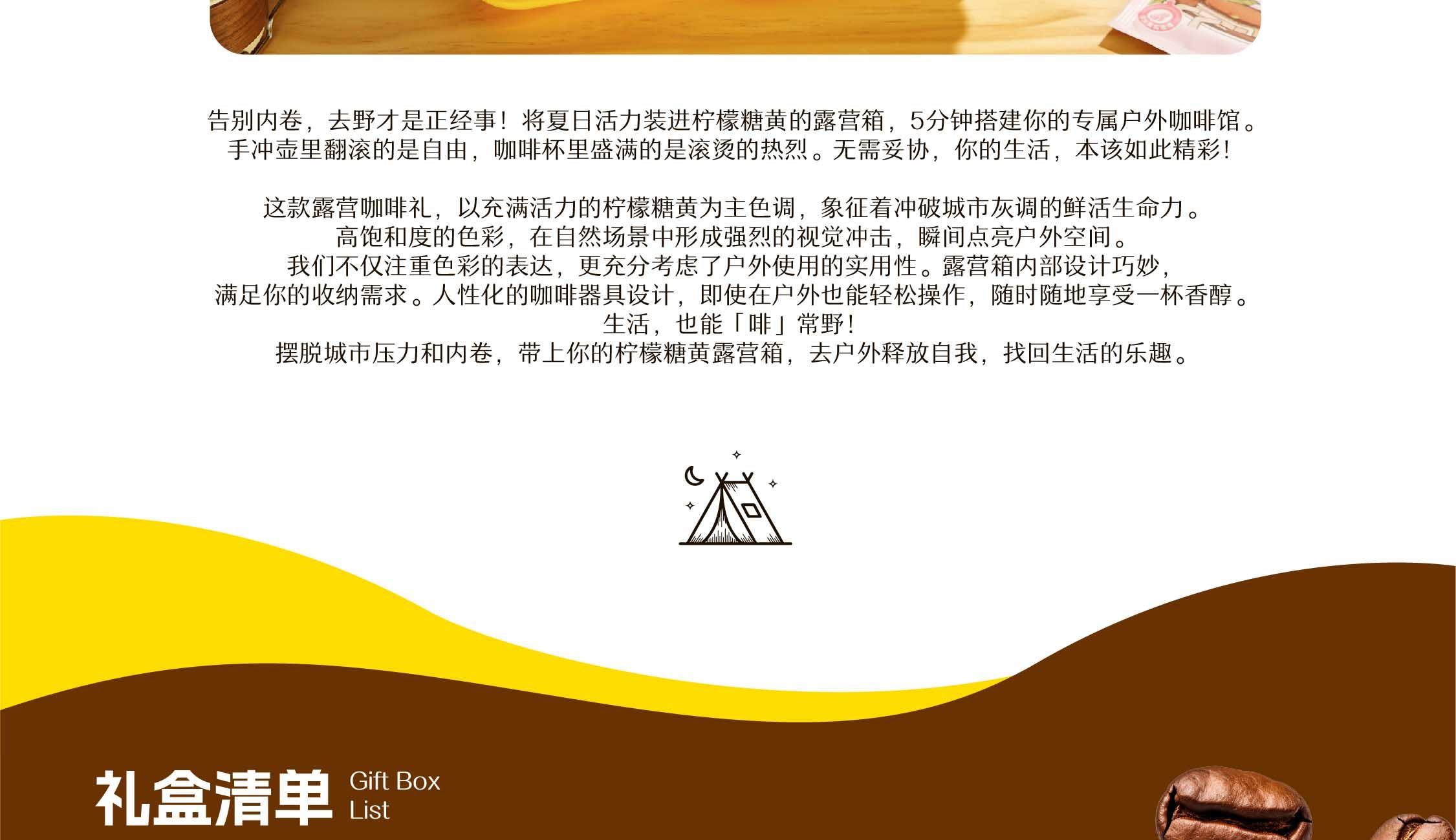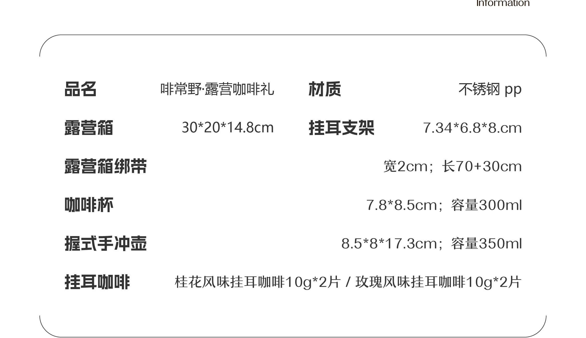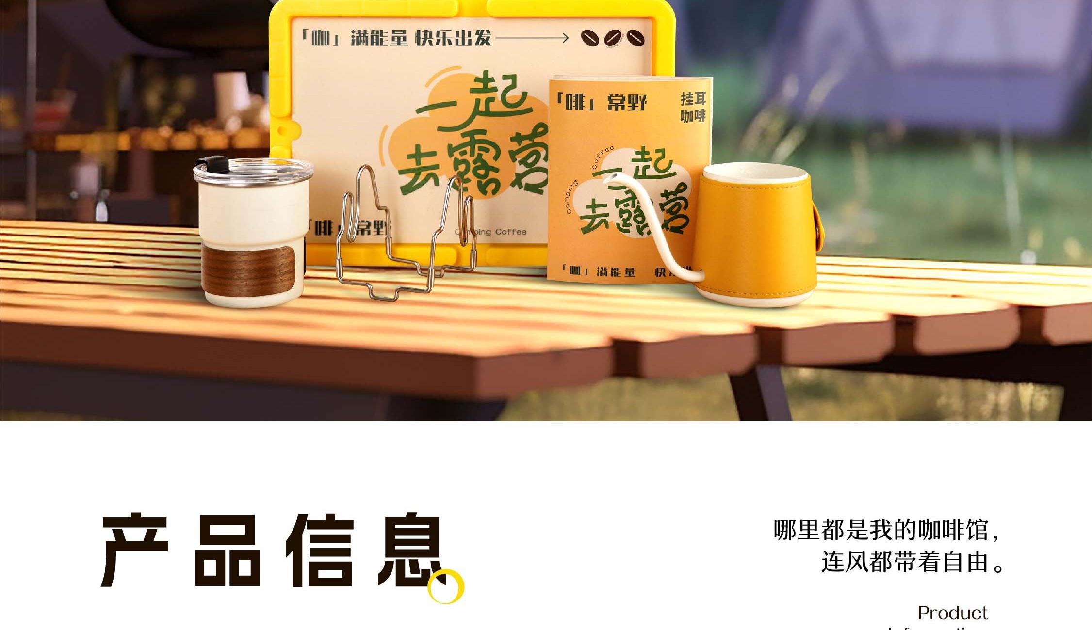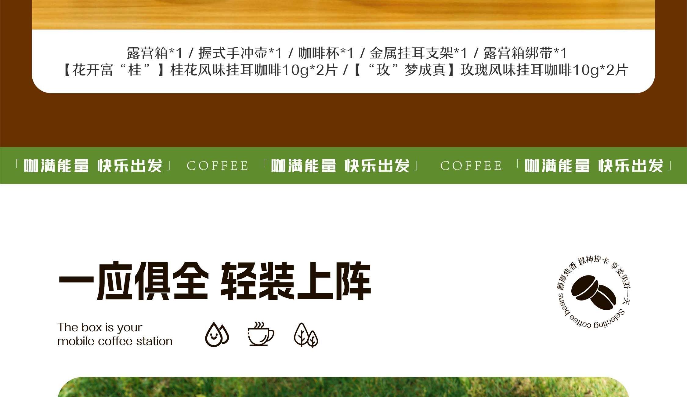 啡常野·露营咖啡礼 「咖」满能量·快乐出发 从内耗到撒野,用咖啡唤醒自由 礼盒清单 露营箱*1 握式手冲壶*1 咖啡杯*1 金属挂耳支架*1 【花开富“桂”】桂花风味挂耳咖啡10g*2片 【“玫”梦成真】玫瑰风味挂耳咖啡10g*2片 露营箱绑带*1