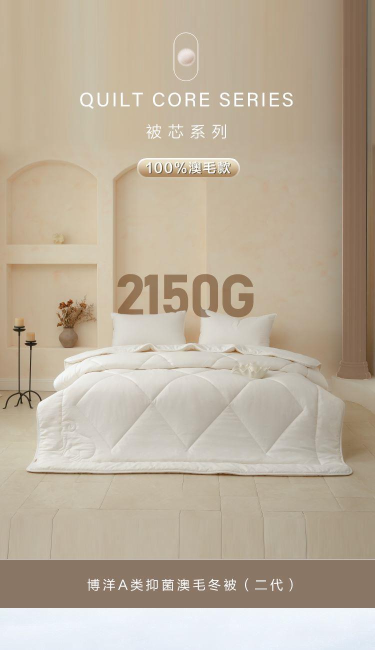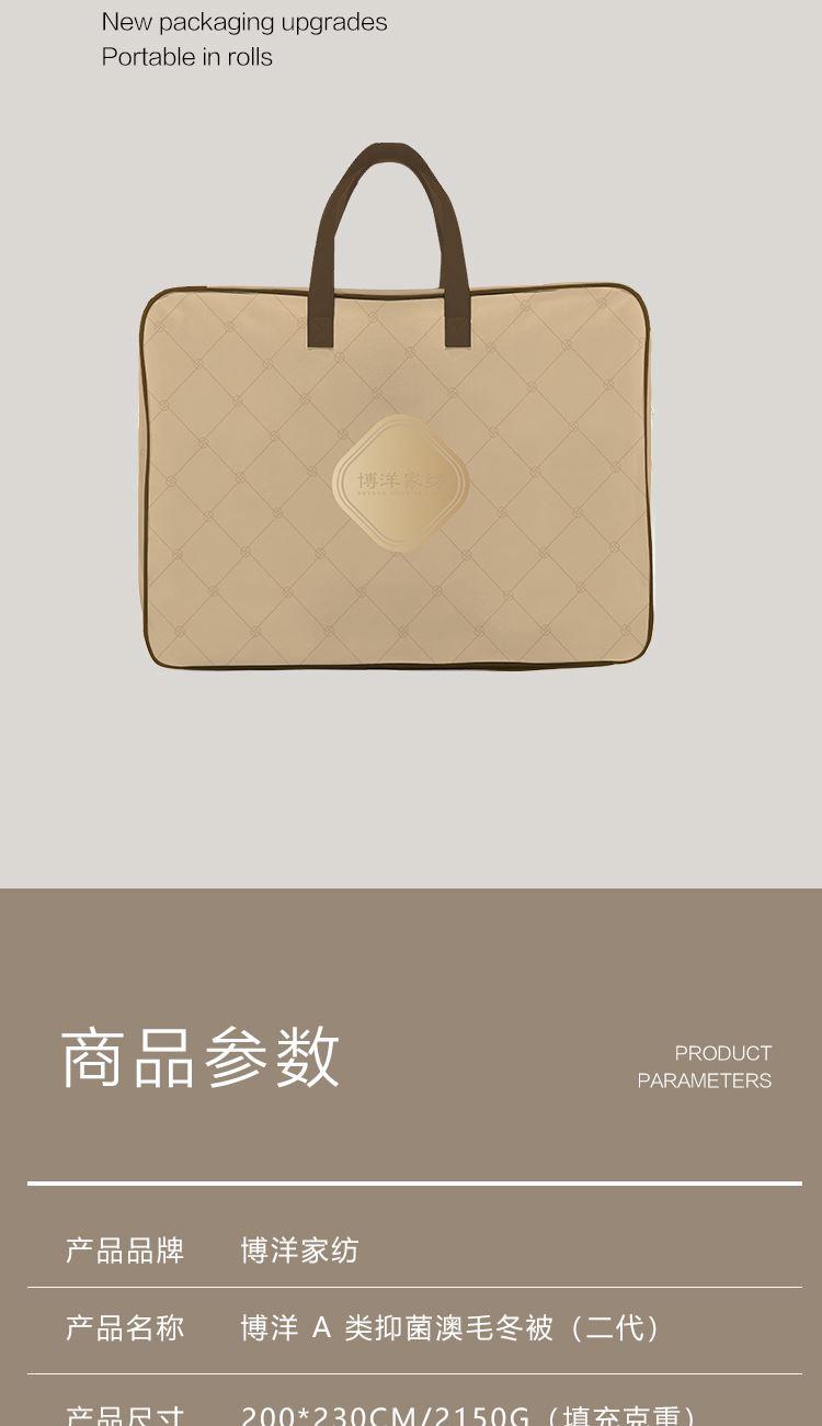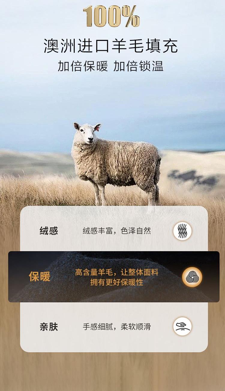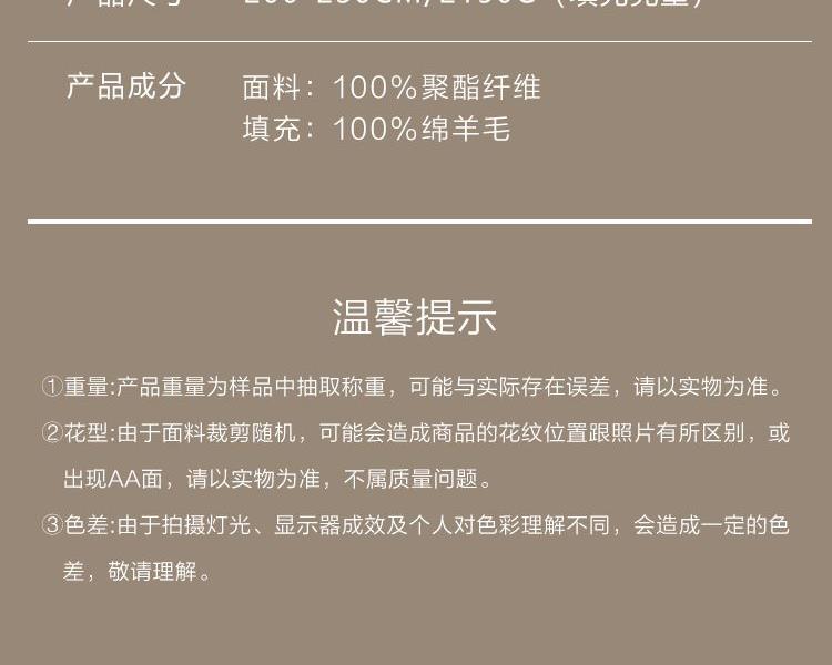 产品规格:200*230cm/2150g(填充克重) 产品材质:面料:聚酯纤维(防钻绒) 填充:绵羊毛(澳毛) 1、澳洲羊毛加厚保暖吸湿透气,绒毛蓬松柔软更舒适。聚酯纤维面料,柔软蓬松锁绒防钻。 2、洗涤除味高温等数十道工序织就健康温暖羊毛被。细腻车工走线,防止边缘脱线。