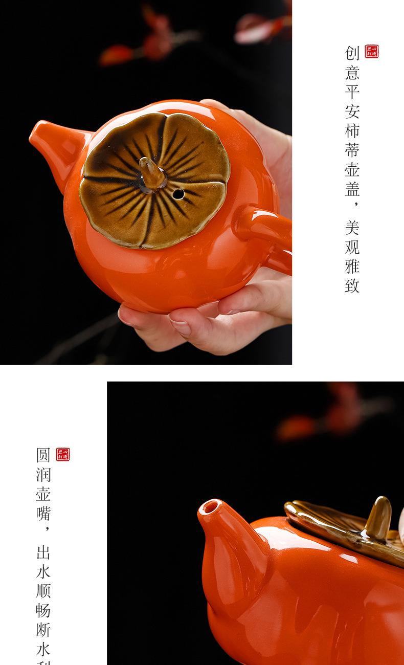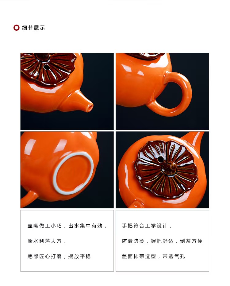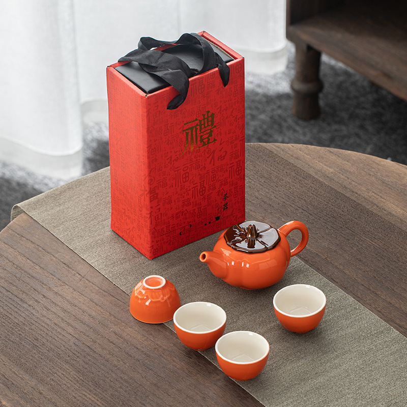 配置:1壶4杯 1彩盒 规格:壶 15*10*8cm 杯6.5*4.7cm 推荐说明:柿子造型的壶杯,象征事事如意,橘红喜庆色彩,开门红伴手礼佳选。