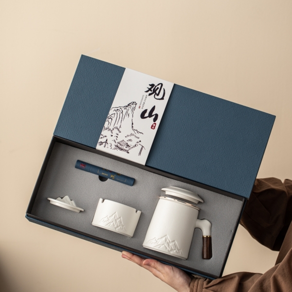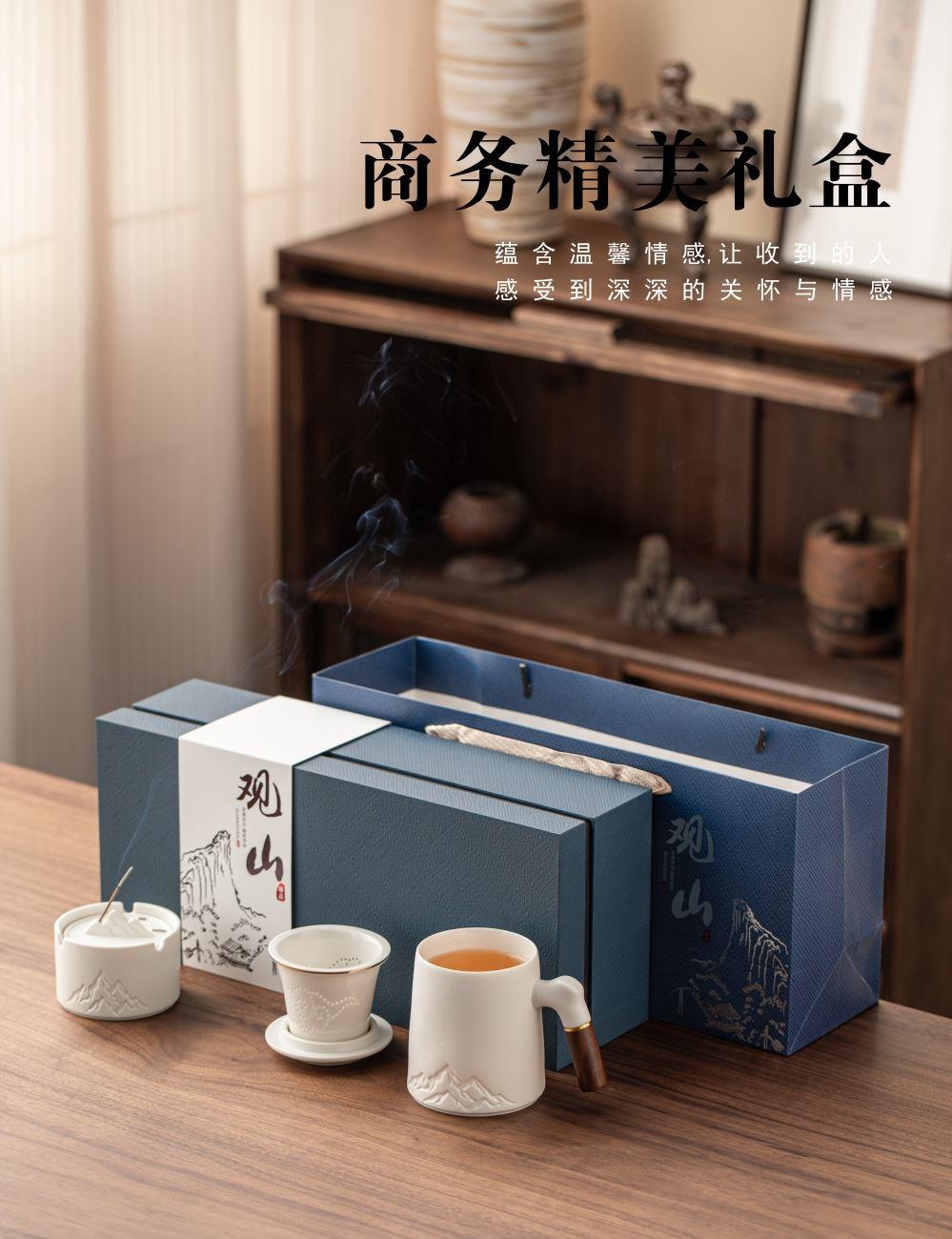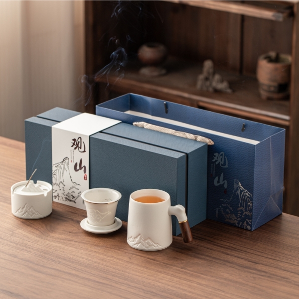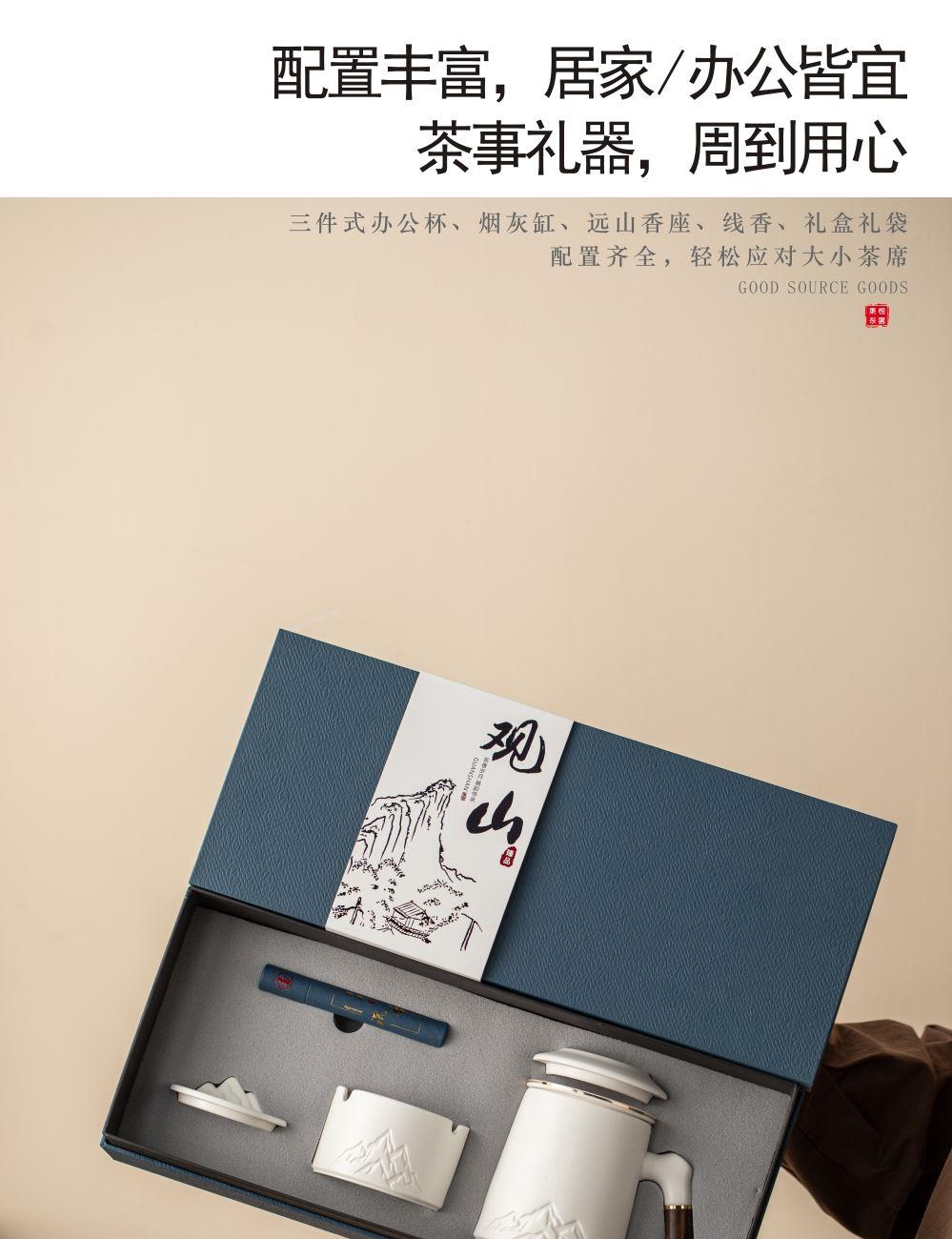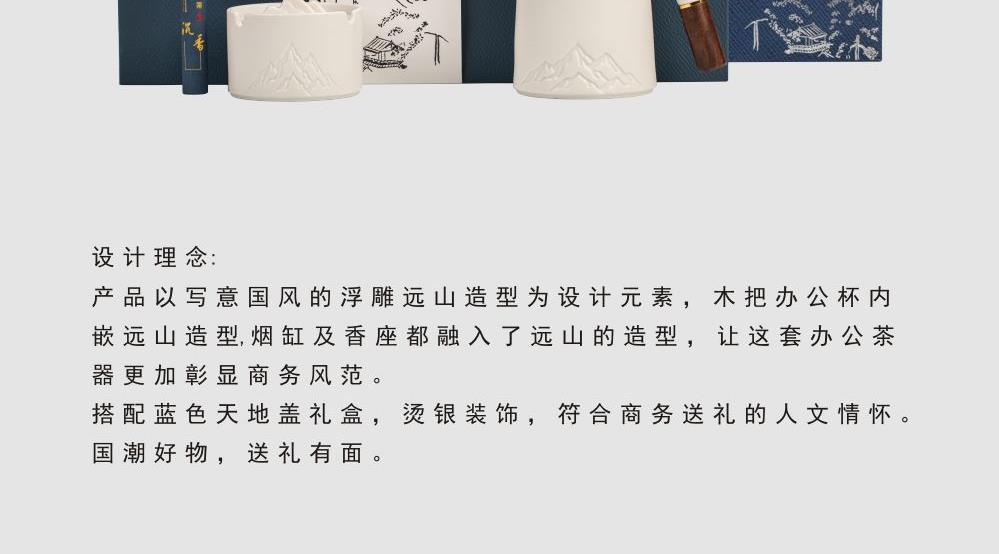 配置:办公杯x1、烟灰缸x1、线香x1、礼盒礼袋x1 规格:办公杯410ml、、烟灰缸87*57mm、香座77*25mm、线香119mm 产品以写意国风的浮雕远山造型为设计元素,木把办公杯内嵌远山造型,烟缸及香座都融入了远山的造型,让这套办公茶器更加彰显商务风范。 搭配蓝色天地盖礼盒,烫银装饰,符合商务送礼的人文情怀。 国潮好物,送礼有面。
