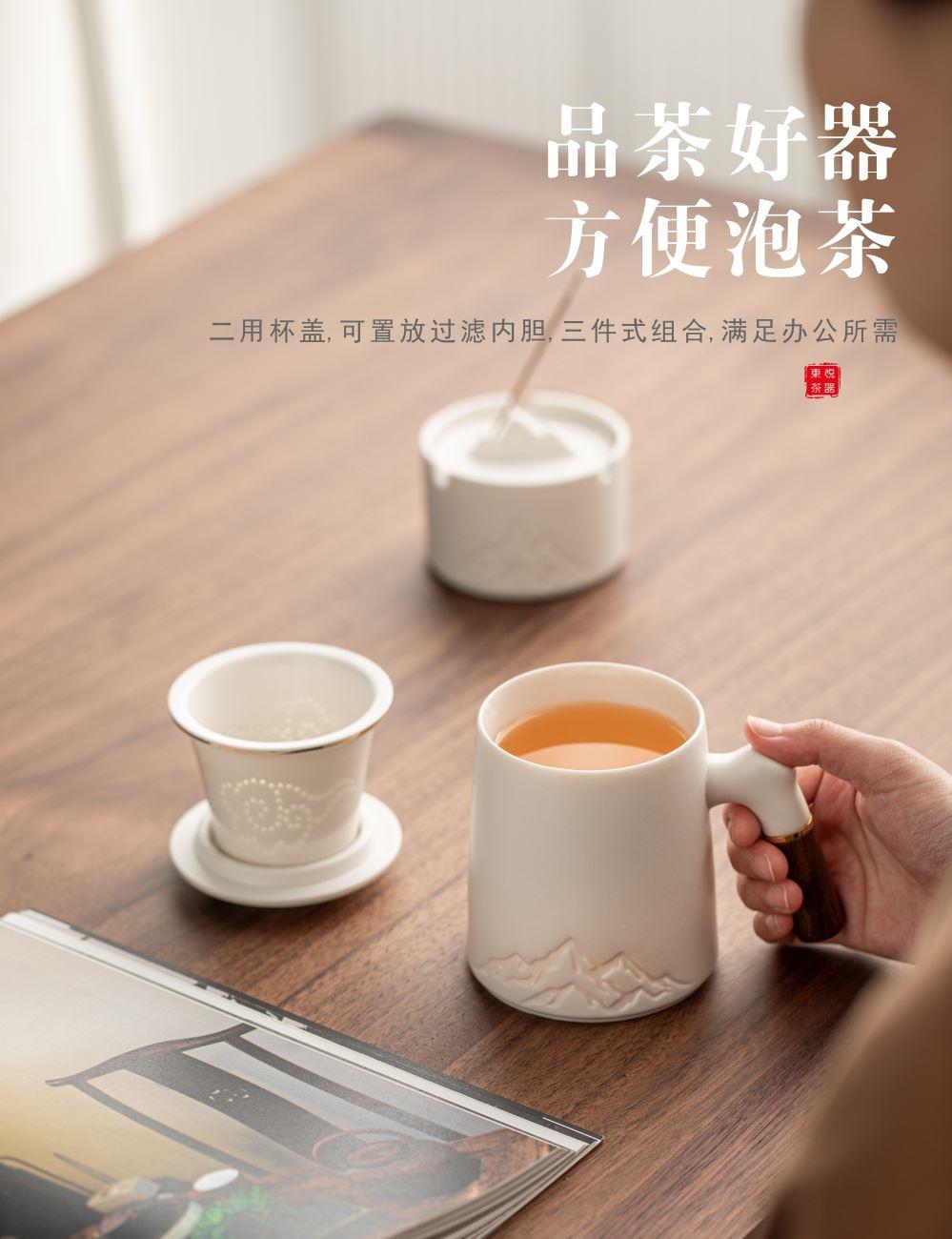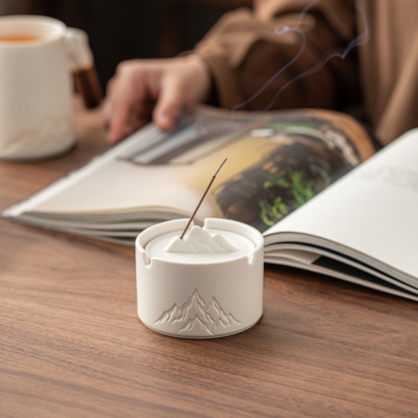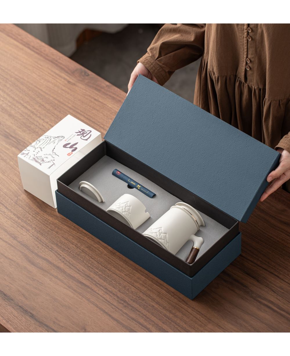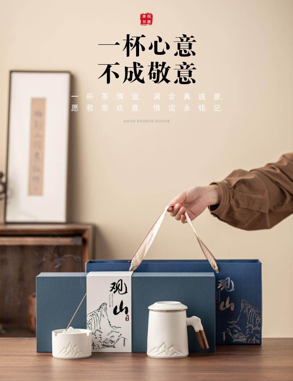 配置:办公杯x1、烟灰缸x1、线香x1、礼盒礼袋x1 规格:办公杯410ml、、烟灰缸87*57mm、香座77*25mm、线香119mm 产品以写意国风的浮雕远山造型为设计元素,木把办公杯内嵌远山造型,烟缸及香座都融入了远山的造型,让这套办公茶器更加彰显商务风范。 搭配蓝色天地盖礼盒,烫银装饰,符合商务送礼的人文情怀。 国潮好物,送礼有面。
