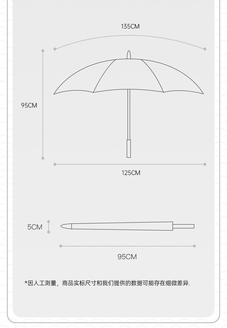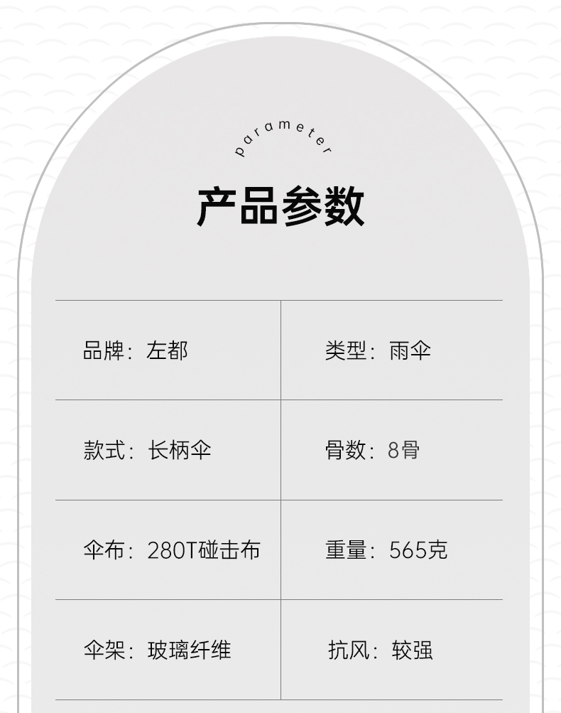 商品货号:ZD134 伞架材质:玻纤 伞面材质:300T抨击布 款式:半自动 商品参数:直径:125cm 高度:95cm 收拢直径:5cm 收拢高度:95cm 商品毛重:560克 商品颜色:ZD134-CBS-米 ZD134-CBS-黑金 ZD134-CBS-蓝 ZD134-CBS-黑银 ZD134-CBS-灰 商品包装:本布伞套