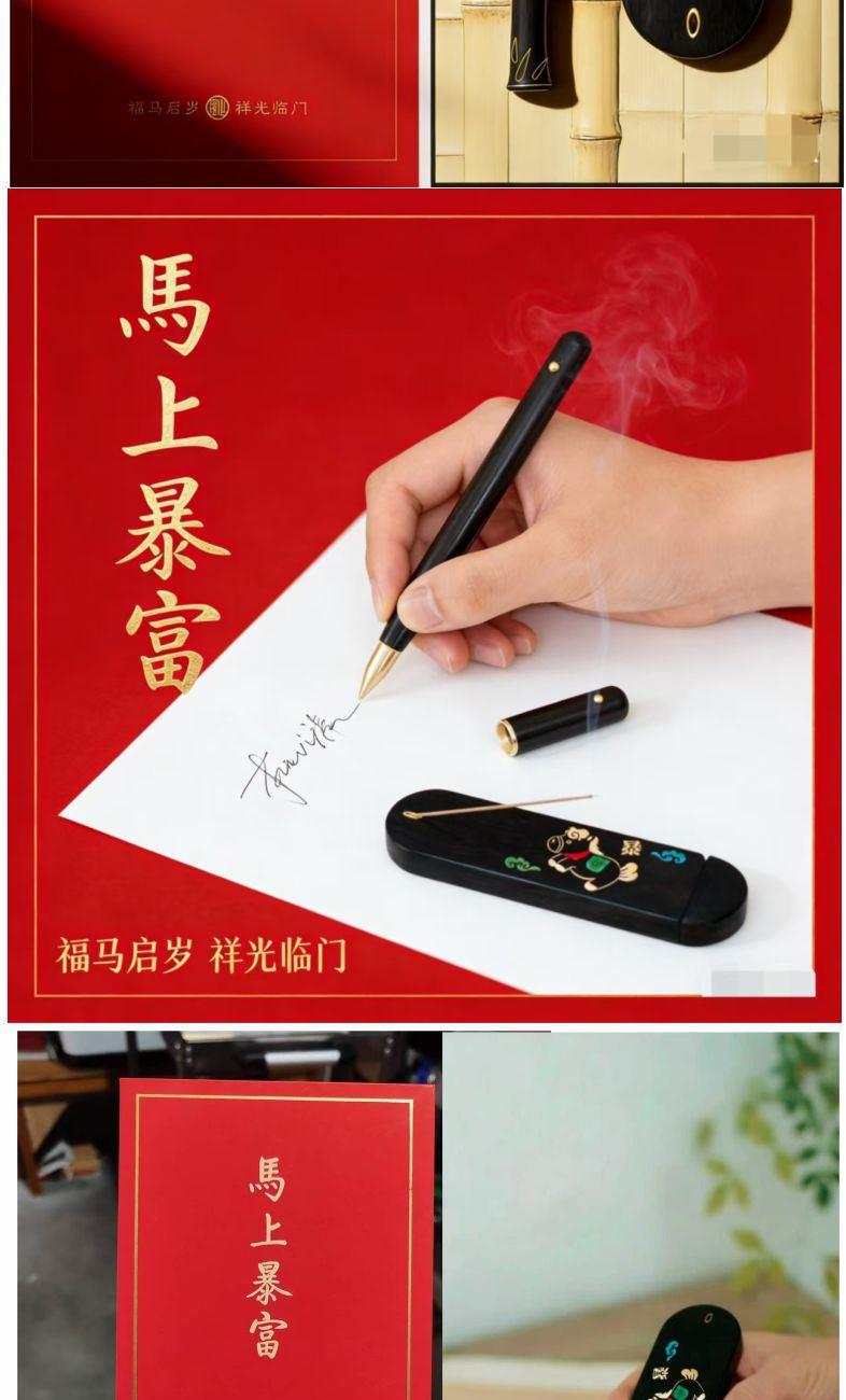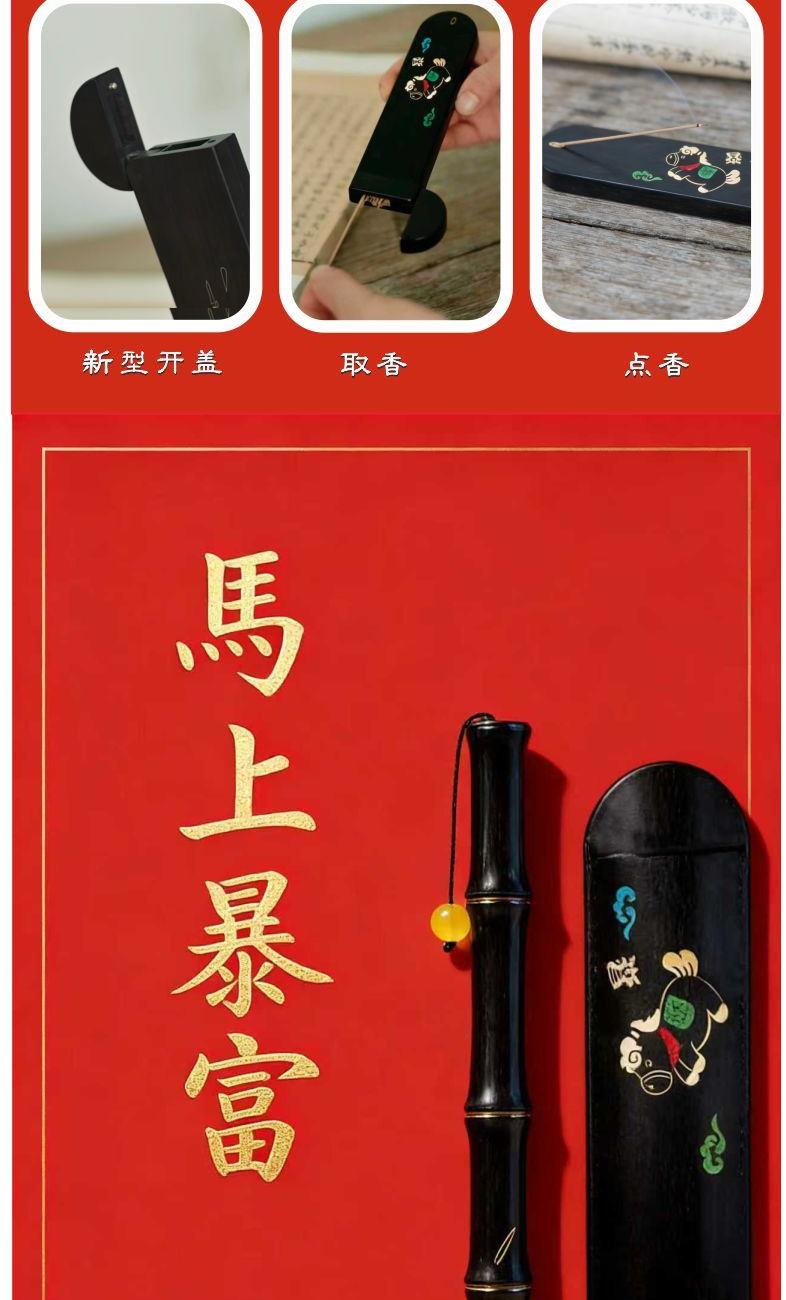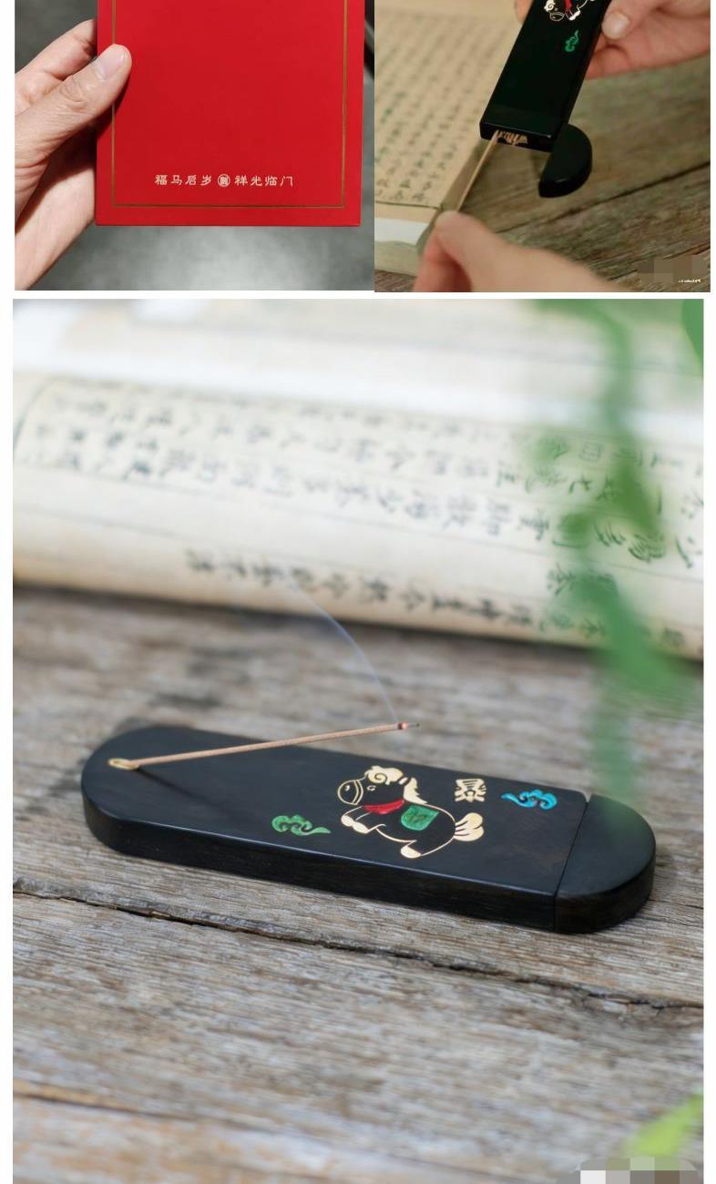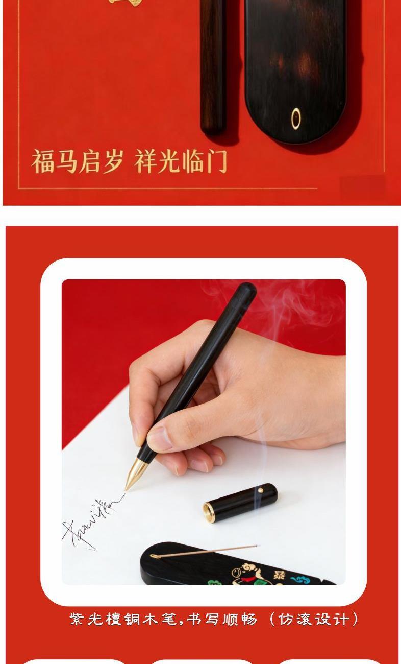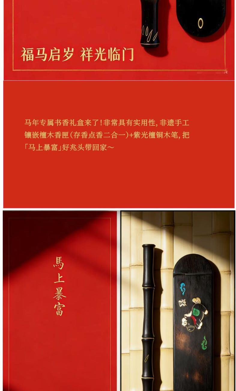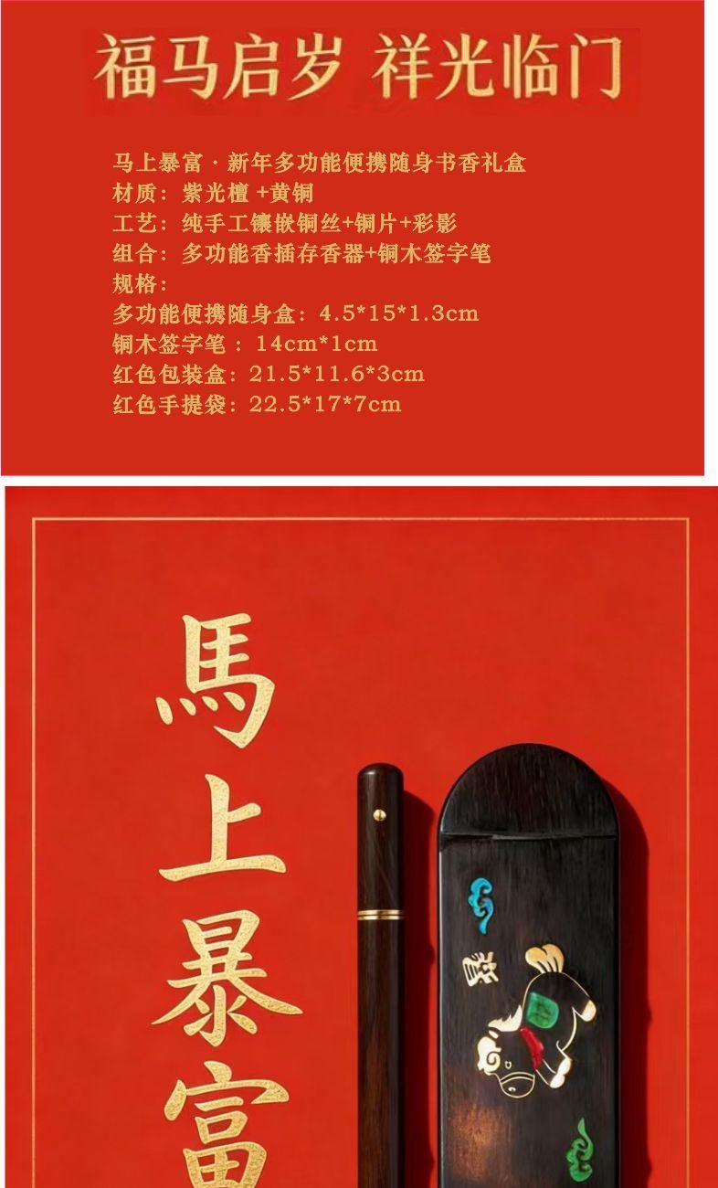 马年专属书香礼盒来了!非常具有实用性,非遗手工镶嵌檀木香匣(存香点香二合一)+紫光檀铜木笔,把「马上暴富」好兆头带回家~ 材质:紫光檀 +黄铜 工艺:纯手工镶嵌铜丝+铜片+彩影 组合:多功能香插存香器+铜木签字笔 规格: 多功能便携随身盒:4.5*15*1.3cm 铜木签字笔 :14cm*1cm 红色包装盒:21.5*11.6*3cm 红色手提袋:22.5*17*7cm