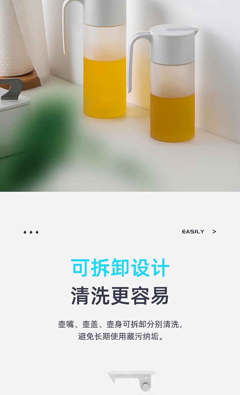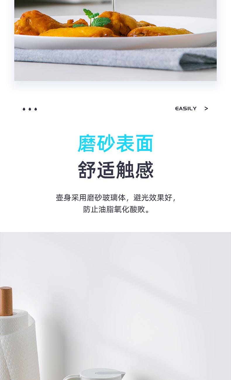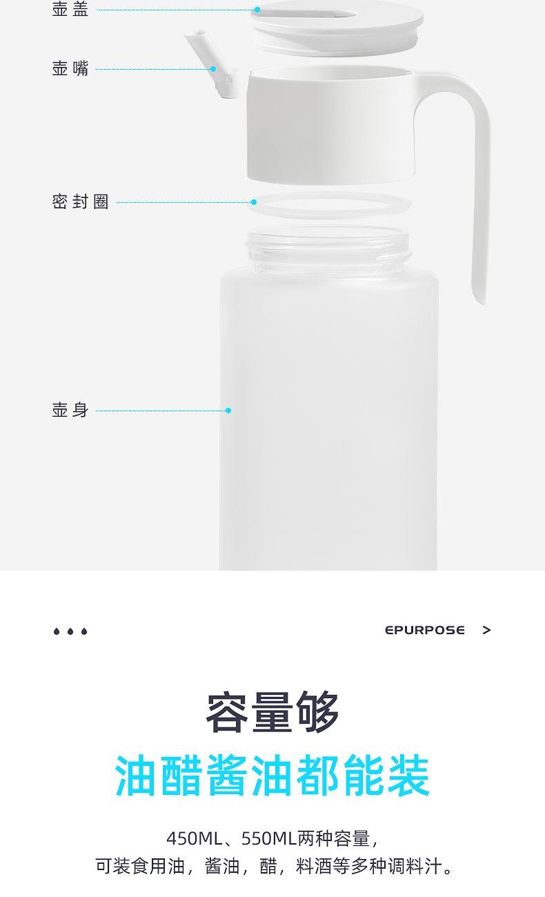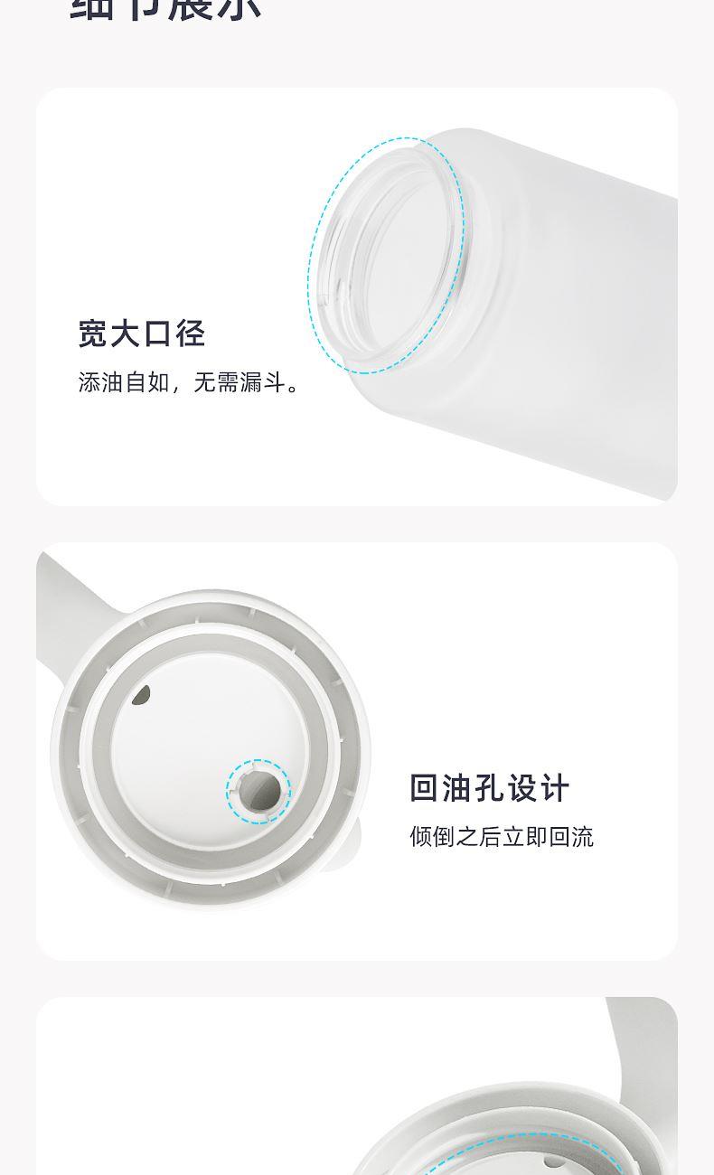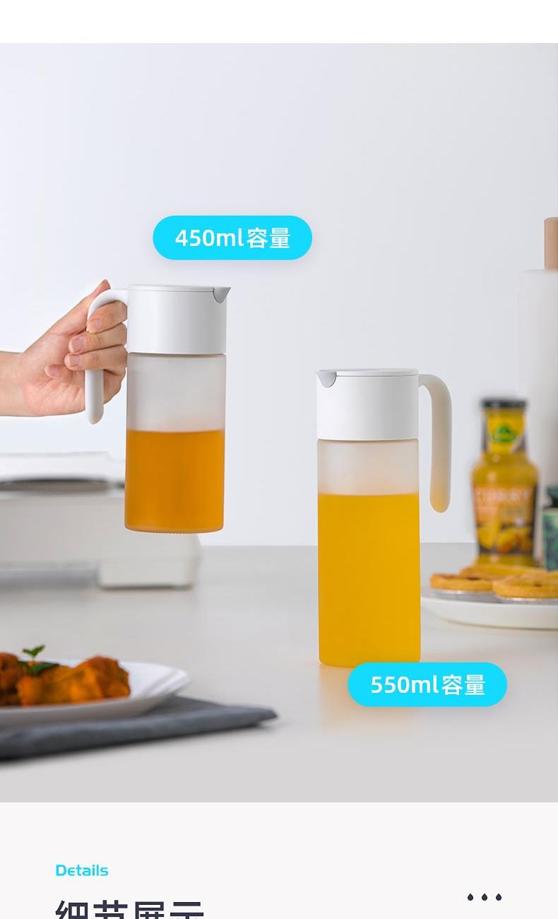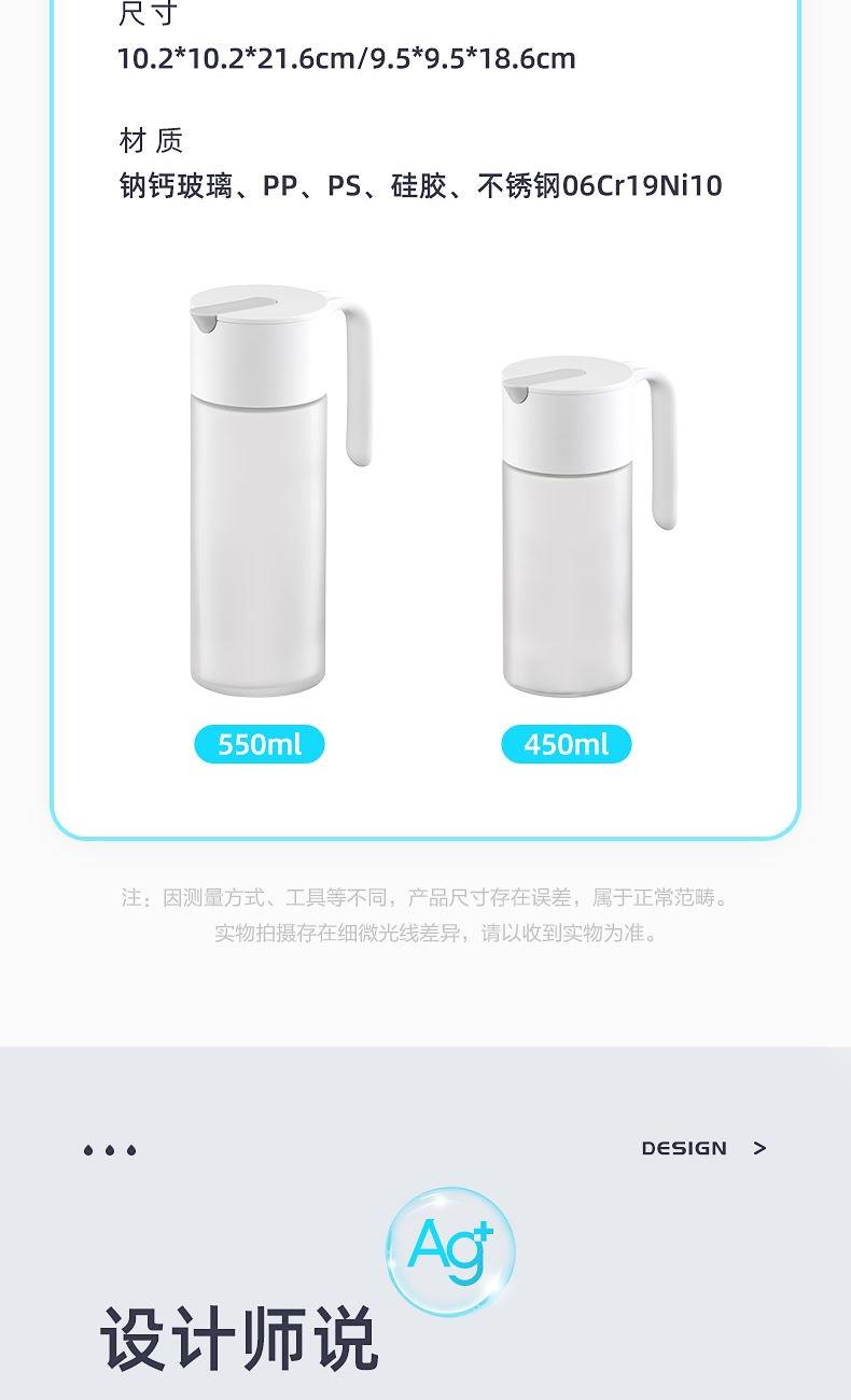 产品货号:009001 产品尺寸:10.2*10.2*21.6CM 产品容量:550ml 产品材质:soda-lime glass,PP,PS,Silicone,stainless steel 产品克重:435.5g 外箱尺寸:49.5*30*45.5CM 包装方式:1 PC/COLOR BOX 产品颜色:白色 自动开合,单手可操作 钠钙玻璃瓶身,磨砂手感工艺 鹰嘴油口,不滴不漏 硅胶密封圈,有效防漏 可拆卸设计,清洗容易