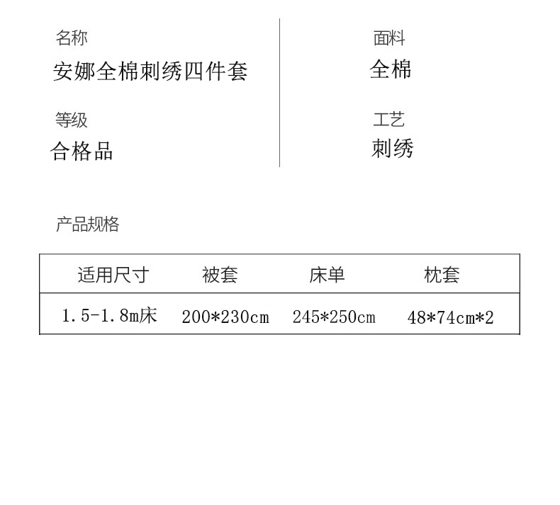 被套:200*230cm 床单:245*250cm 枕套:48*74cm*2 面料:全棉 产品包装:精美礼盒 包装尺寸:43.5*33*10cm 1.全棉面料舒适、温度平衡,接受皮肤时感到柔软而不僵硬。 2.棉纤维是天然纤维,纯棉织品与肌肤接触无任何刺激,对人体有益无害。