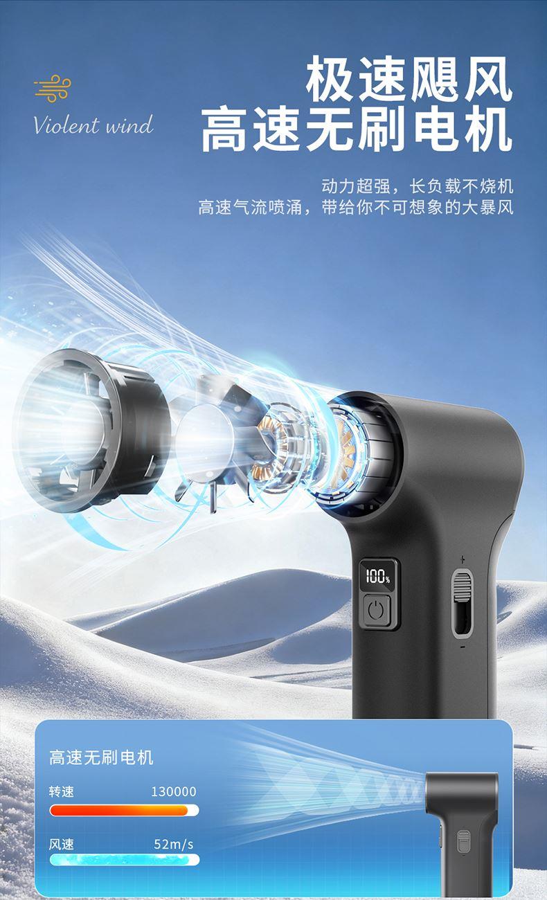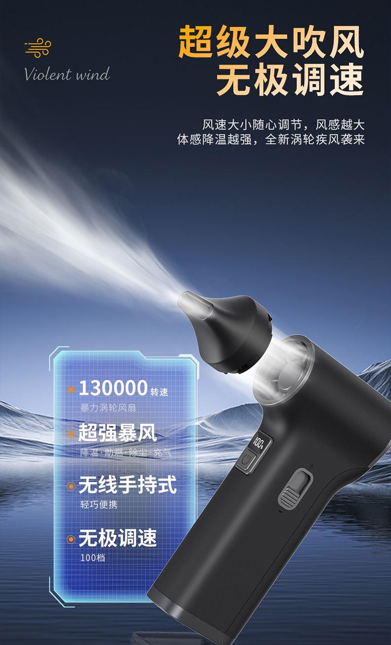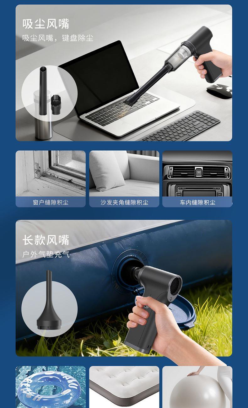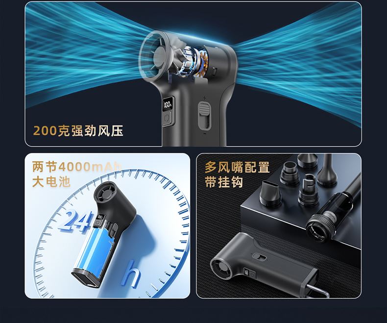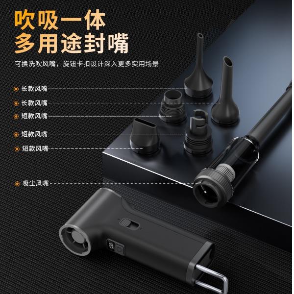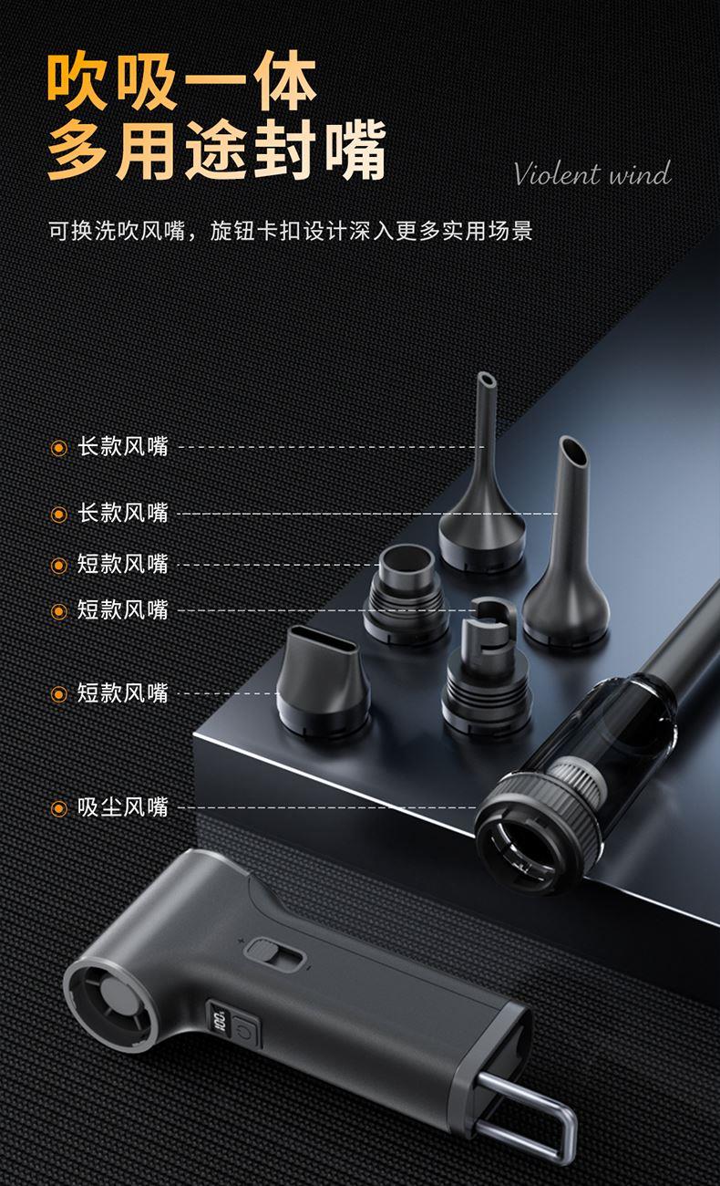 *多功能吹吸一体,200克强劲风压 *智能数显,LED辅助照明 *多风嘴配置,带挂钩,8000毫安 *手柄带磨砂半透工艺,130000转速