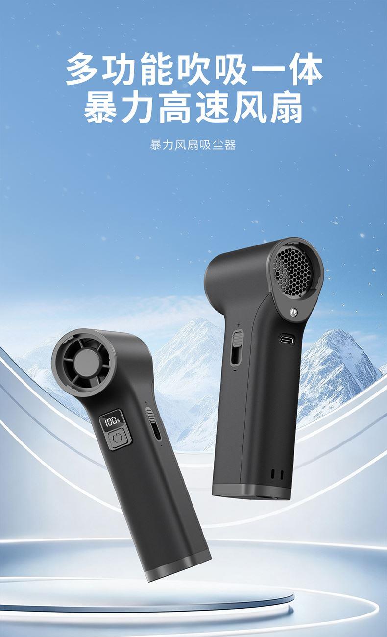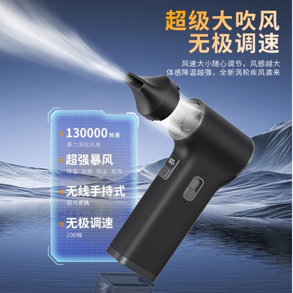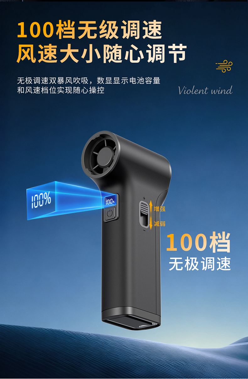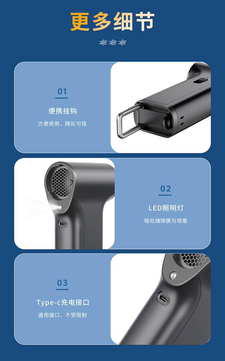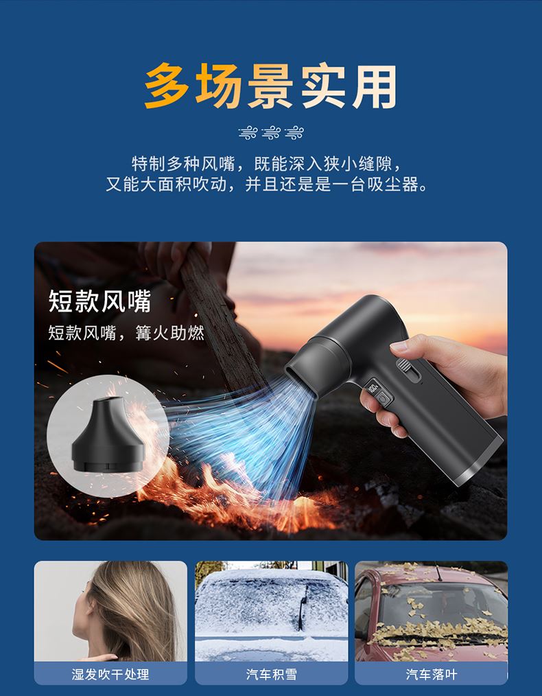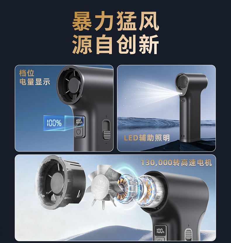 *多功能吹吸一体,200克强劲风压 *智能数显,LED辅助照明 *多风嘴配置,带挂钩,8000毫安 *手柄带磨砂半透工艺,130000转速