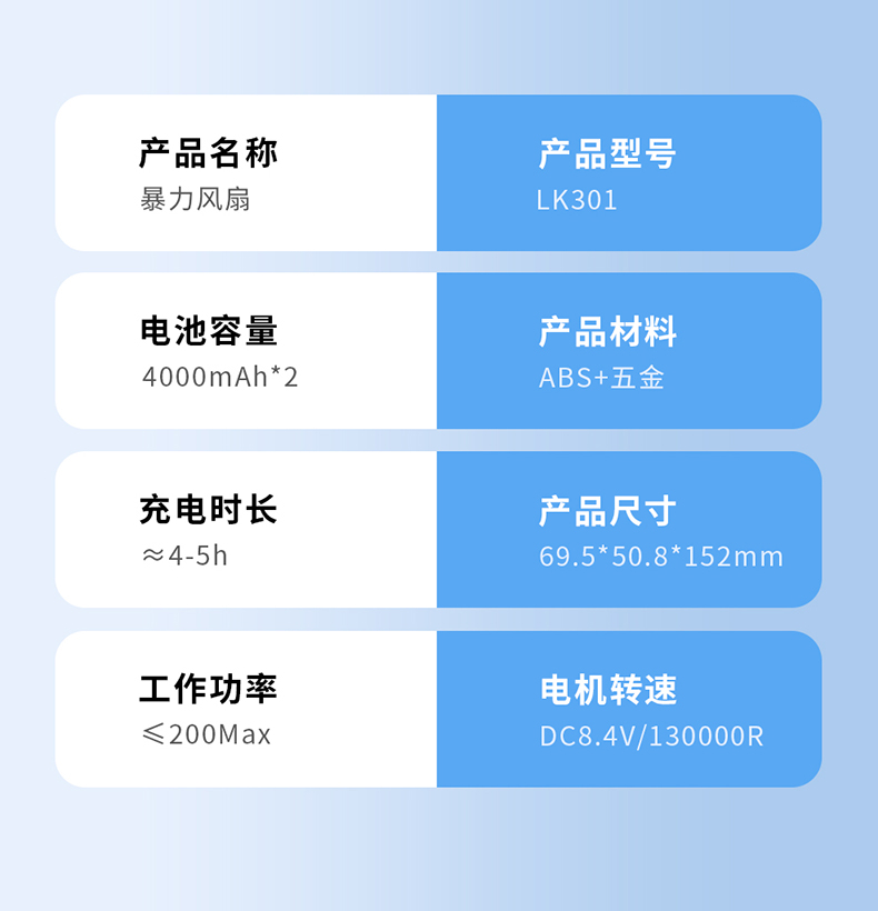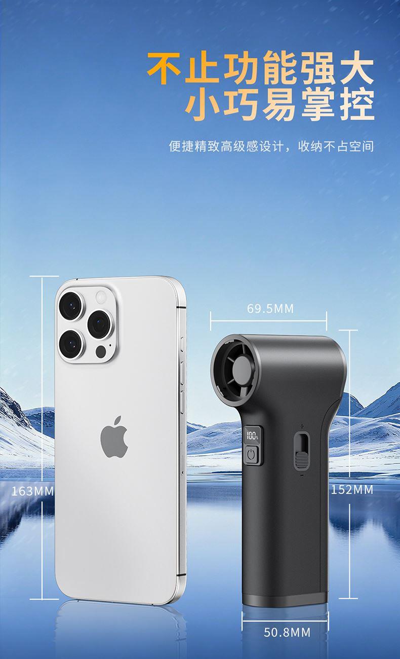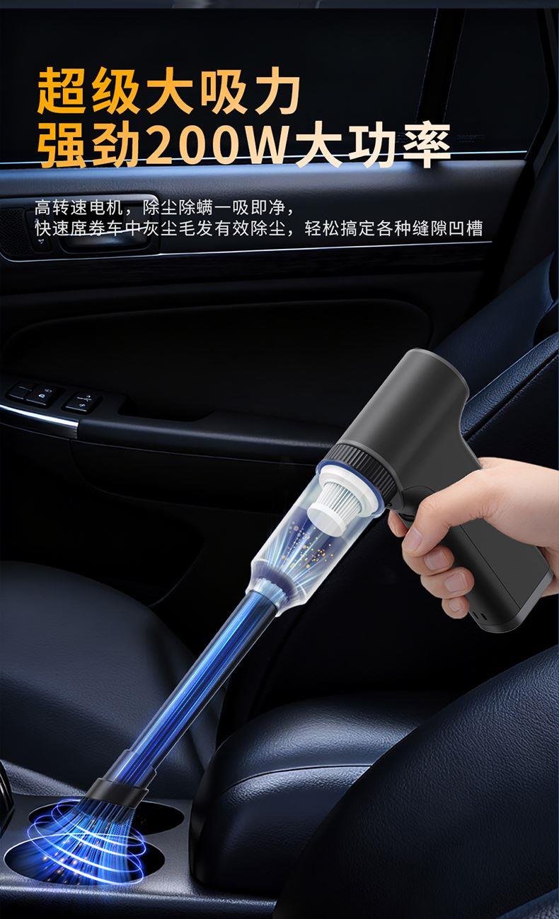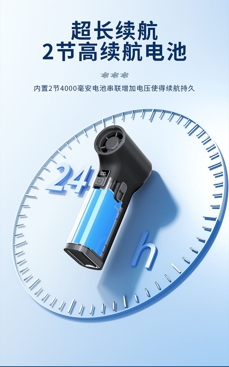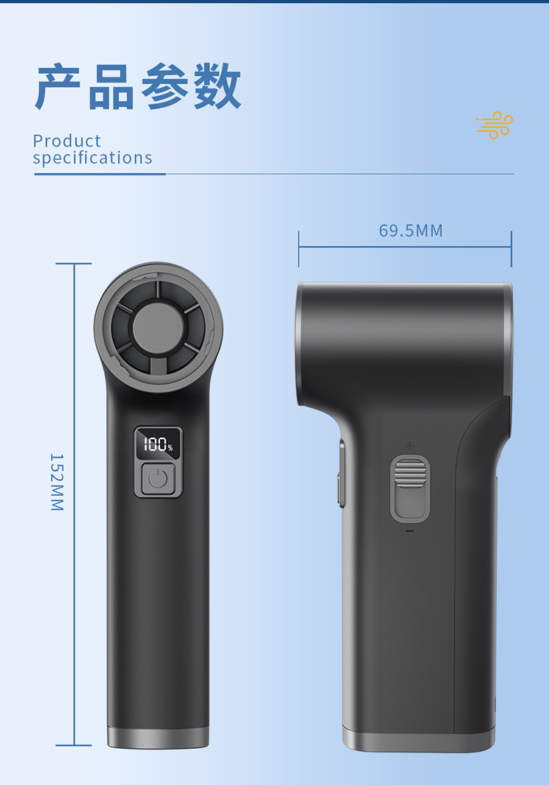 *多功能吹吸一体,200克强劲风压 *智能数显,LED辅助照明 *多风嘴配置,带挂钩,8000毫安 *手柄带磨砂半透工艺,130000转速