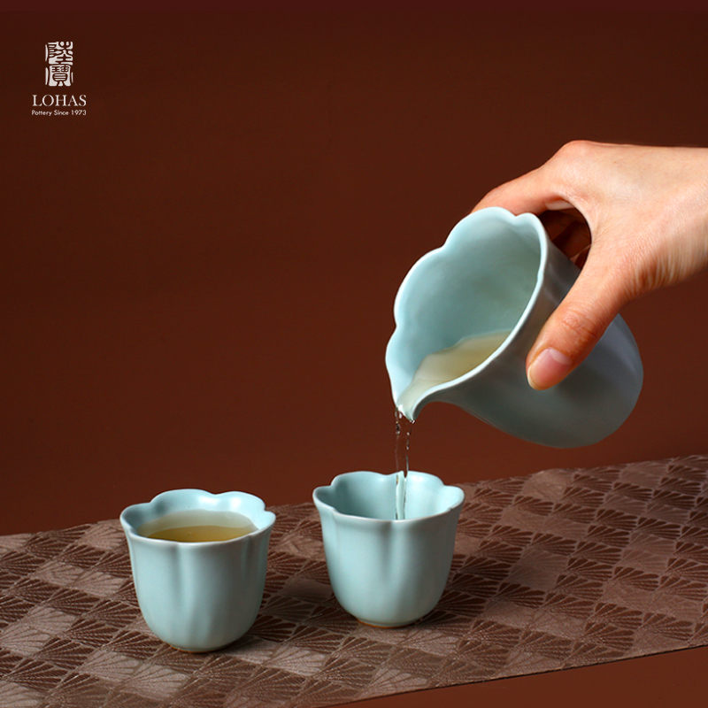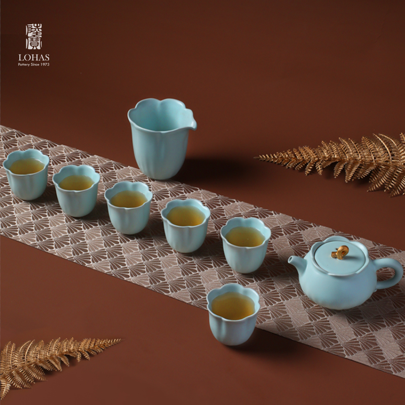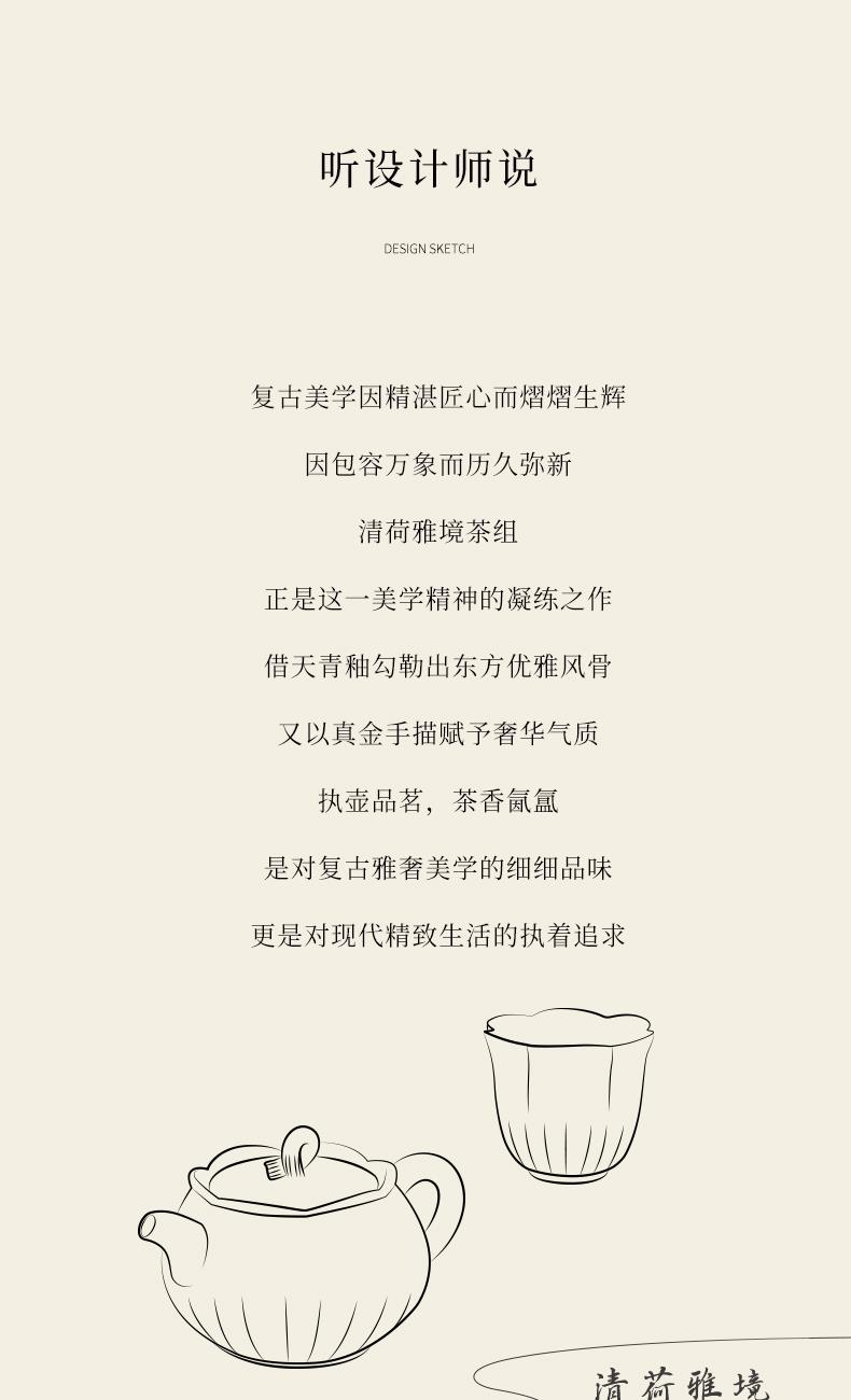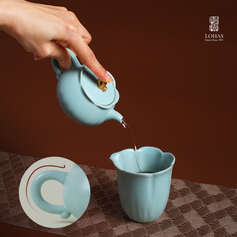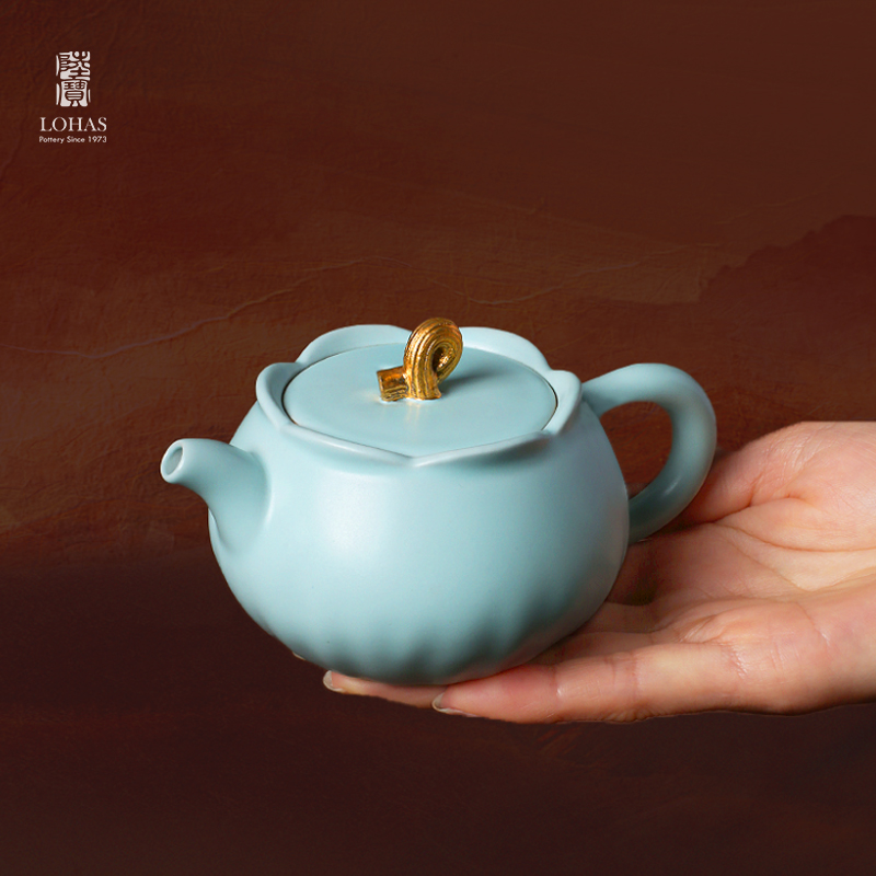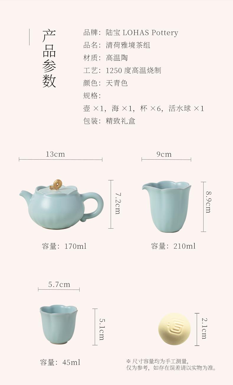 清荷雅境茶组,正是这一美学精神的凝练之作——它以荷为形,借天青釉勾勒出东方意境的优雅风骨,又以真金手描点缀,赋予其奢华内敛的气质。执壶品茗,茶香氤氲,是对复古雅奢美学的细细品味,更是对现代精致生活的执着追求。 规格:壶×1,海×1,杯×6,活水球×1 颜色:天青色 容量:壶170ml